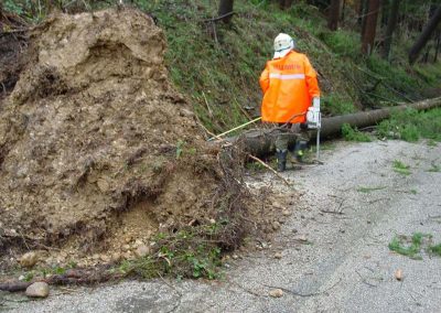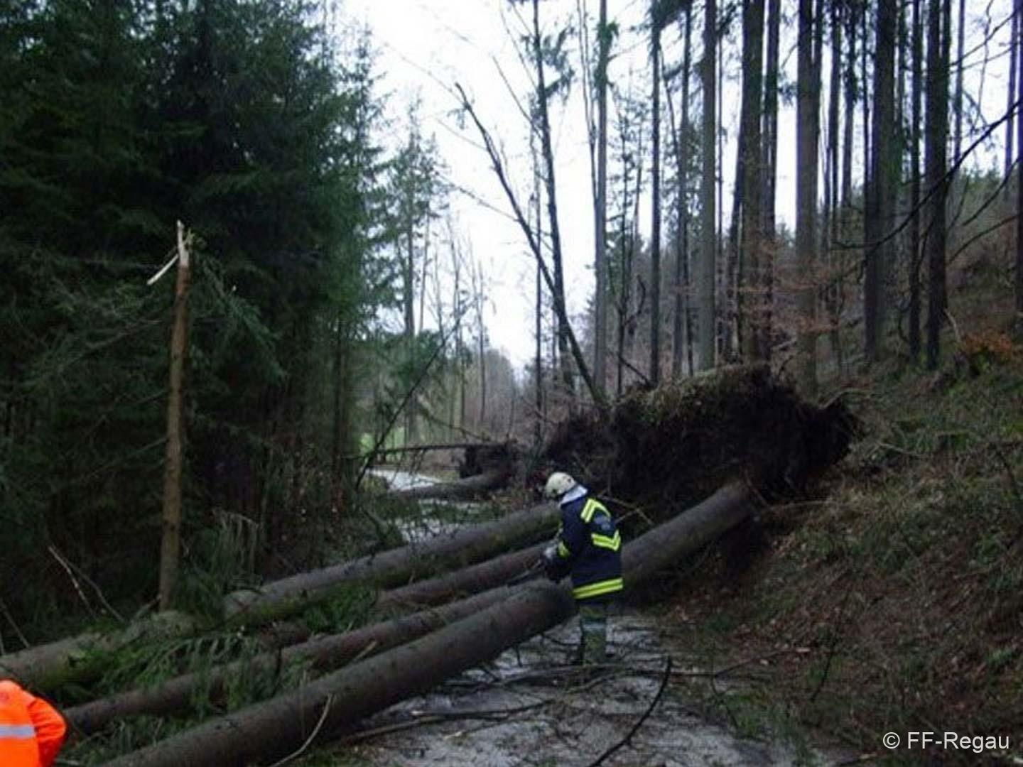 Gegen 10:30 Uhr ging es los, da kamen die ersten Meldungen von umgestürzten Bäumen. Wir rückten daraufhin gleich aus, um die Verkehrswege wieder freizumachen. Nach und nach erreichten uns weitere Hilferufe. Beschädigungen an Dächern notdürftig zu reparieren oder abzudecken waren unsere Hauptaufgaben. Aber auch das Freimachen der Verkehrswege forderte uns. Vor allem die Strasse nach Zaissing war durch zahlreich umgestürzte Bäume blockiert. Bei all diesen Arbeiten wurden wir auch tatkräftig durch die Mitarbeiter des Bauhofes unterstützt.
