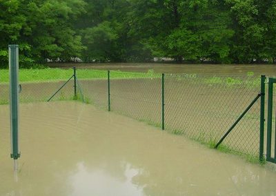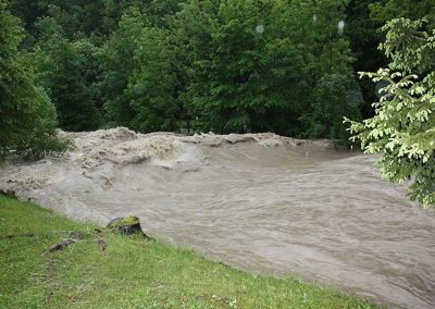 Nach Mittag verlagerte sicher der Einsatzschwerpunkt in Richtung Schalchham. Die Ager, zum reißenden Fluss geworden, trat über das Ufer und bedrohte die Häuser in der Schallermühle, der Bach- und der Teichgasse. In der Bachgasse stand das Wasser mehr als einen Meter hoch. Hier waren umfangreiche Sicherungsmaßnahmen durchzuführen, mehrere Bürgerinnen und Bürger mussten evakuiert werden. Um den gewaltigen Arbeitsaufwand zu bewältigen, wurden die Feuerwehr Rutzenmoos und die Mitarbeiter des Bauhofes Regau zu Hilfe gerufen. Im Feuerwehrhaus wurden mehr als 1.500 Sandsäcke gefüllt und mit unseren Einsatzfahrzeugen sowie mit Traktoren unserer Kameraden zu den Einsatzorten gebracht. Die Bevölkerung der Schallermühle half tatkräftig beim Auslegen der Sandsäcke mit.