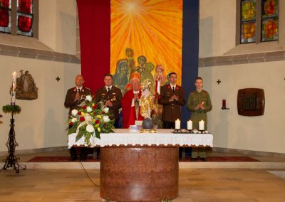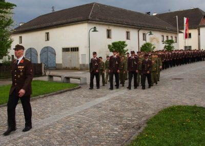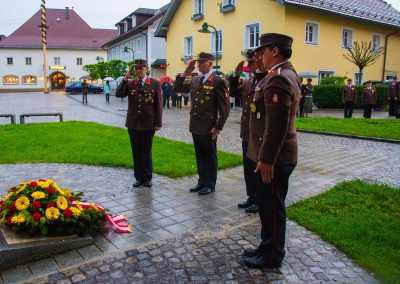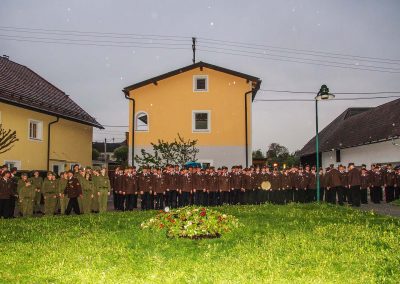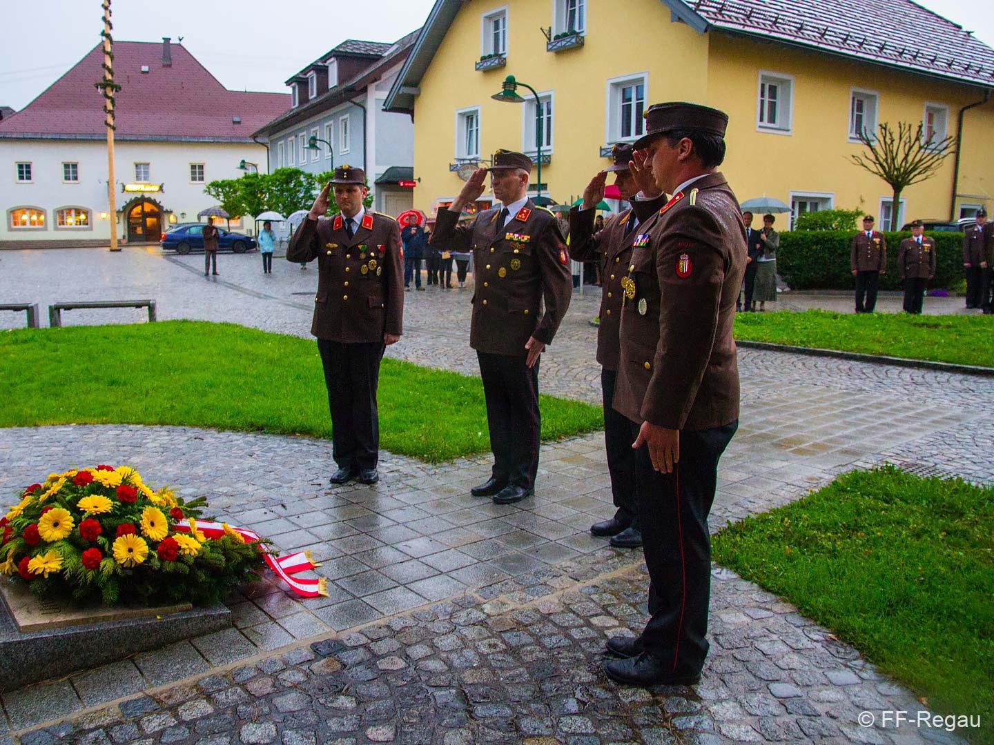 Für die feierliche Umrahmung sorgte in bewährter Weise die Bürgerkorpskapelle Regau. Nach der Heiligen Messe, zelebriert von KR Pfarrer Franz Hörtenhuber, wurde, dem Wetter zum Trotz, noch die Kranzniederlegung und Defilierung durchgeführt.