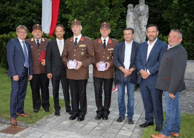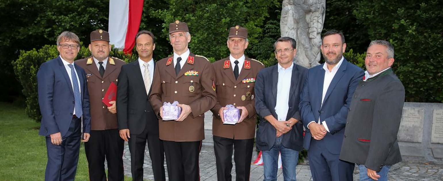 In Würdigung ihrer hervorragenden Leistungen im Interesse des Feuerwehrwesens überreichte Alois Lasinger das Verdienstzeichen 3. Stufe des österreichischen Bundesfeuerwehrverbandes an Ehren-Oberbrandinspektor Gerhard Staudinger und das Verdienstzeichen 2. Stufe des österreichischen Bundesfeuerwehrverbandes an Ehren-HBI Josef Riedl und dankte ihnen seitens des Feuerwehrverbandes.