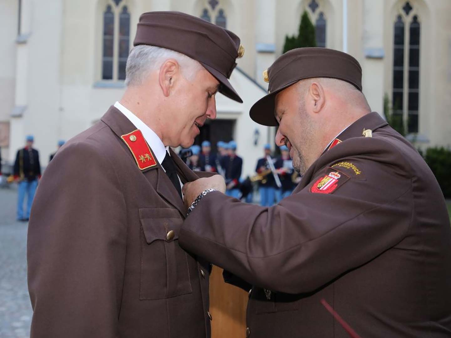 Die Bürgerkorpskapelle Regau dankte ebenfalls den scheidenden Kommandanten für die stets vorbildliche Zusammenarbeit und überreicht beiden die Ehrennadel des Blasmusikverbandes.