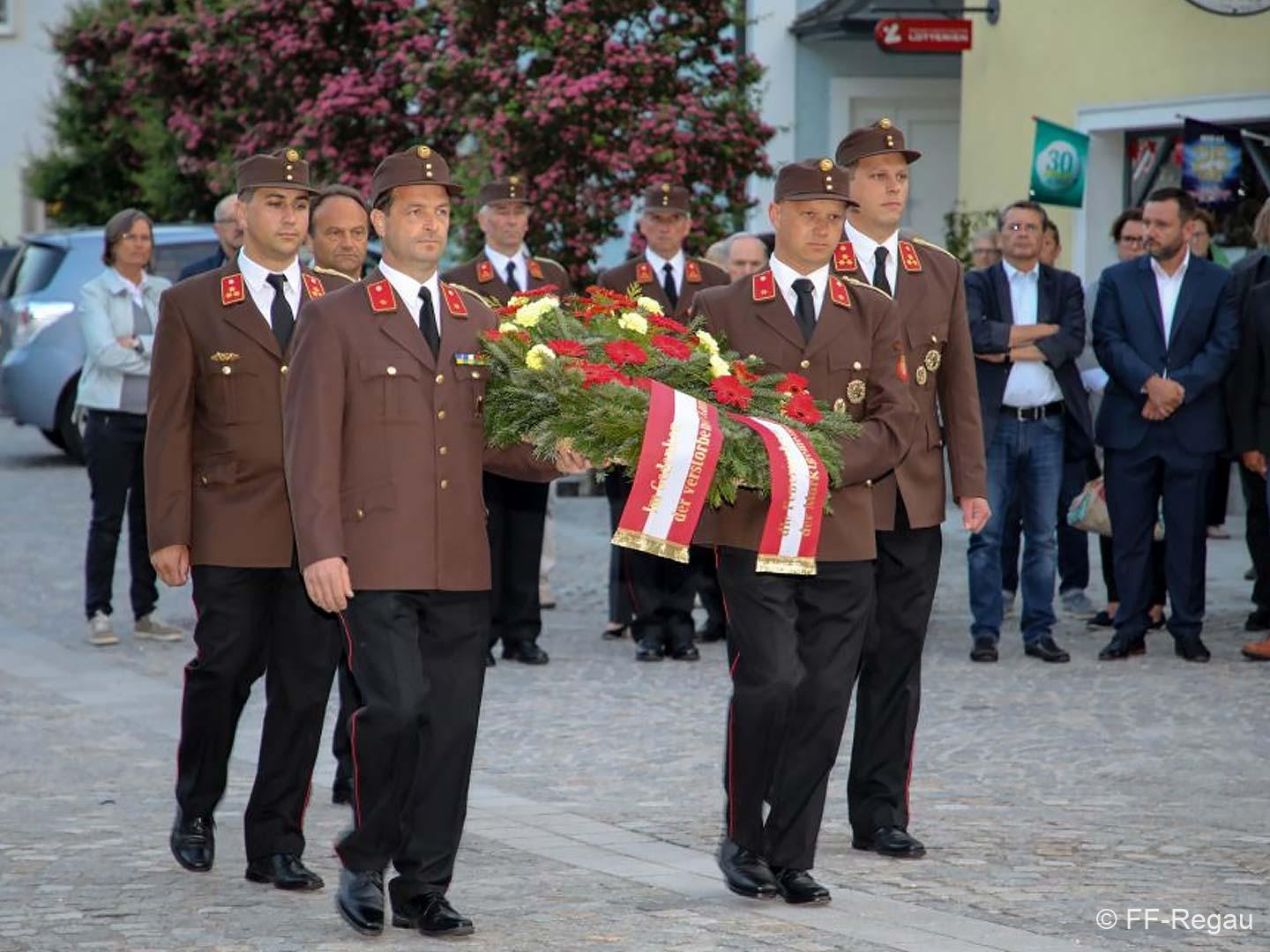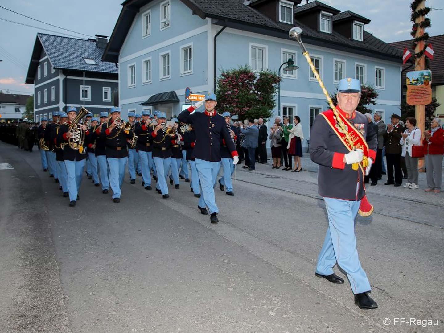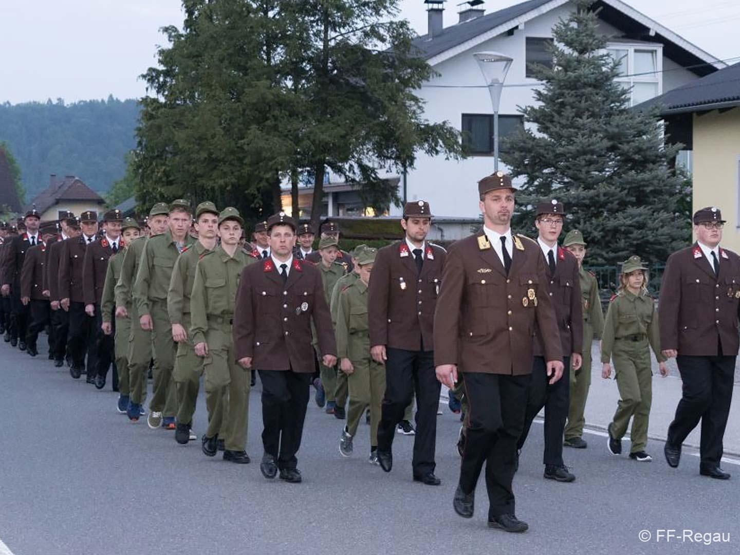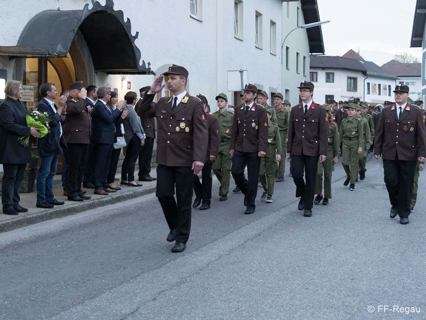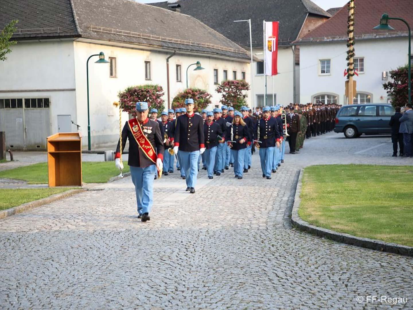 Die Uniformierten sind beim FW-Haus der FF Regau angetreten und nach der Standesmeldung an Bürgermeister Peter Harringer und der Flaggenhissung marschierten sie zu den Klängen der Bürgerkorpskapelle Regau zur Pfarrkirche Regau.
