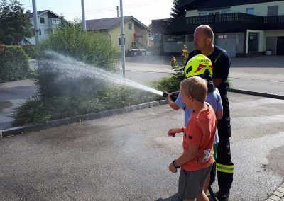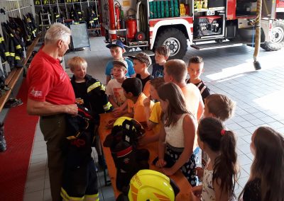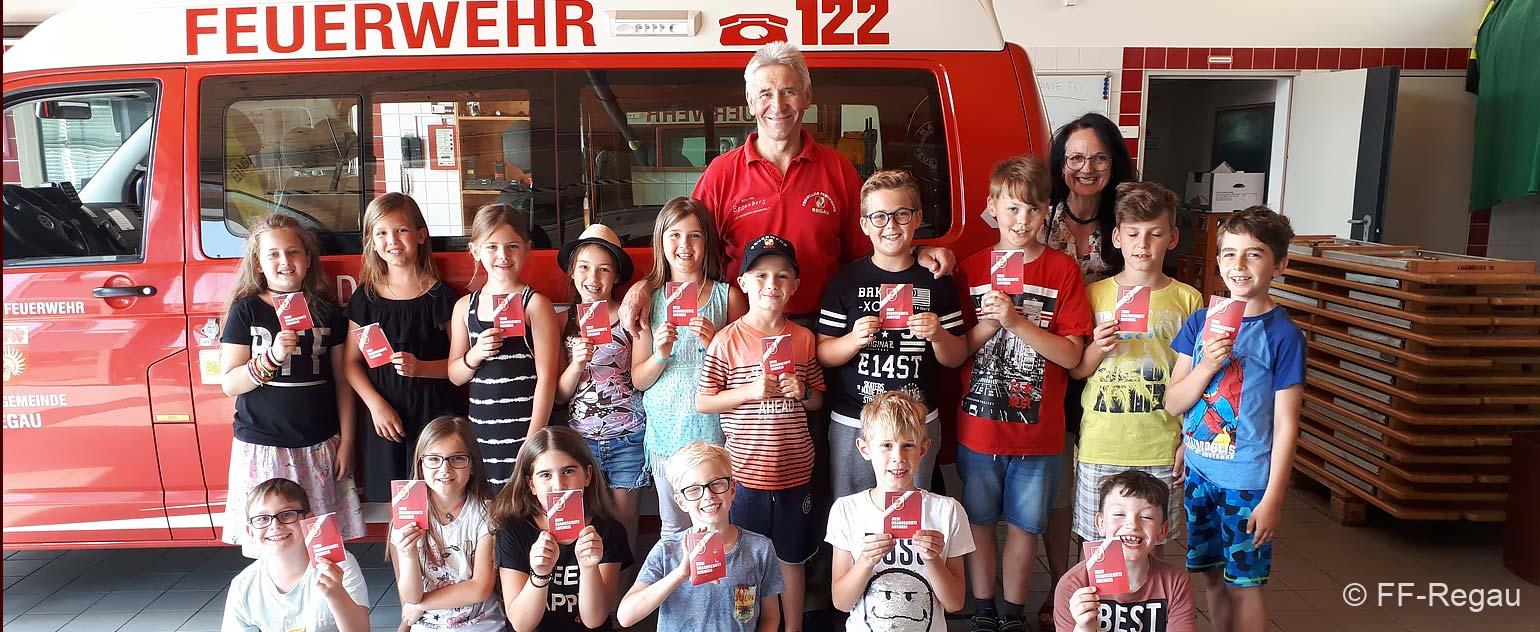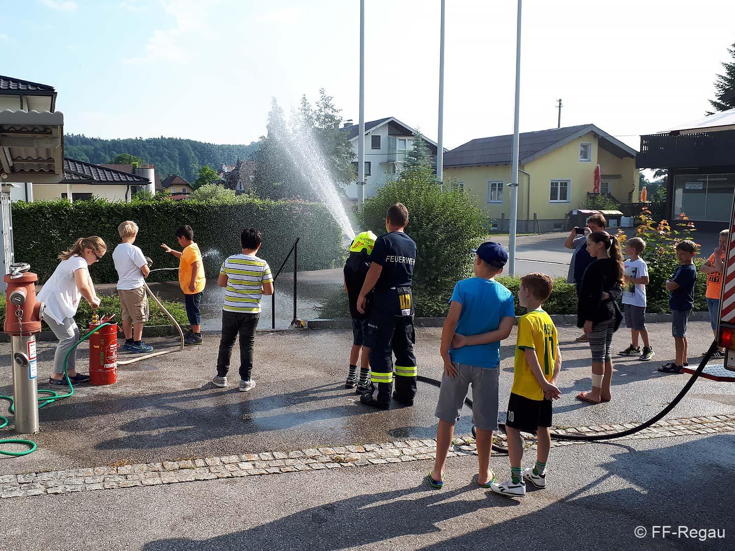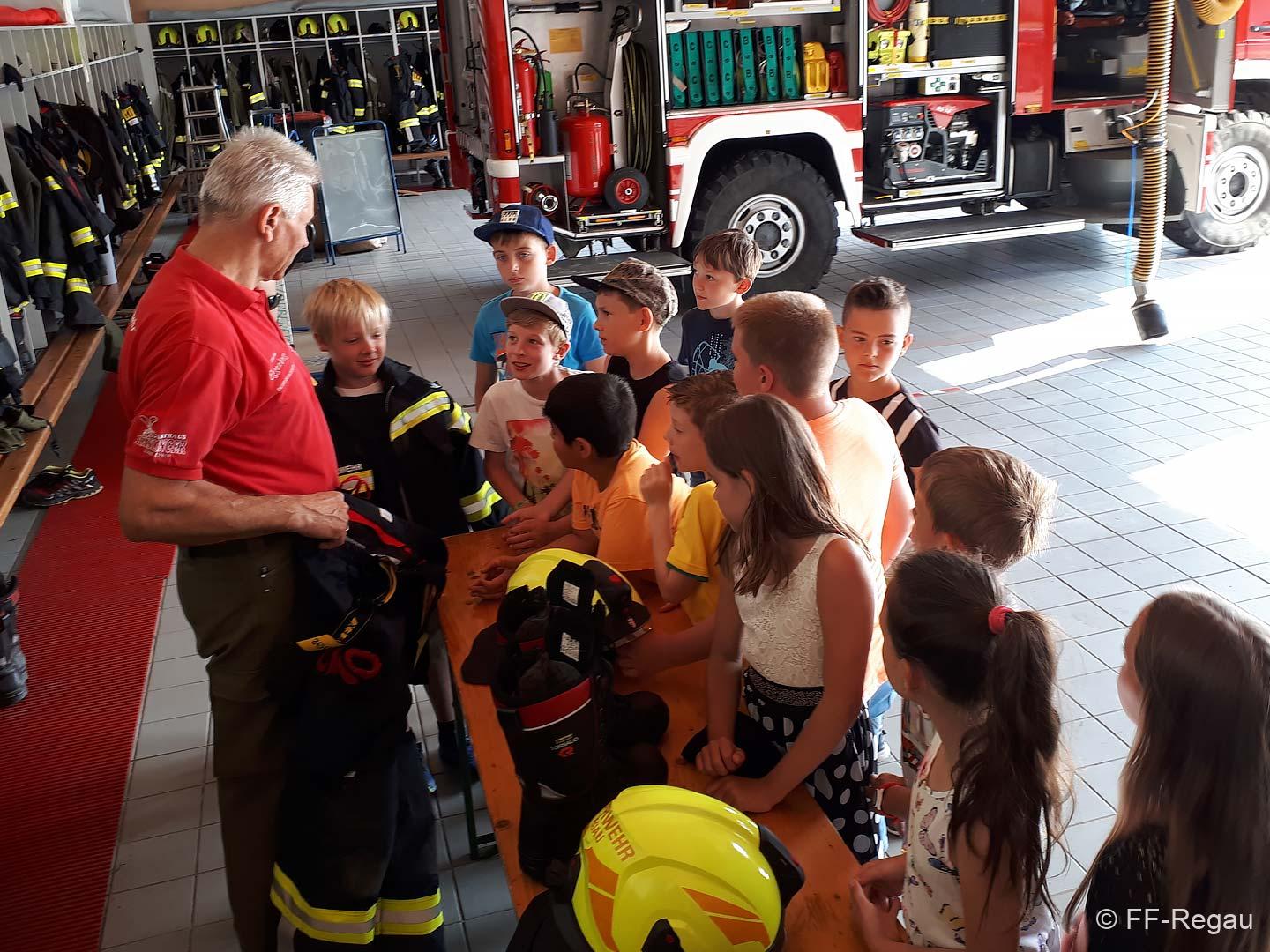 Die 3, Klassen der Volksschule Regau haben uns am 5. Juni besucht. Kommandant Christoph Staudinger freute sich, die Kinder im Feuerwehrhaus begrüßen zu dürfen. Alles rund um das Feuerwehrwesen begeisterte die Kinder. Zu Beginn gab’s ein Video über die richtige Alarmierung und dann wurden die Gerätschaften gezeigt. Groß war dann der Eifer natürlich als die Kinder selber Hand anlegten und das Strahlrohr bedienen durften. Dazu musste ein „echter“ Feuerwehrhelm getragen werden, eh klar. Natürlich war die abschließende Fahrt mit dem Feuerwehrauto wieder der absolute Höhepunkt..