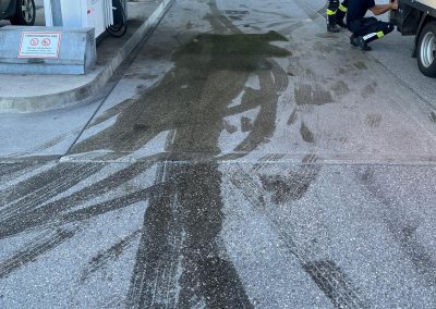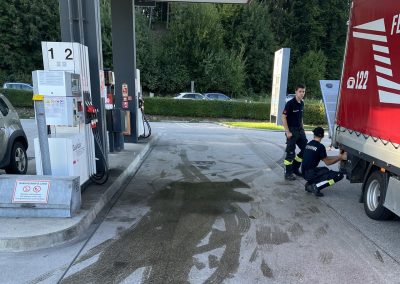 Erneut wurden wir zu einem großen Austritt von Treibstoff bei der Tankstelle in der Nähe des Lebensmitteldiskonters alarmiert. Wieder war vor der Tankstelle eine größere Menge an Treibstoff ausgetreten. Mittels Bindemittel und Bioversal wurde der Treibstoff gebunden und somit ein Eintritt in die Kanalisation verhindert.