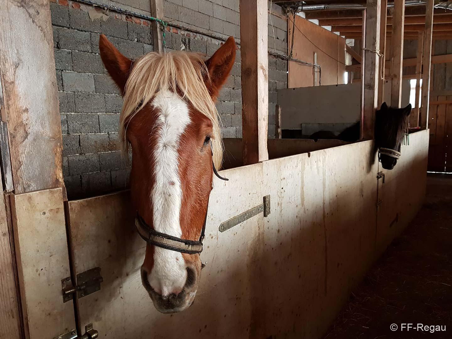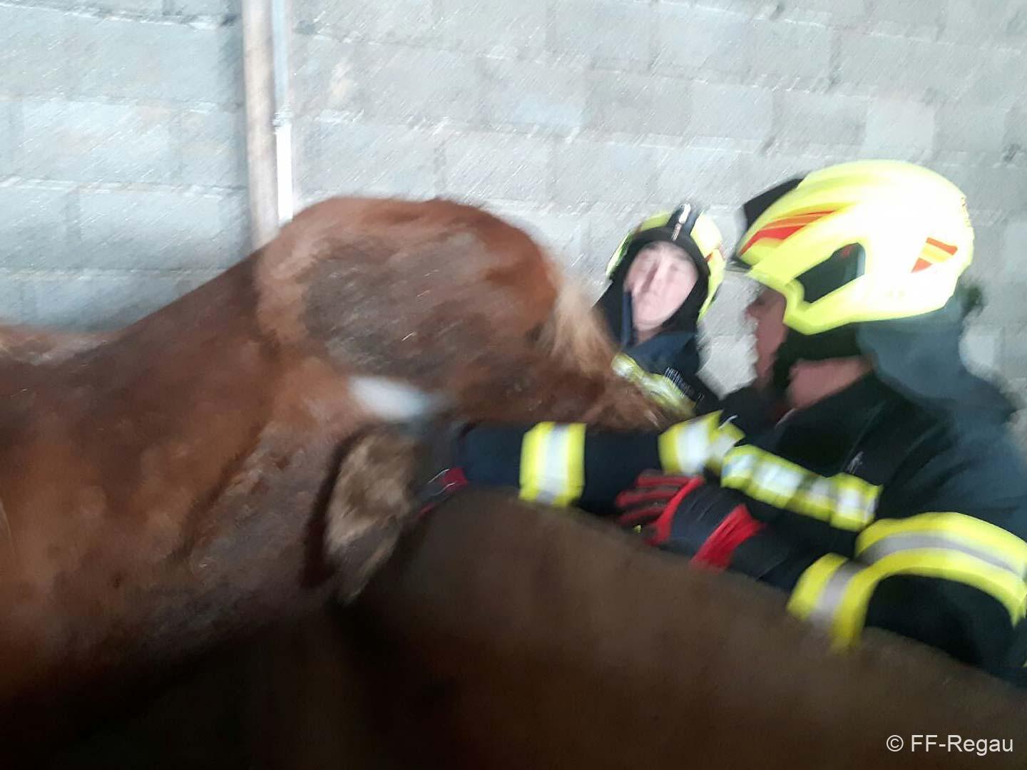 Nachdem der anwesende Tierarzt dem Hengst ein Beruhigsmittel verabreicht hatte, konnten wir es mit vereinten Kräften aus seiner äußerst misslichen Lage befreien. Danach konnten wir den Einsatz beenden.