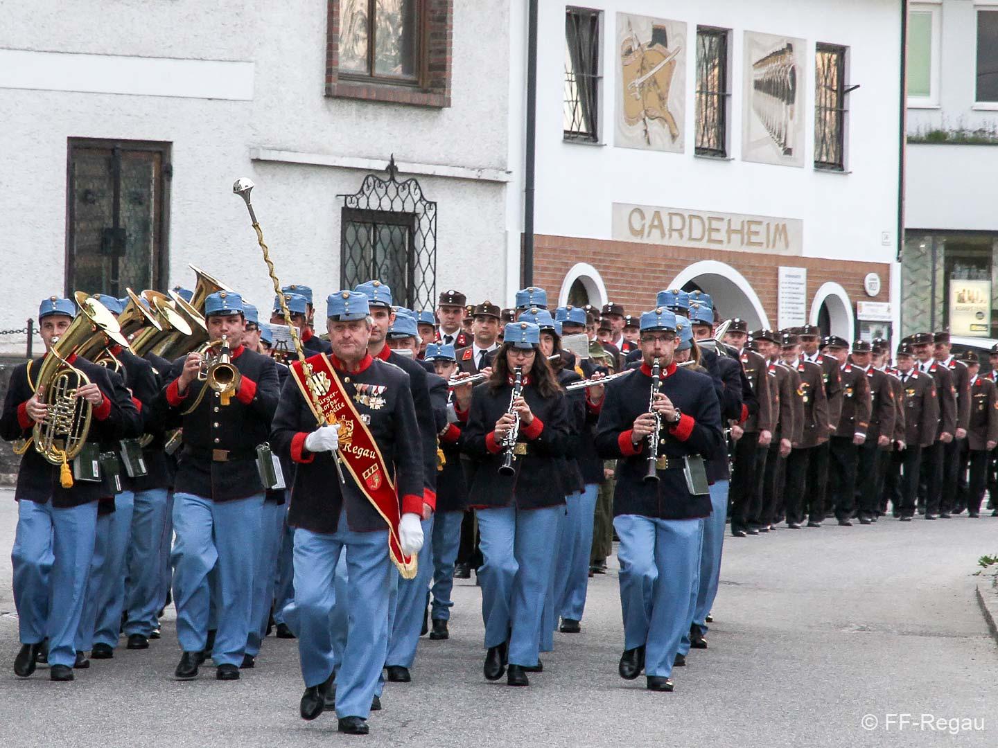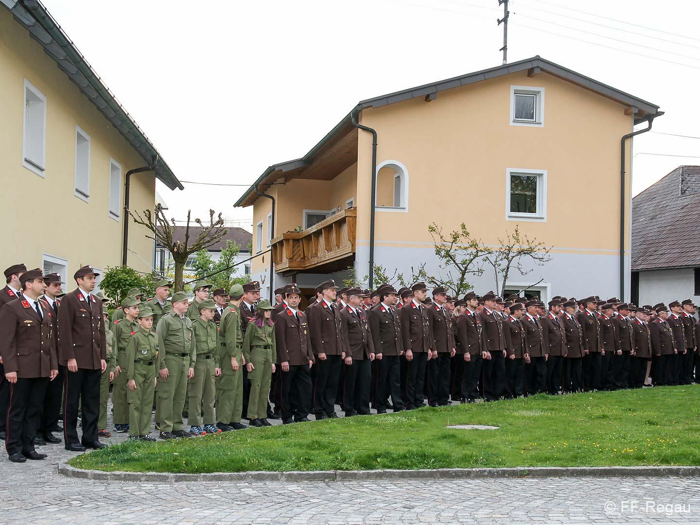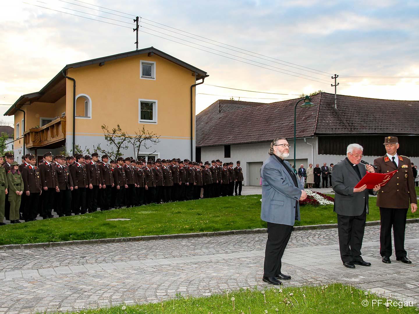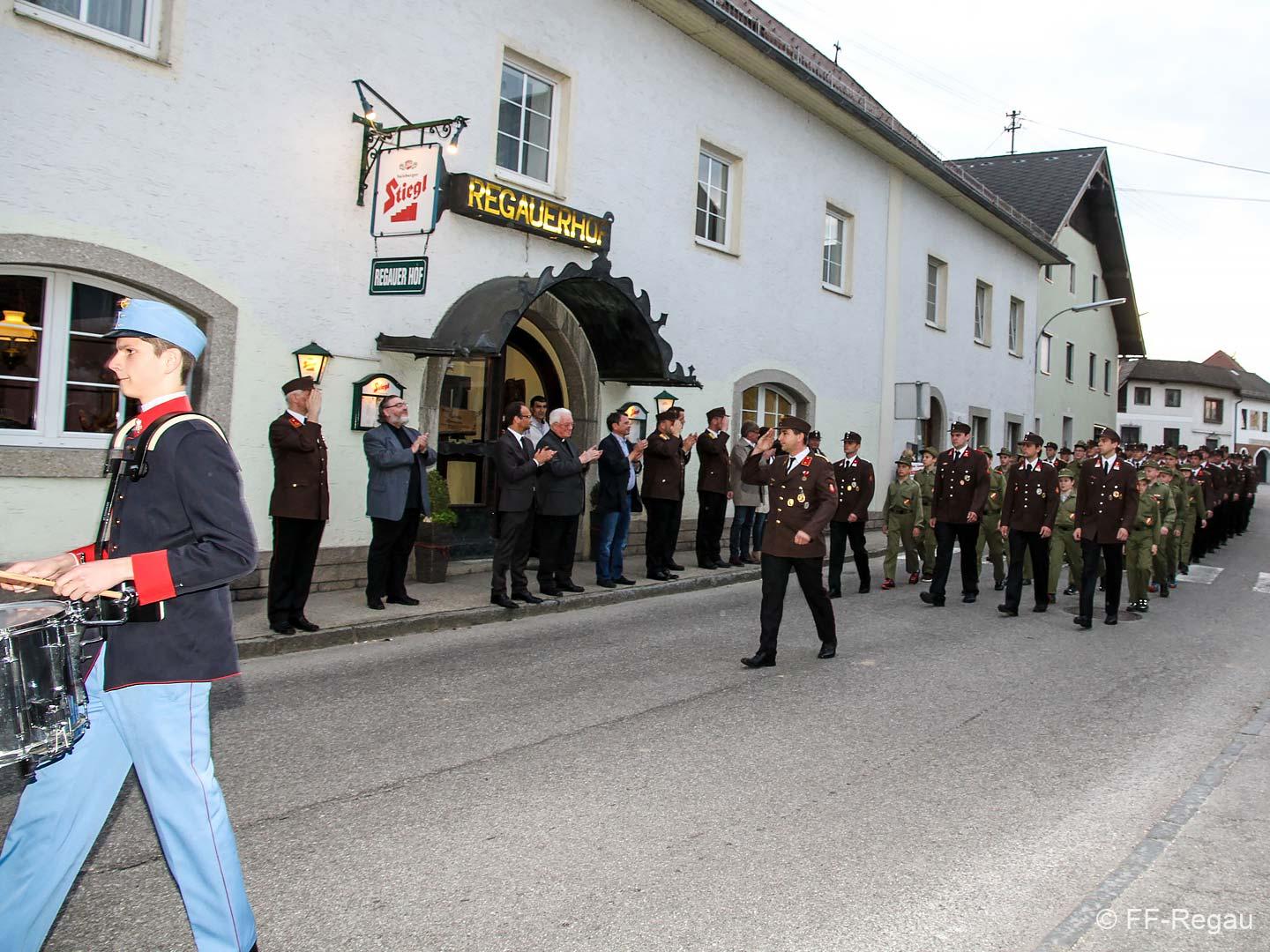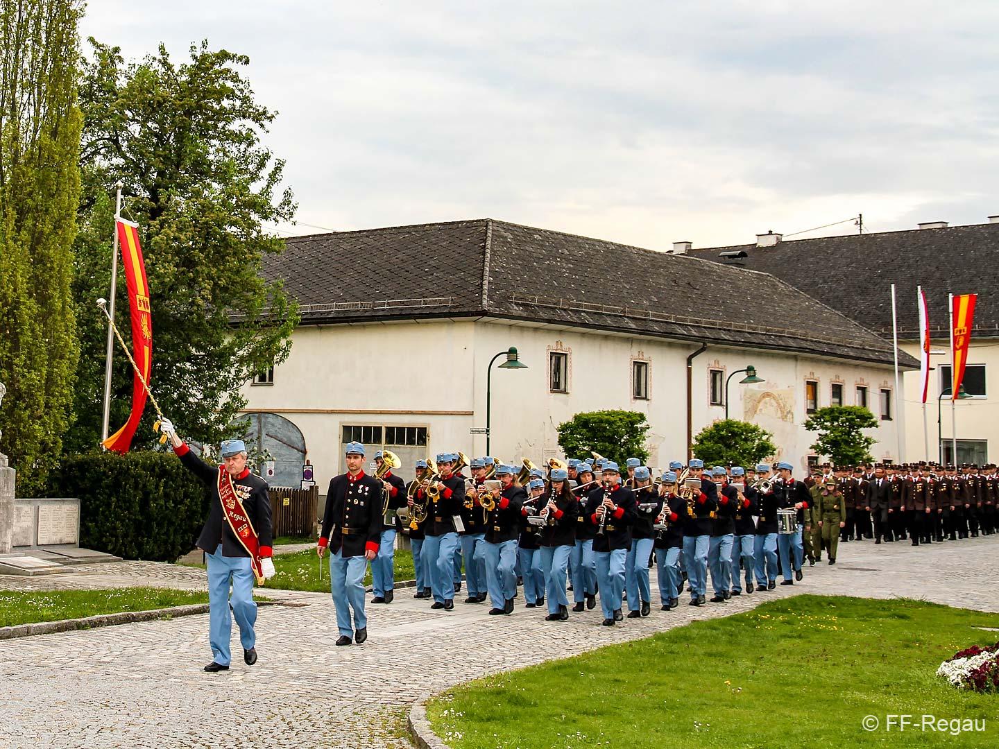 Dort zelebrierten Vöcklabrucks Stadtpfarrer Helmut Kritzinger und der Regauer Pfarrer Franz Hörtenhuber die Hl. Messe. Danach fand man sich zum Totengedenken beim Kriegerdenkmal am Ortsplatz. Anschließend erfolgte die eindrucksvolle Defilierung vor den Ehrengästen – neben Ortschef Peter Harringer sowie den Vizebürgermeistern Karl Haas und Artur Kroismayr gaben sich auch Abschnittsfeuerwehrkommandant Alois Lasinger, Gemeindevorstands- und Gemeinderatsmitglieder von Regau die Ehre. Zahlreiche Regauerinnen und Regauer verfolgten den festlichen Akt mit.