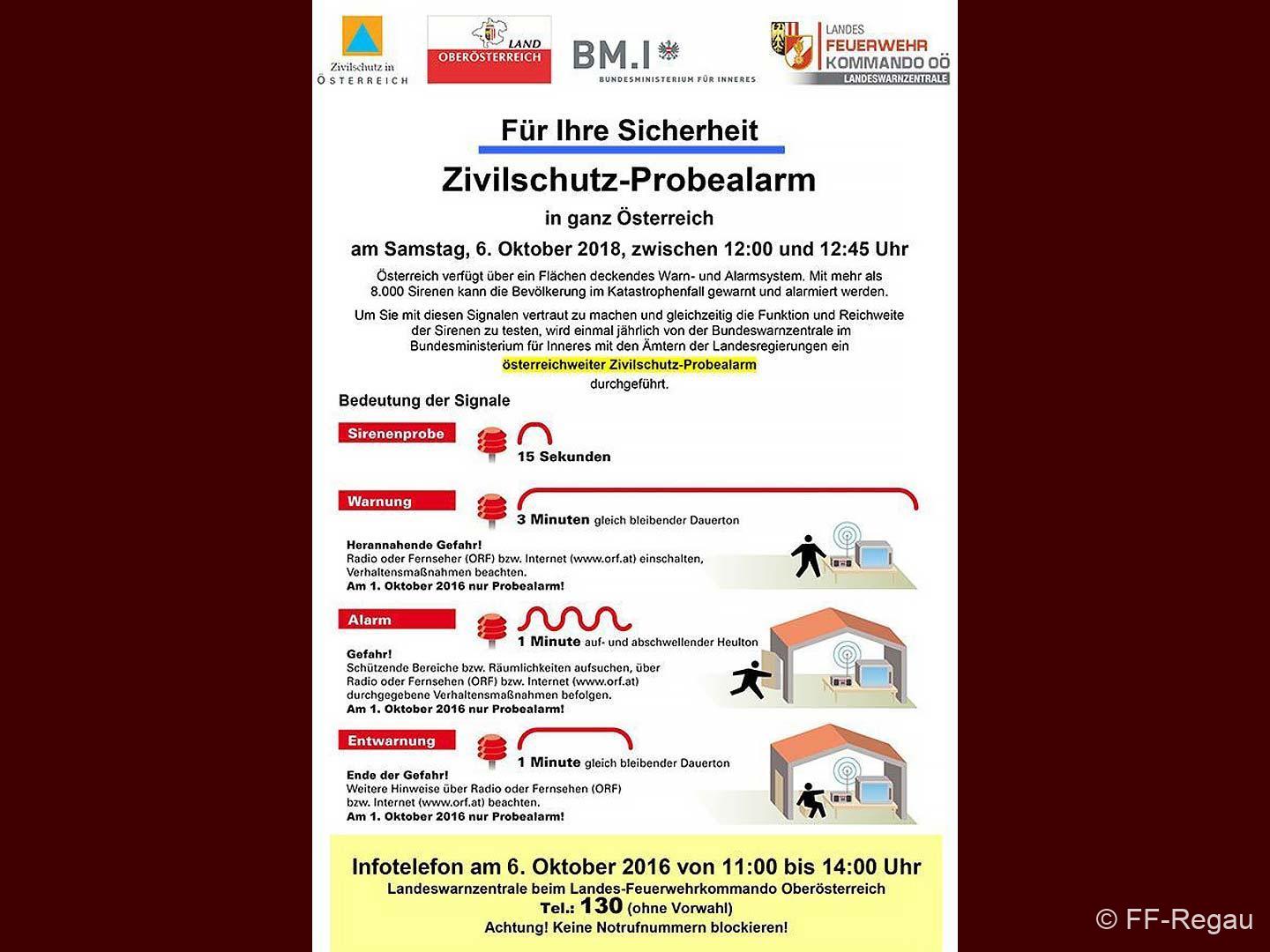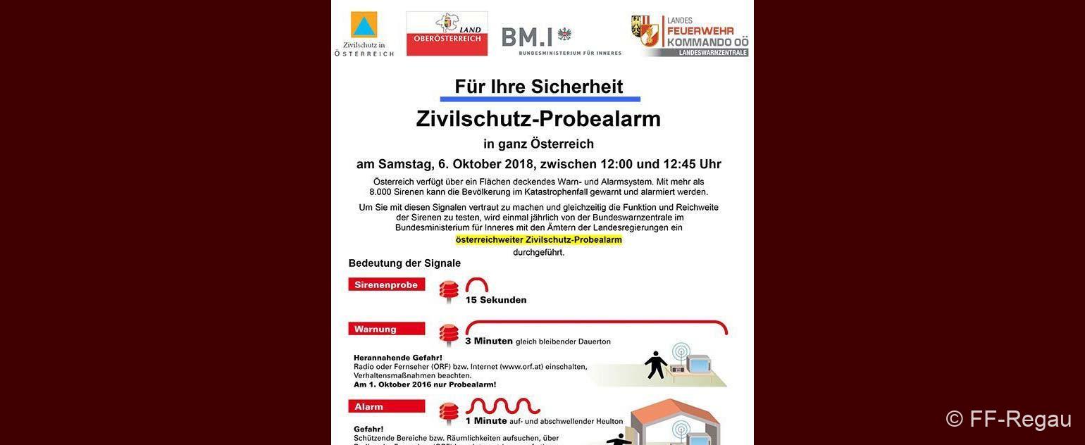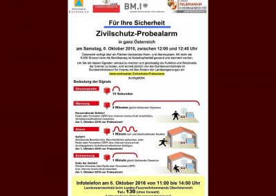 Um Sie mit diesen Signalen vertraut zu machen und gleichzeitig die Funktion und Reichweite der Sirenen zu testen, wird einmal jährlich von der Bundeswarnzentrale im Bundesministerium für Inneres mit den Ämtern der Landesregierungen ein österreichweiter Zivilschutz-Probealarm durchgeführt.