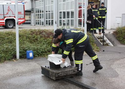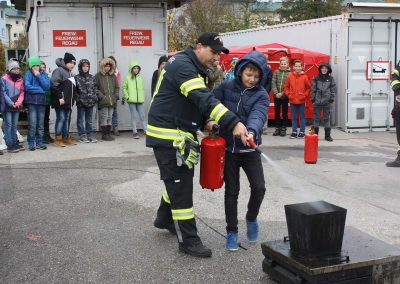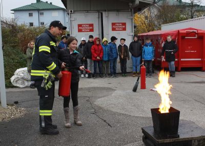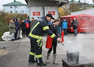 Dann gab es noch ein wenig Brandlehre und die Vorführung von einer Fettexplosion und einer Druckgaspackung. Schließlich durfte aber jeder Schüler selber mal ran und dem Umgang mit einem Handfeuerlöscher praktizieren. Bestens unterstützt wurden sie dabei von unserem Kommandanten, der hauptberuflich zertifizierter Brandschutzberater ist.