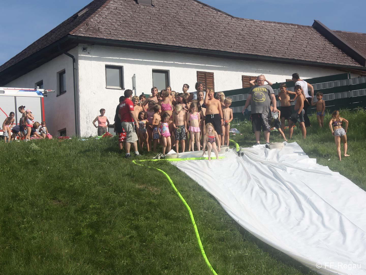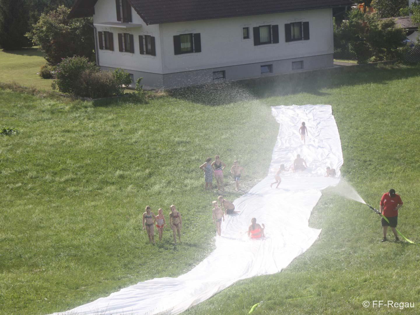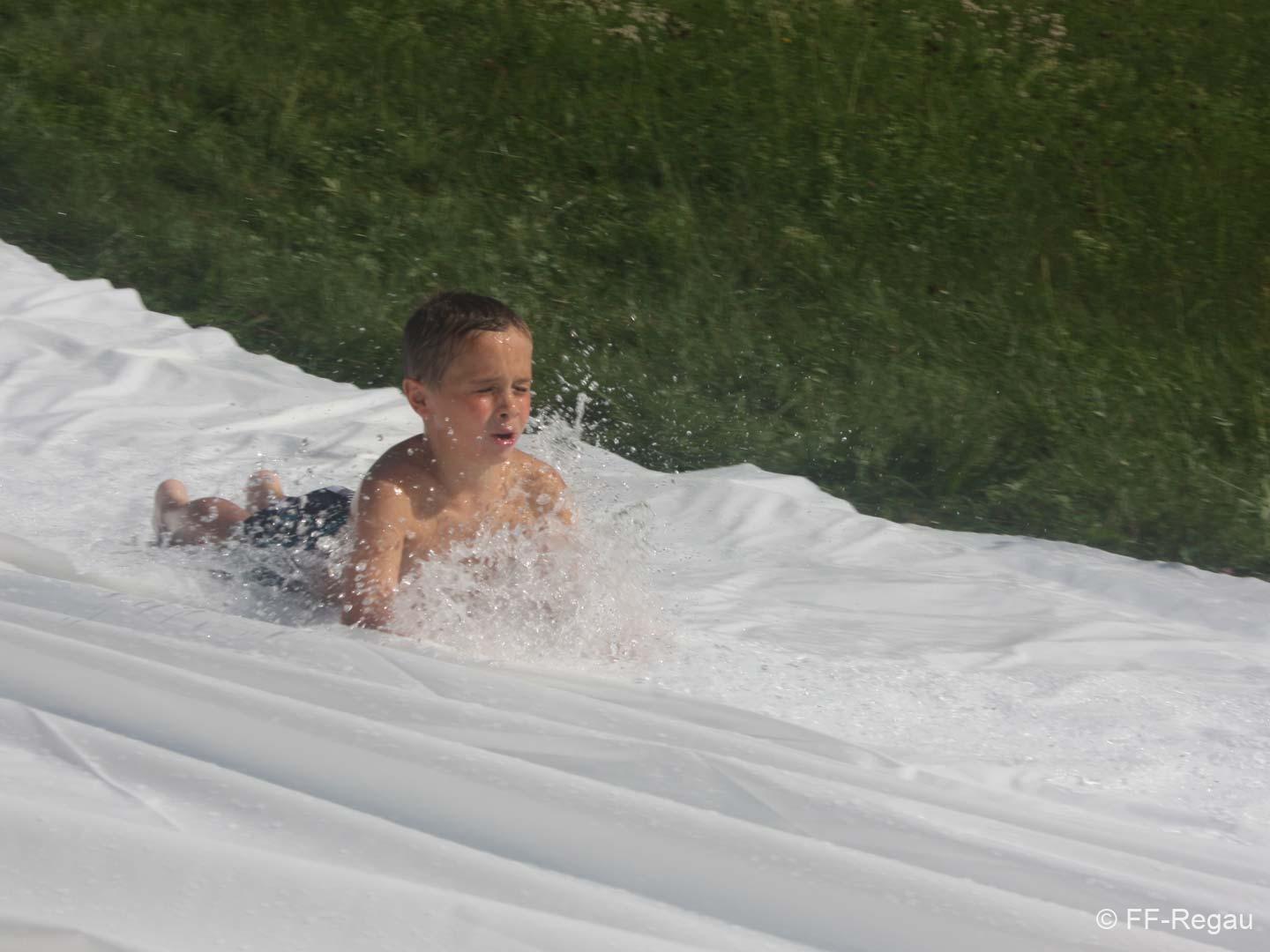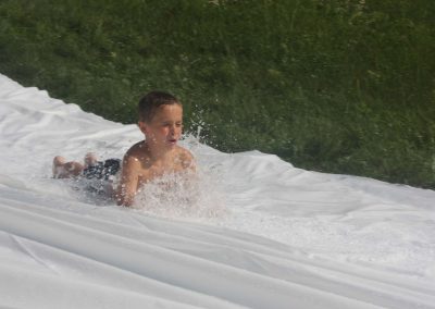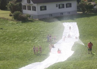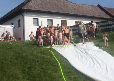 Nach einer Stärkung folgte die Fahrt mit den Feuerwehrautos zum absoluten Höhepunkt dieses Nachmittags. Die Fahrt ging nach Schalchham, wo bereits eine Wasserrutsche aufgebaut war. Natürlich war das sommerliche Wetter an diesem Tag ein großer Vorteil, weshalb die Abkühlung von den Kids – aber auch von Erwachsenen – sehr genossen wurde. Unzählige Male wurde die Wasserrutsche genutzt und an ein Aufhören war nicht zu denken.