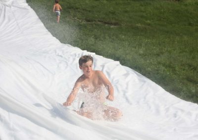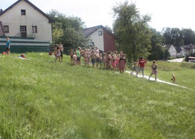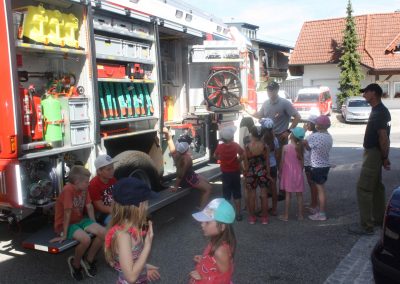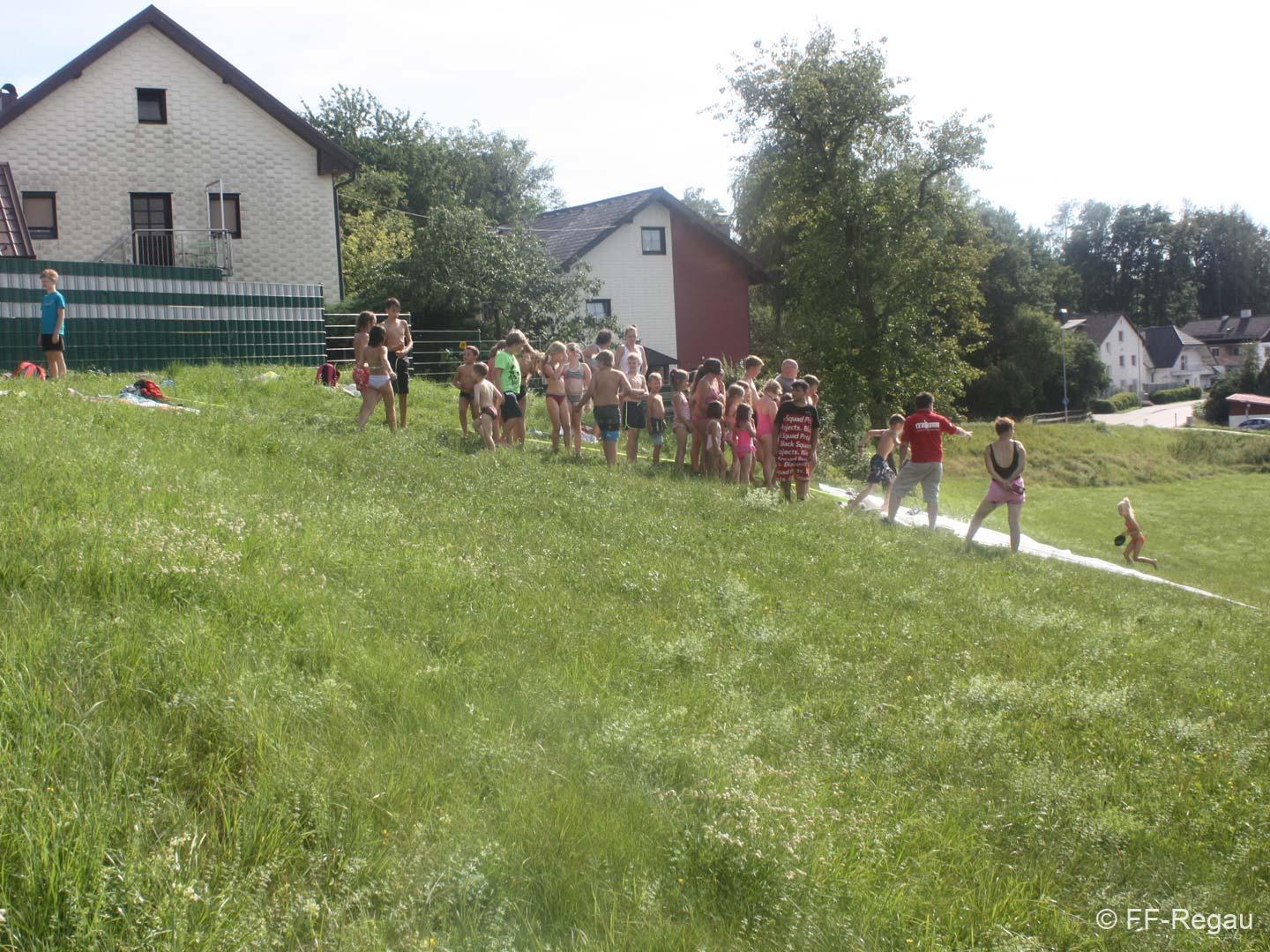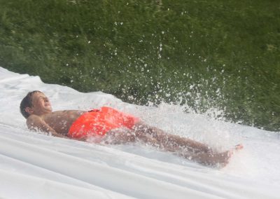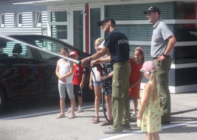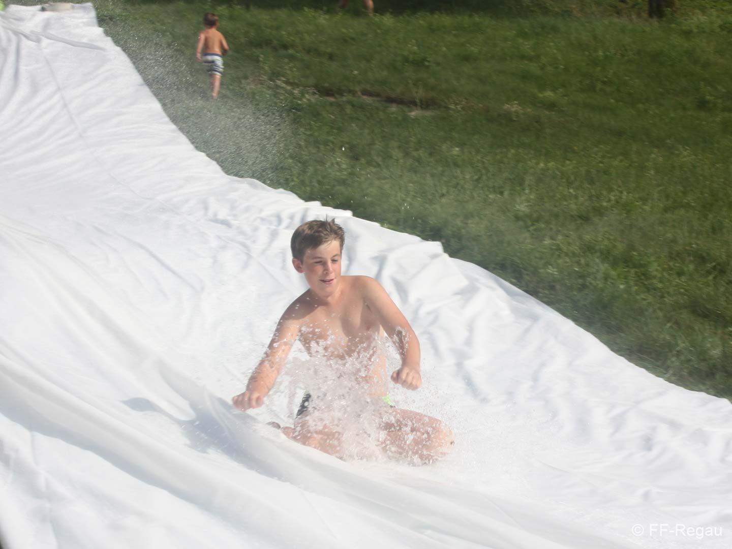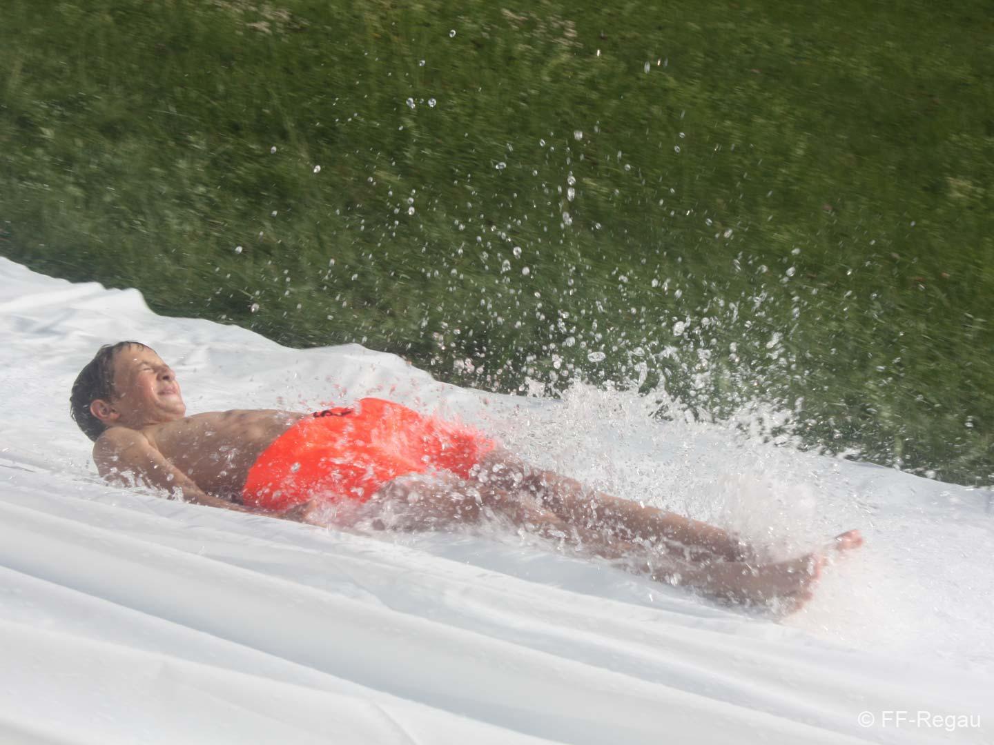 Nach einer Stärkung folgte die Fahrt mit den Feuerwehrautos zum absoluten Höhepunkt dieses Nachmittags. Die Fahrt ging nach Schalchham, wo bereits eine Wasserrutsche aufgebaut war. Natürlich war das sommerliche Wetter an diesem Tag ein großer Vorteil, weshalb die Abkühlung von den Kids – aber auch von Erwachsenen – sehr genossen wurde. Unzählige Male wurde die Wasserrutsche genutzt und an ein Aufhören war nicht zu denken.