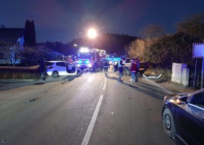 Da die Straße für die Dauer des Einsatzes total gesperrt werden musste, wurde eine großräumige Umleitung eingerichtet. Nach Aufnahme durch die Polizei wurde ein Fahrzeug gesichert für den Abtransport abgestellt und das zweite direkt von der Einsatzstelle durch ein Abschleppunternehmen abgeholt. Wir reinigten die Straße und haben die ausgelaufenen Betriebsmittel gebunden.