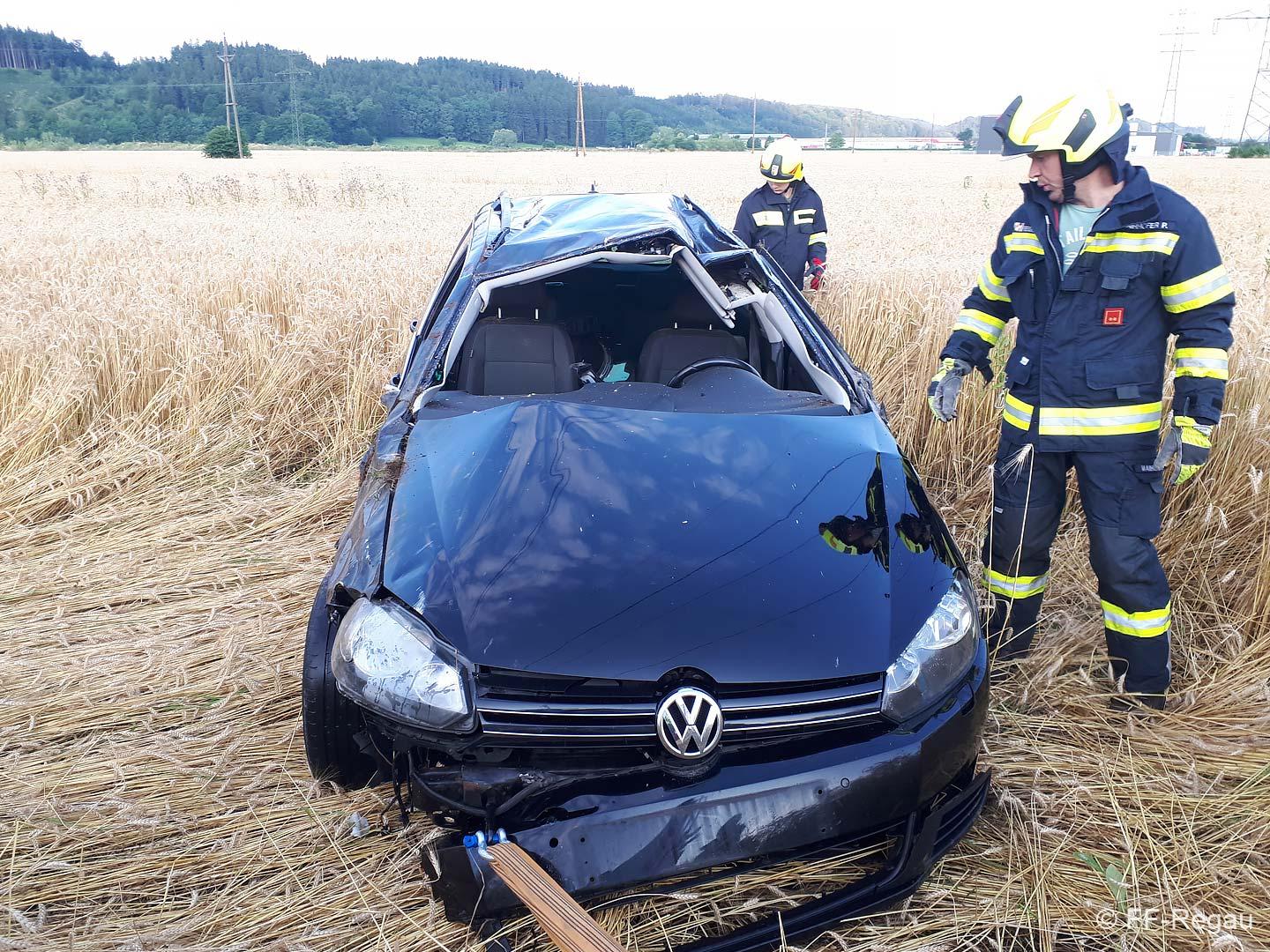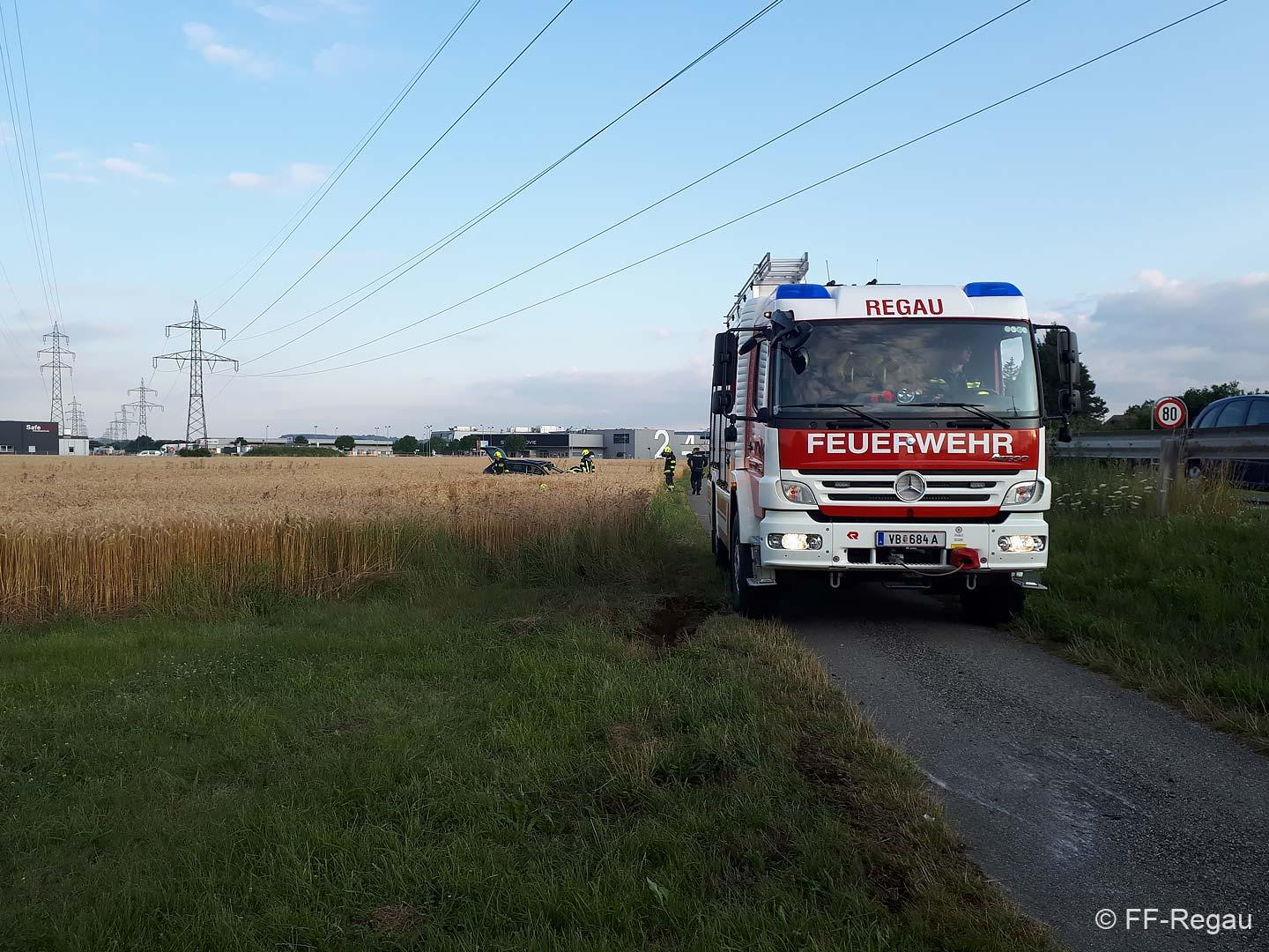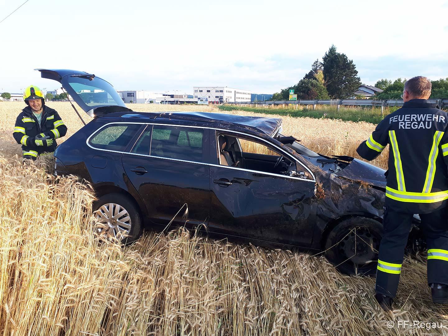 Zu einer Fahrzeugbergung wurden wir heute, 10.07., kurz nach 6 Uhr von der PI Vöcklabruck alarmiert. Ein Fahrzeuglenker kam mit seinem PKW aus bisher unbekannter Ursache auf der B 145 in Fahrtrichtung Vöcklabruck, auf die Gegenfahrbahn, fuhr in weiterer Folge auf eine Leitschiene auf, hob ab und dadurch katapultierte es den PKW in das angrenzende Feld. Zuvor hat das Fahrzeug zum ersten Mal am zwischen Bundesstraße und Feld verlaufenden Geh- und Radweg aufgeschlagen, dann in weiterer Folge hat es den PKW noch zwei Mal überschlagen, bis er wieder auf den Rädern im Feld zu stehen kam. Glücklicherweise waren keine Fußgänger und Radfahrer am Gehweg unterwegs.