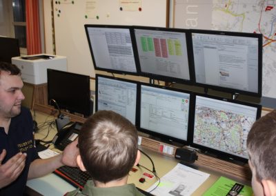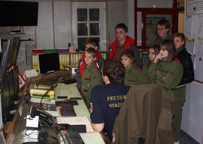Zu Beginn durften die Jugendlichen die Bezirkswarnstelle Ried, die sich im Feuerwehrhaus befindet, besichtigen. Dort wurde erklärt welche Schritte der Disponent macht wenn ein Notruf eintrifft.