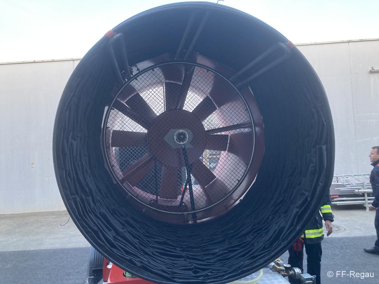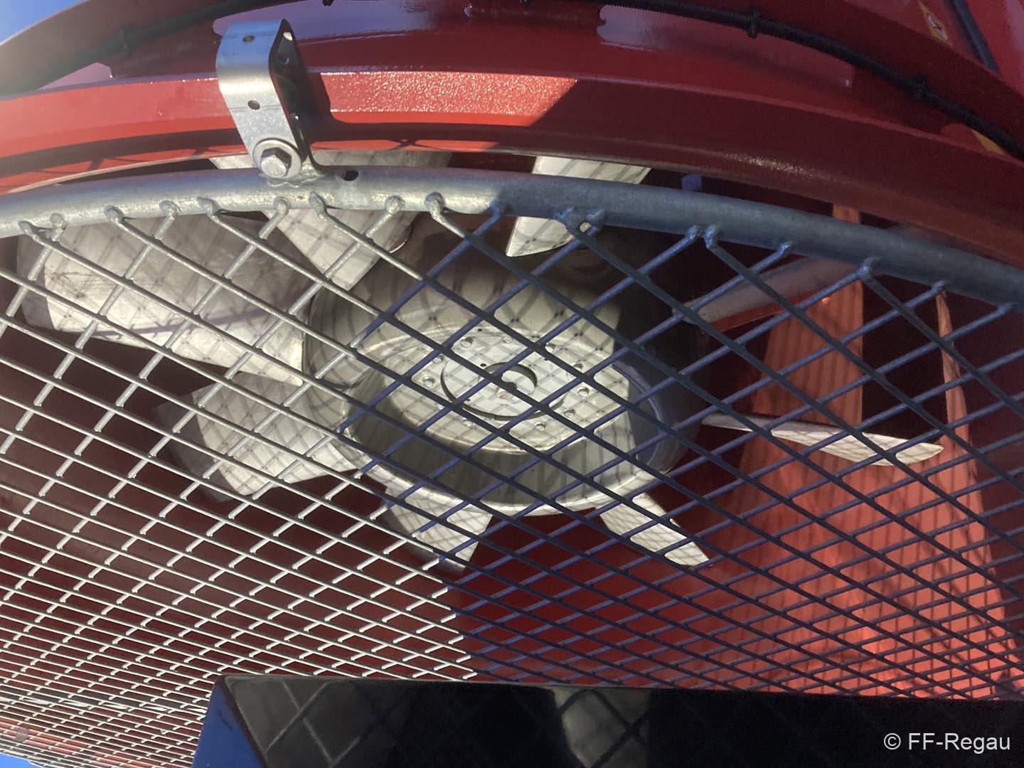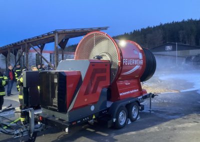 Zusätzlich kann der Lüfter mittels Wassernebel auch zur Kühlung und Wärmebindung bei Brandeinsätzen eingesetzt werden. Durch den Einsatz von Schaummittel können mit Leichtschaum ganze Hallenteile geflutet werden und so ist der Schutz von Feuerwehrkameraden gewährleistet, da niemand die Halle betreten muss.