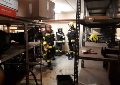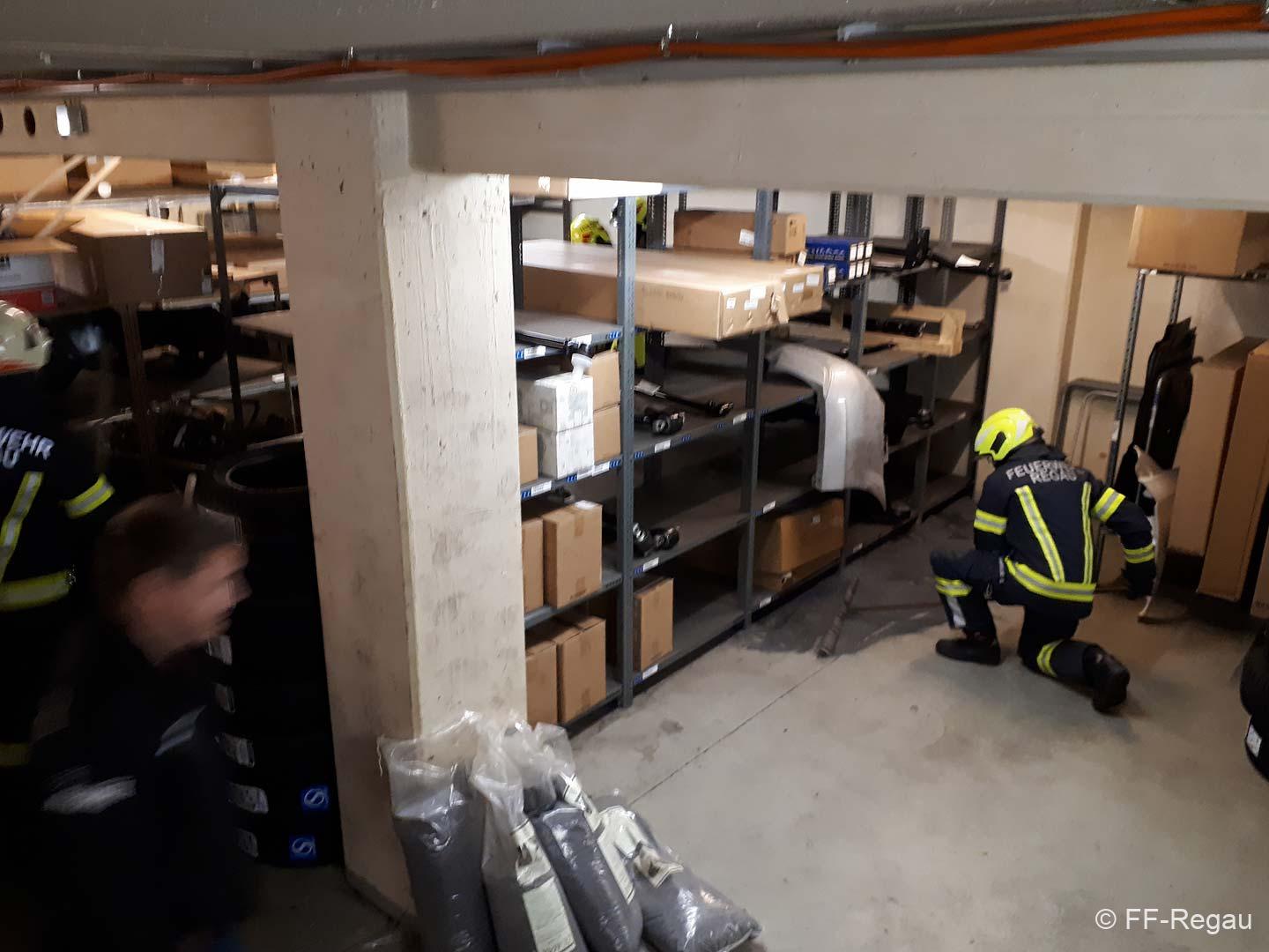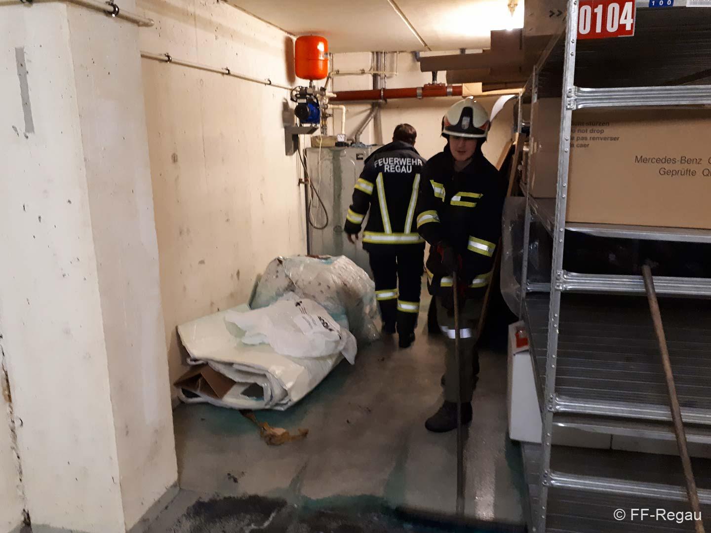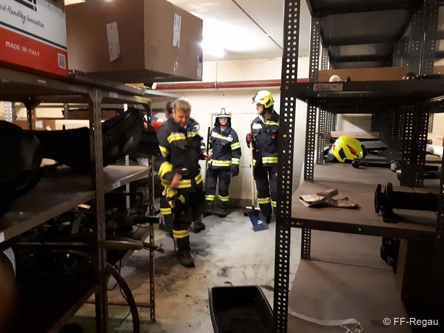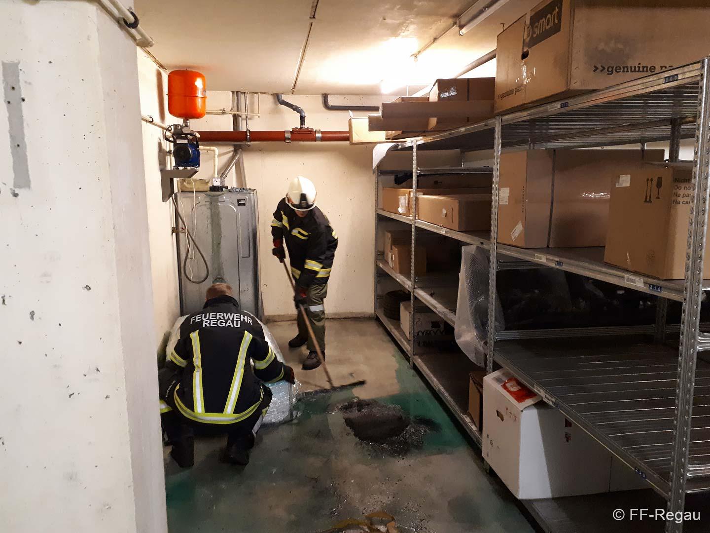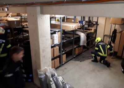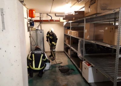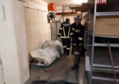 Aufgrund der hohen Konzentration in der Luft, war ein Betreten des Raumes vorerst nicht möglich. Mittels Hochleistungslüfter wurde der Keller belüftet, worauf die Belastung in der Luft rasch sank. Dann konnten wir mit den Aufräumarbeiten beginnen. Die ausgelaufene Flüssigkeit wurde mit Bindemittel gebunden und so aus dem Keller gebracht. Dazu war es auch erforderlich, die Einrichtung im Keller zu verschieben.