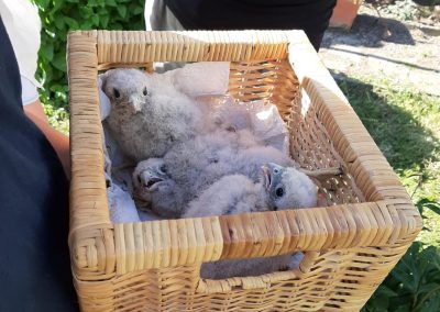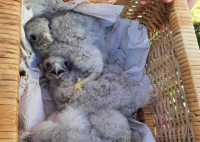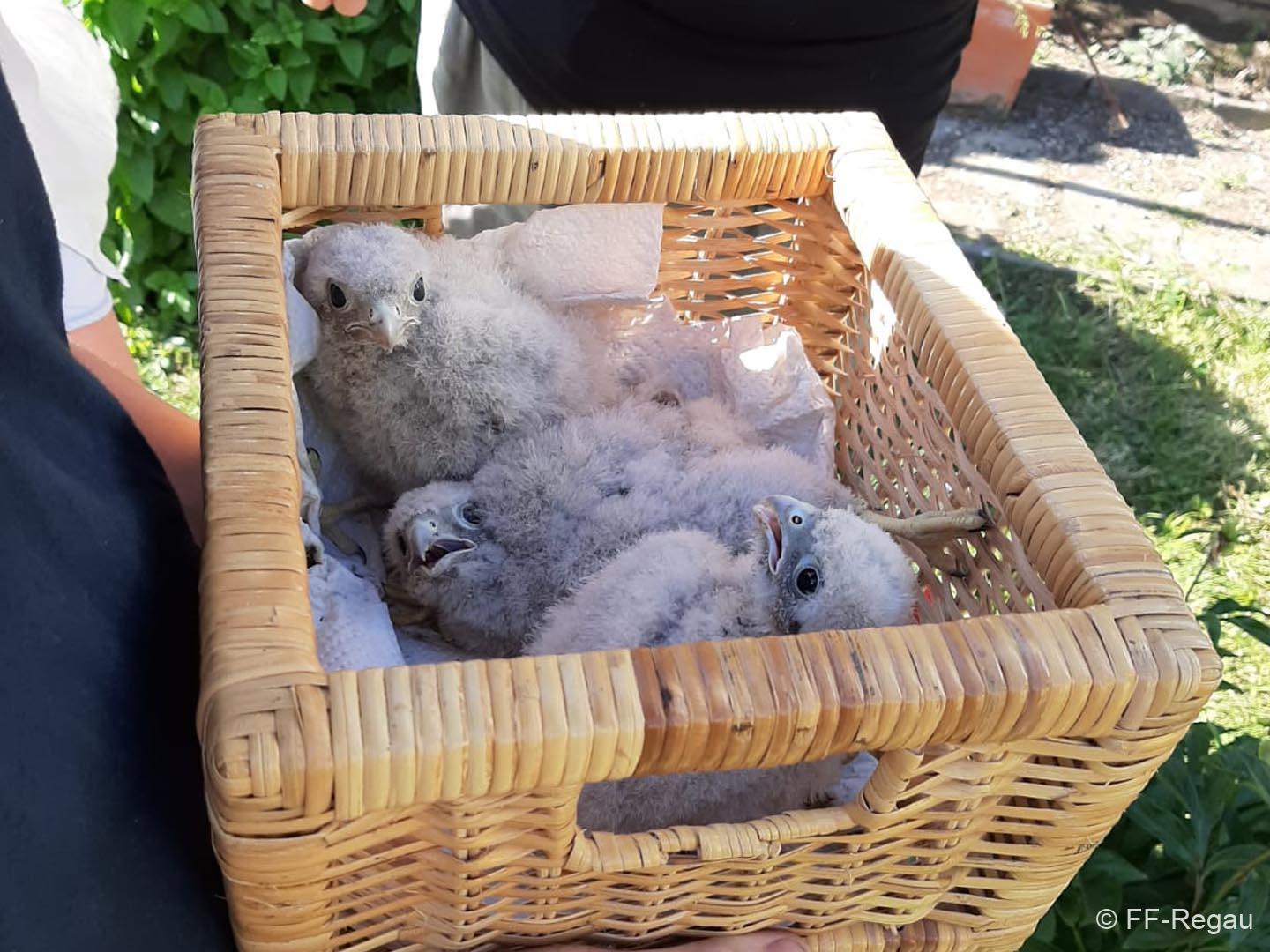 Aus Nest gefallene Falkenkücken wurden geborgen und wieder zurück ins Nest gebracht.