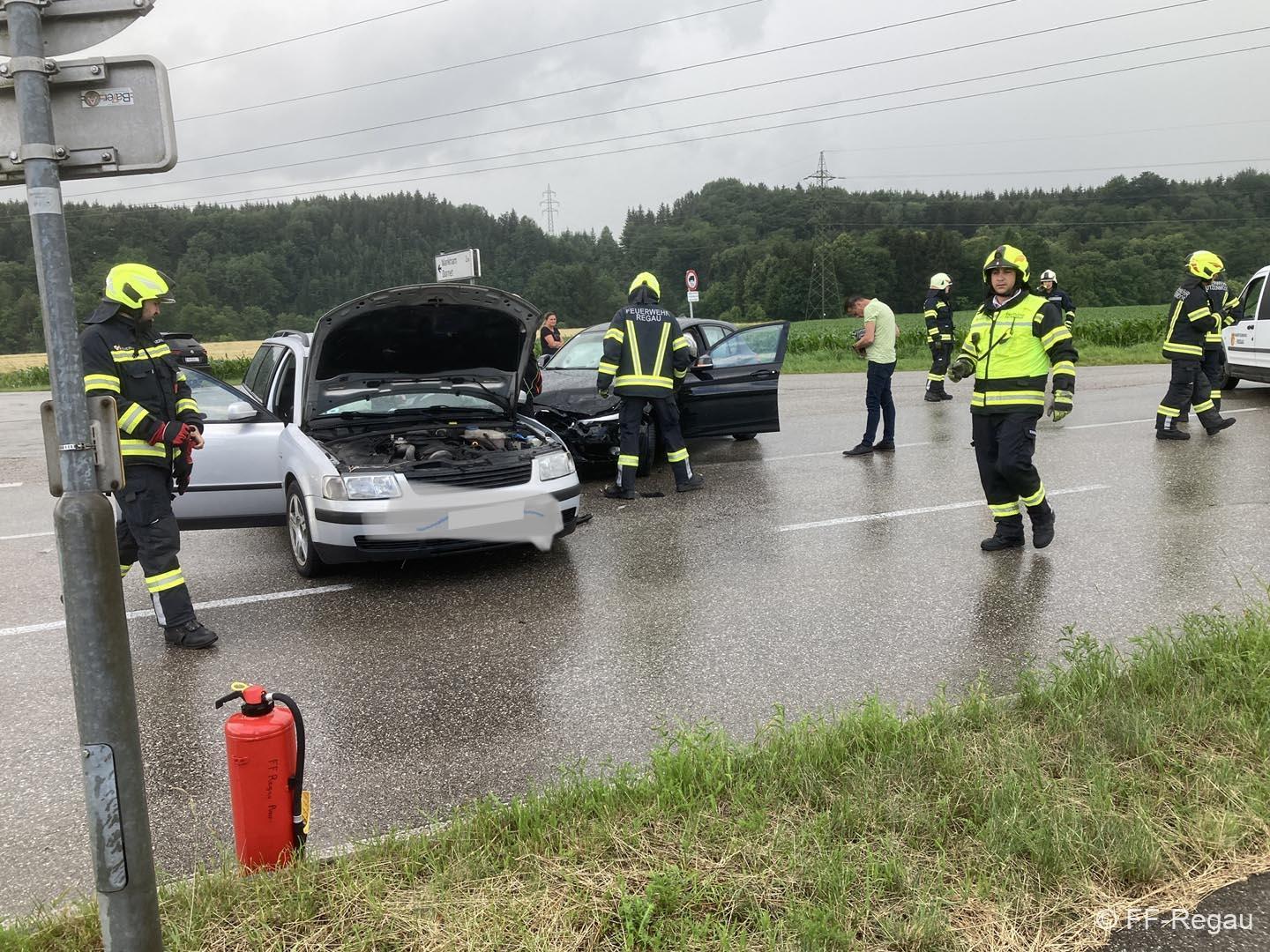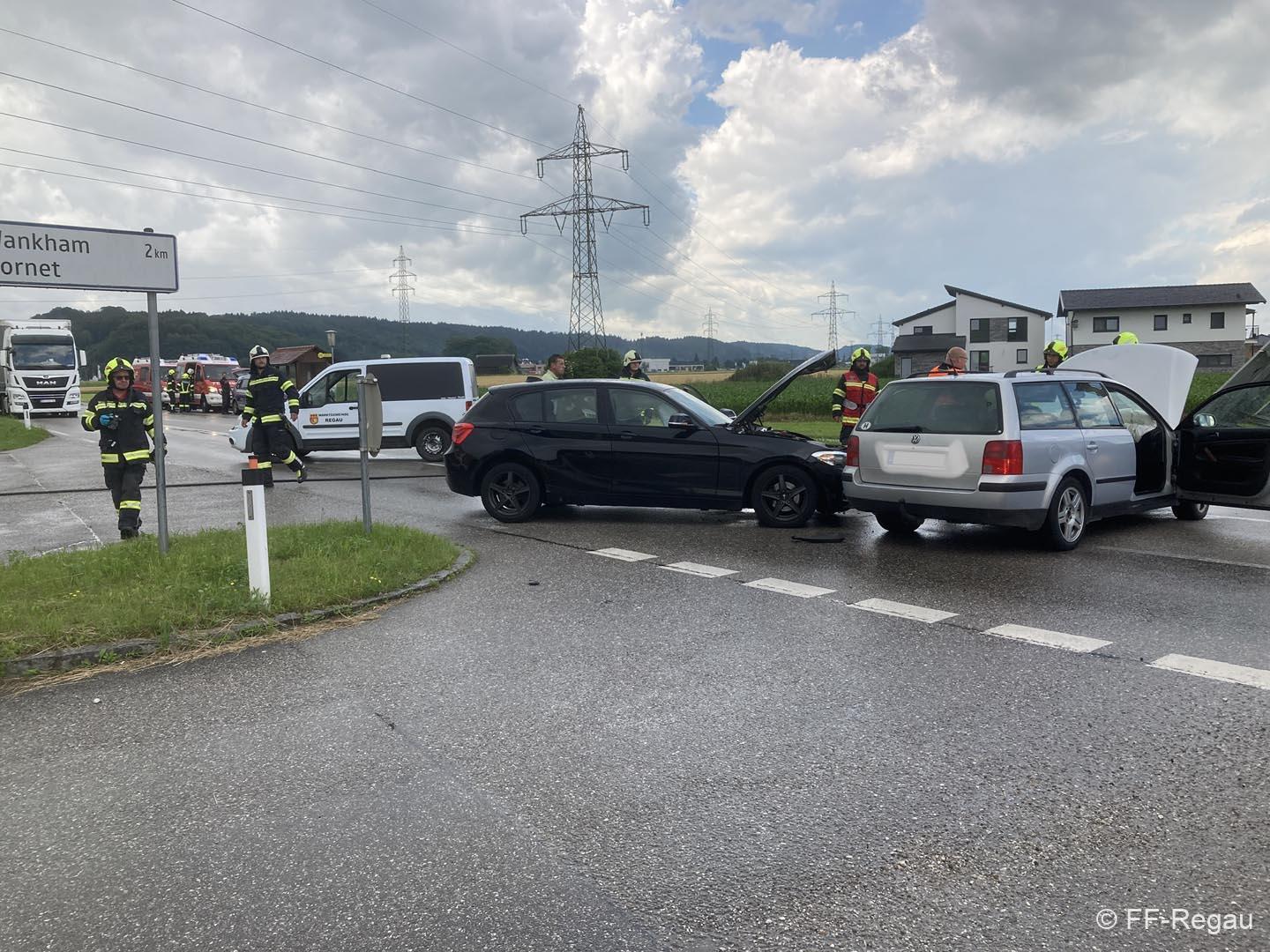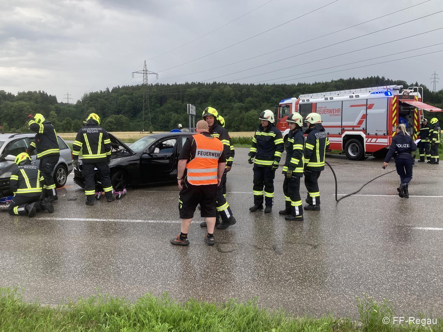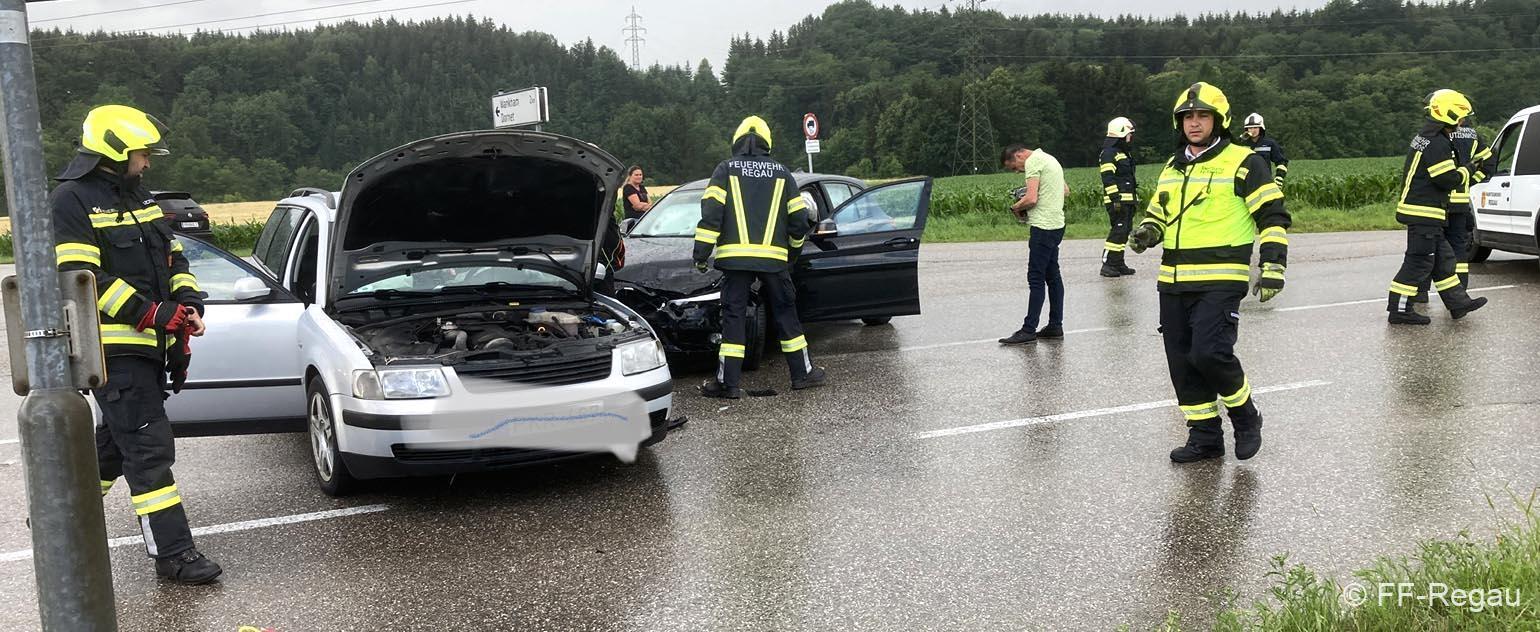 Auf der Schörflinger Landesstraße waren bei der Kreuzung nach Wankham zwei PKW aus bisher unbekannter Ursache zusammengestoßen. Da eine am Unfall beteiligte Person zunächst nicht gleich alleine aussteigen konnte, wurde eben die Alarmierung zu Verkehrsunfall mit eingeklemmter Person rausgegeben und die Feuerwehren der Marktgemeinde Regau alarmiert.