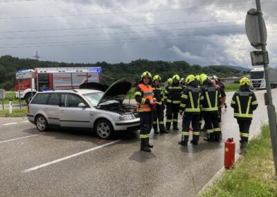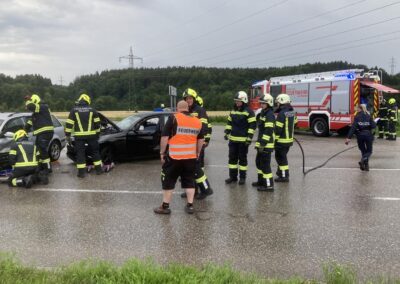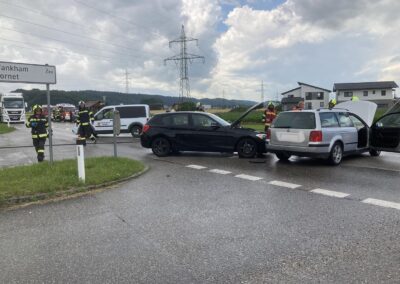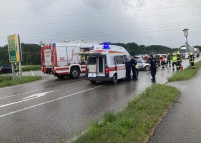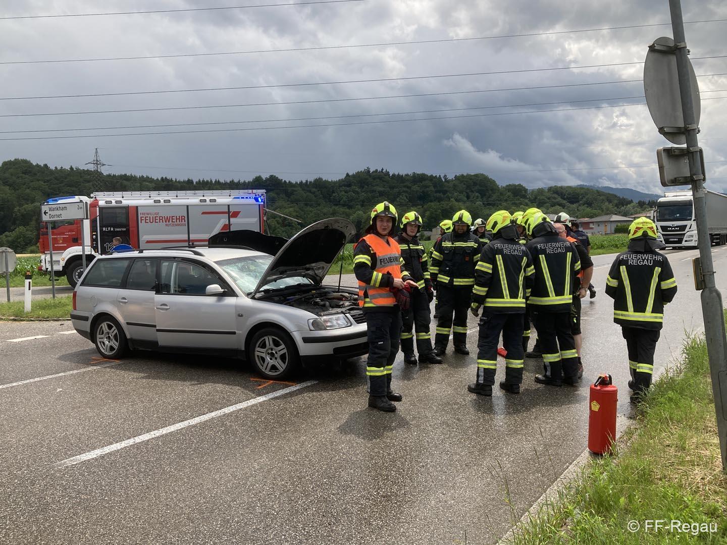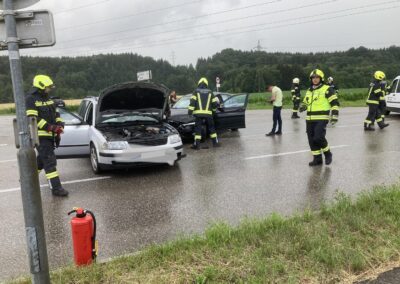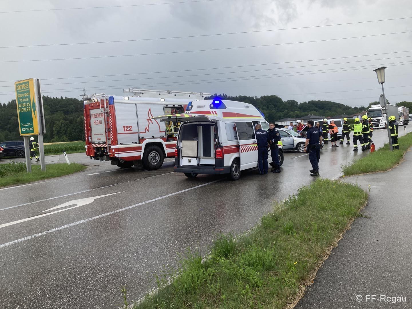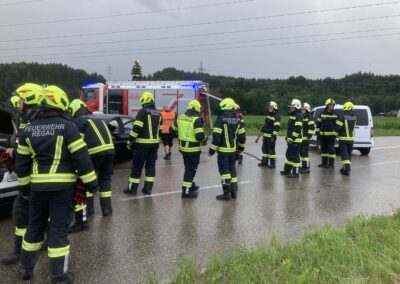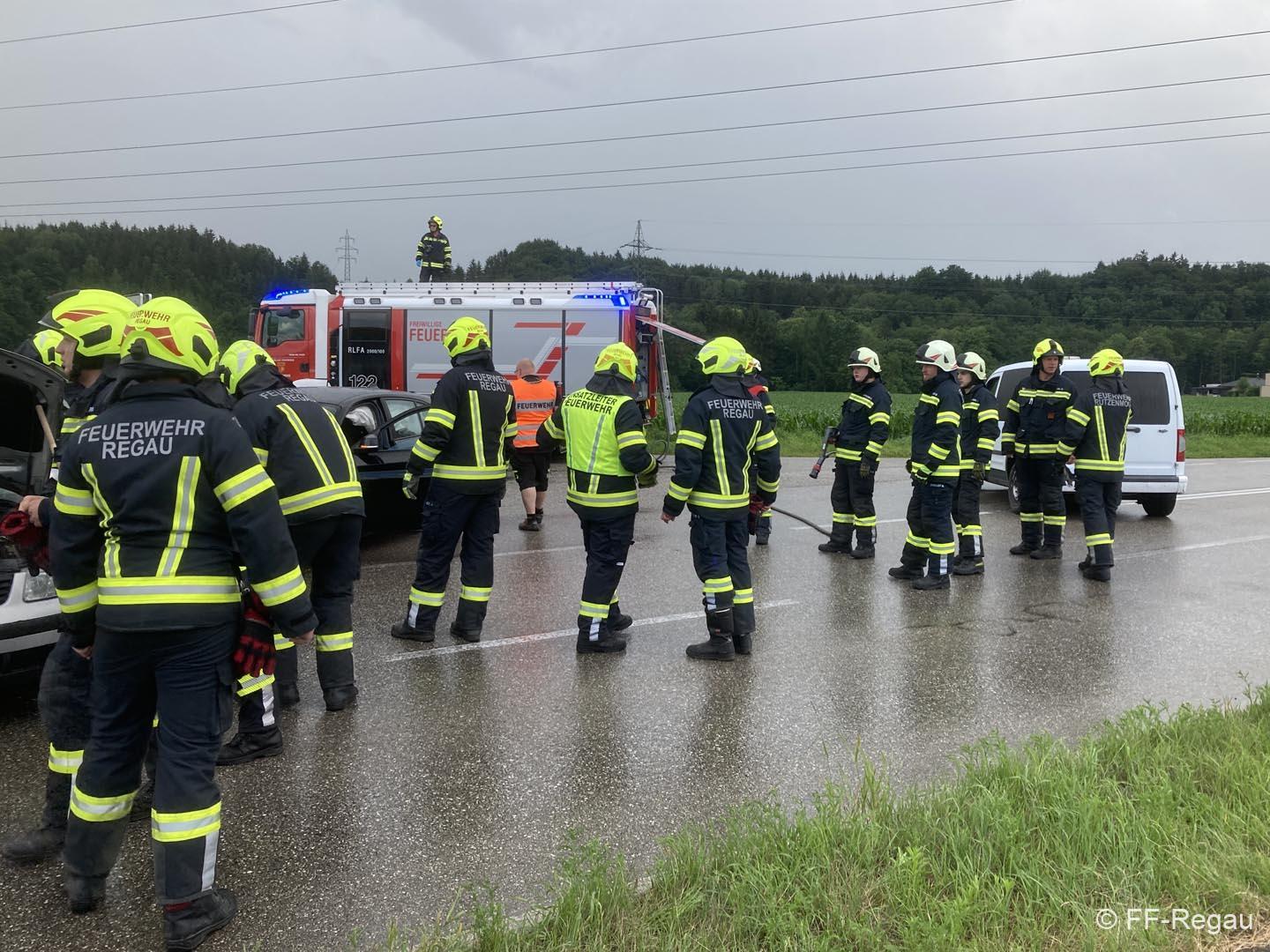 Auf der Schörflinger Landesstraße waren bei der Kreuzung nach Wankham zwei PKW aus bisher unbekannter Ursache zusammengestoßen. Da eine am Unfall beteiligte Person zunächst nicht gleich alleine aussteigen konnte, wurde eben die Alarmierung zu Verkehrsunfall mit eingeklemmter Person rausgegeben und die Feuerwehren der Marktgemeinde Regau alarmiert.