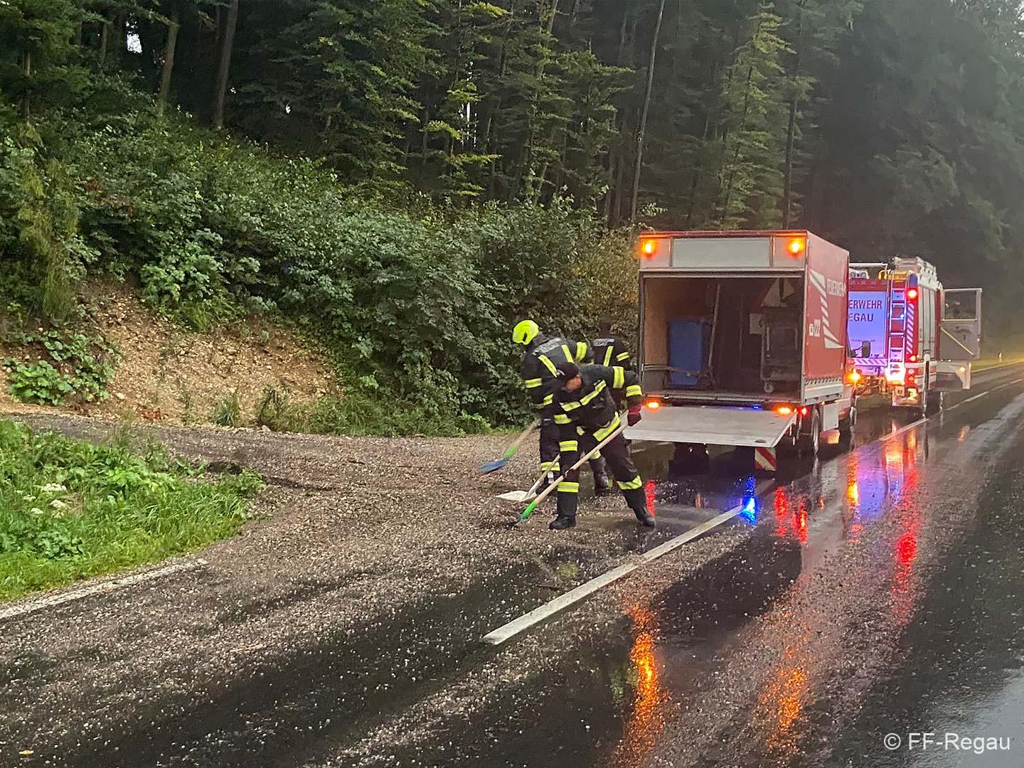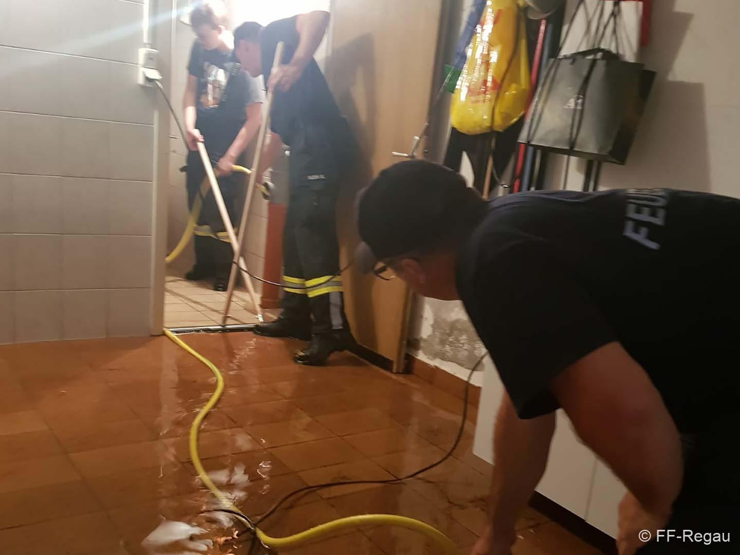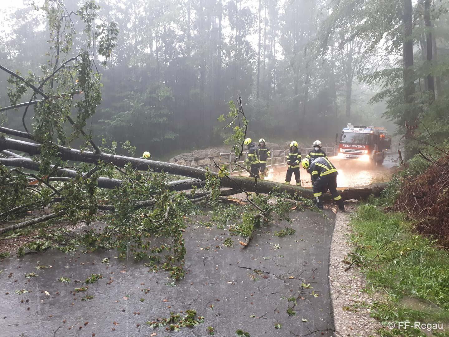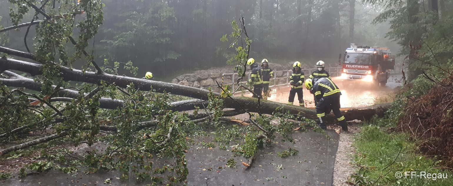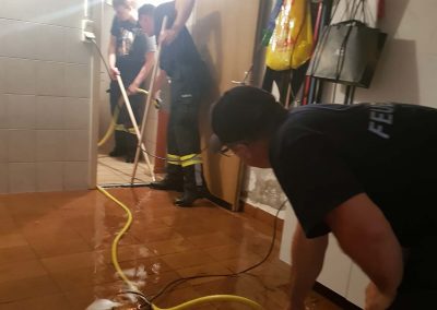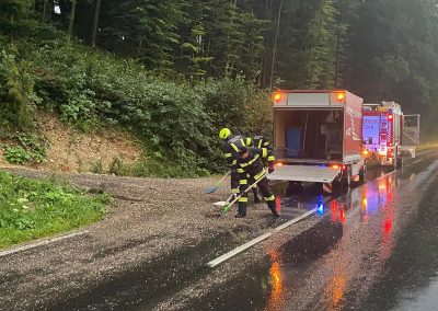 Wir mussten umgestürzte Bäume entfernen, Keller auspumpen und Straßen von heruntergefallenen Ästen und sonstigen Verunreinigungen säubern. Nachdem die erste Einsatzwelle nach mehr als 1,5 Stunden vorbei war, mussten wir in den späteren Abendstunden nochmals ausrücken, um heruntergeschwemmten Schotter von der Schörflinger Landesstraße zu entfernen.