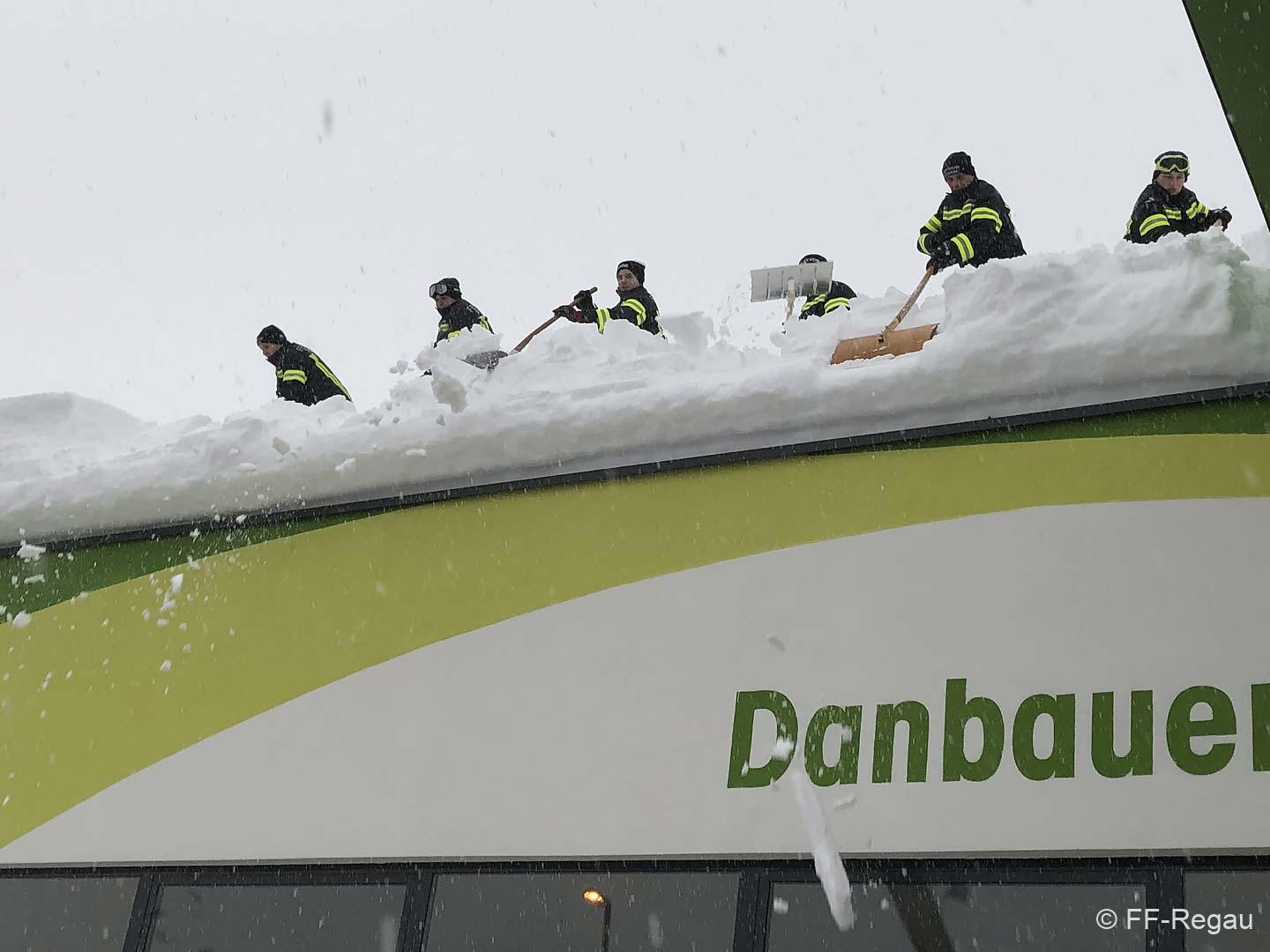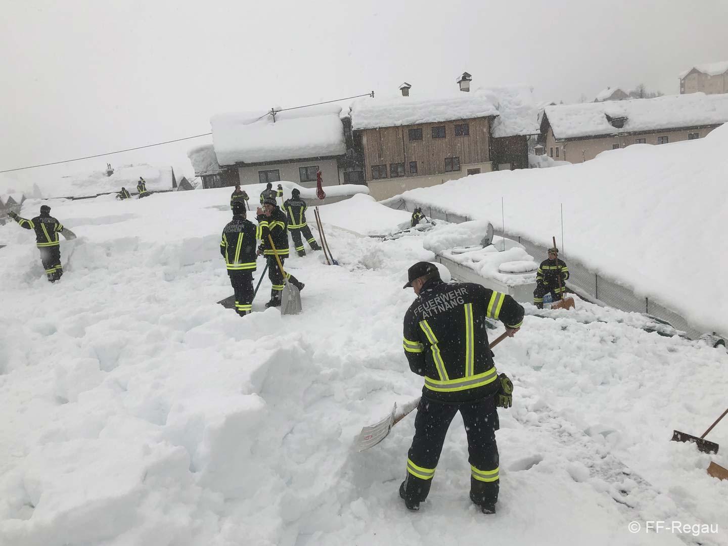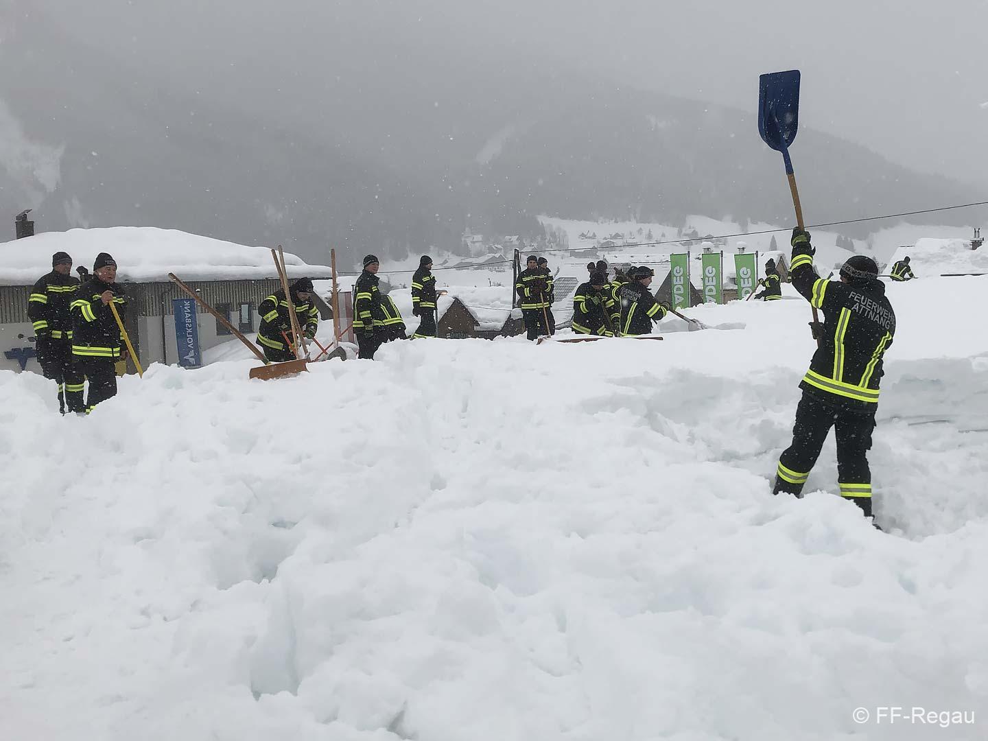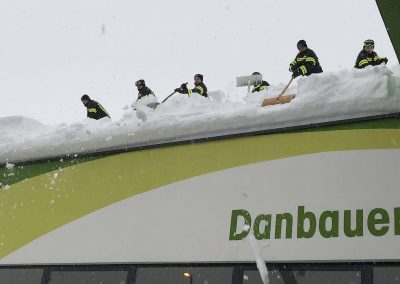 Gemeinsam mit den Kameraden der FF-Attnang und FF-Puchheim mussten wir den ADEG-Markt räumen (den anderen Feuerwehren wurden weitere gefährdete Objekte zugeteilt). Gemeinsam wurde geschaufelt, geschaufelt und geschaufelt. Teilweise war am Dach Schnee in Höhe von gut 1,5 Meter. Der Schnee war nur oben pulvrig, unten dann fest und kompakt. Deshalb wurden mit Baumsägen Blöcke herausgeschnitten und diese dann mittels Schneehexen weggebracht.