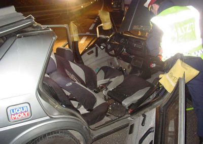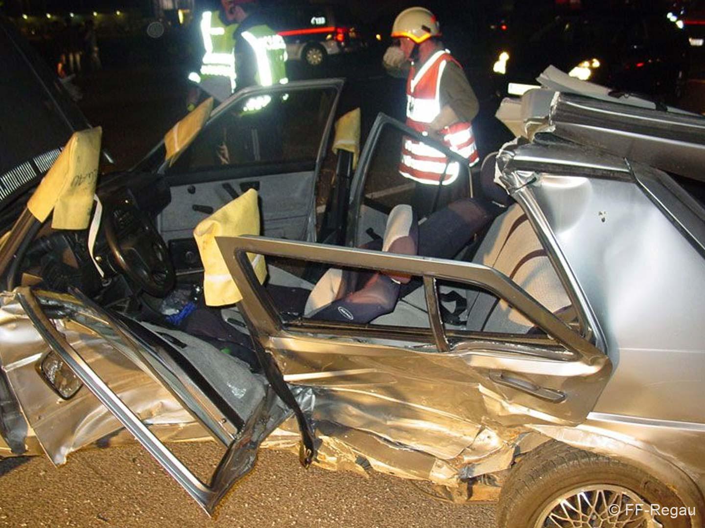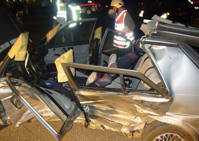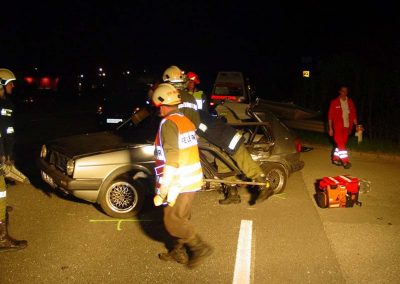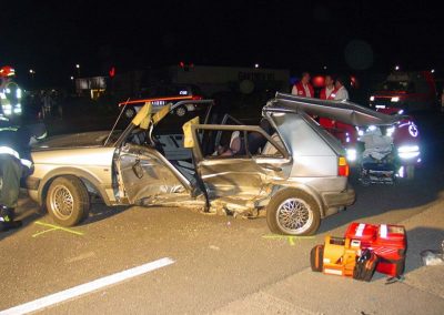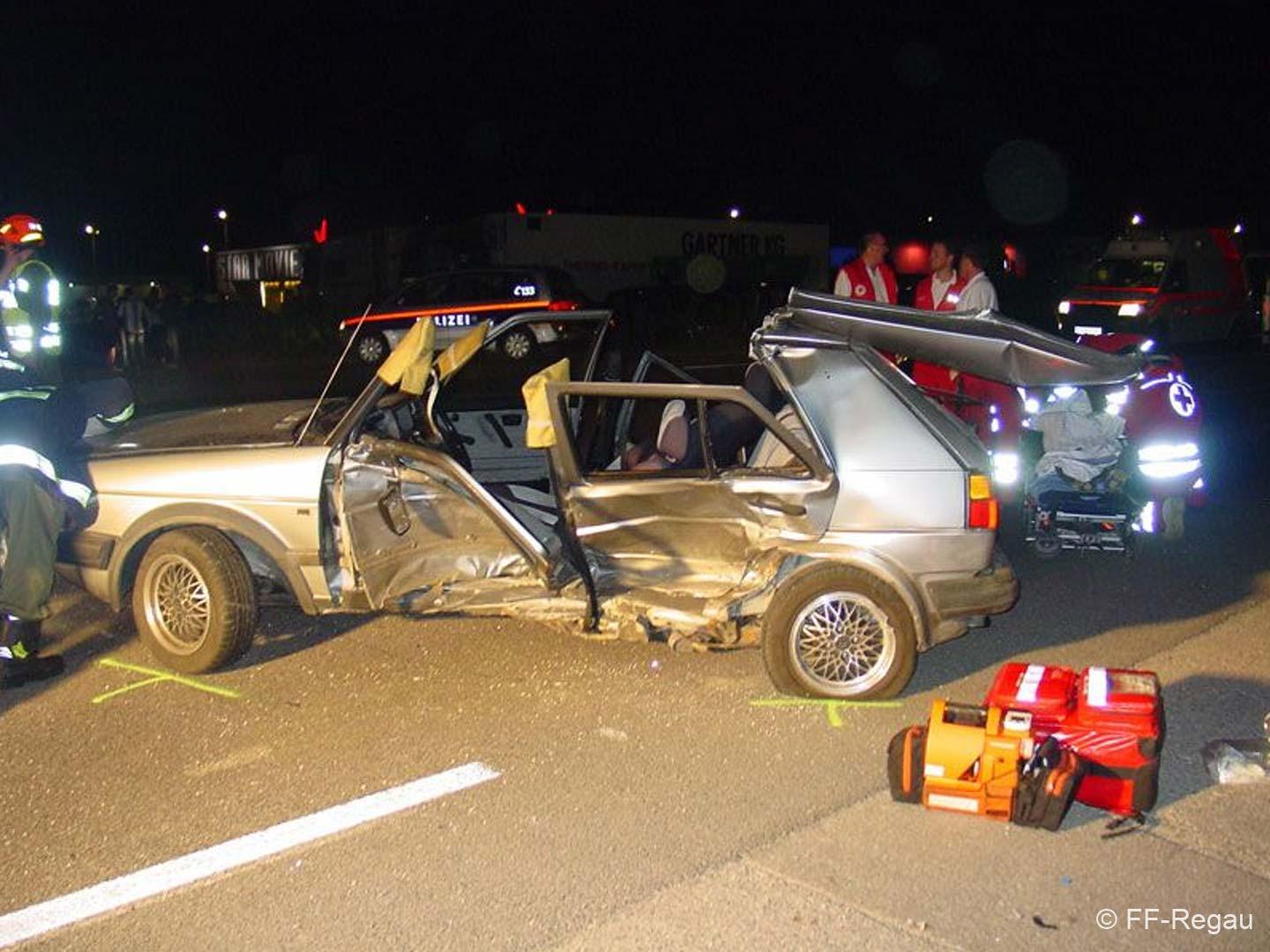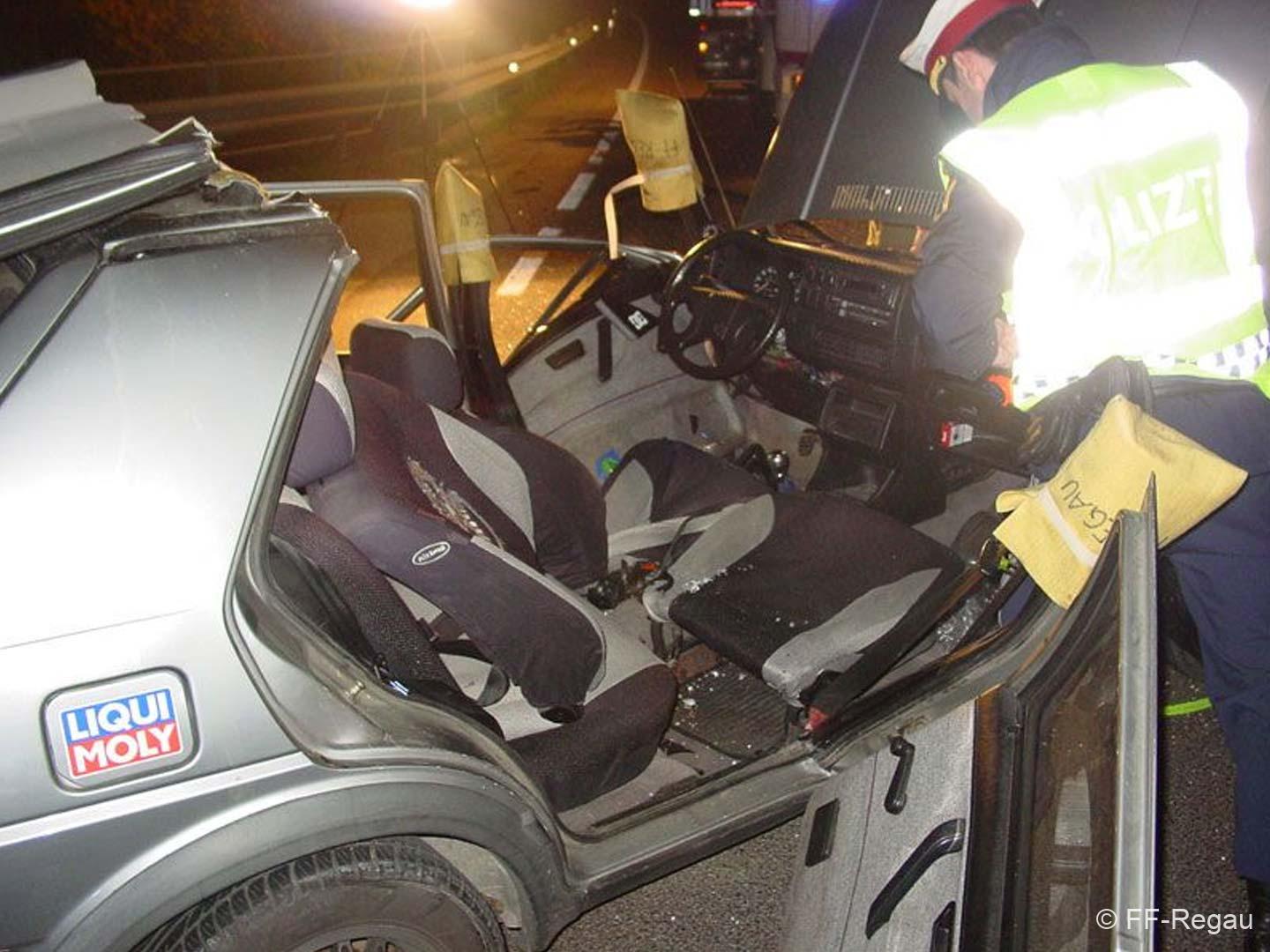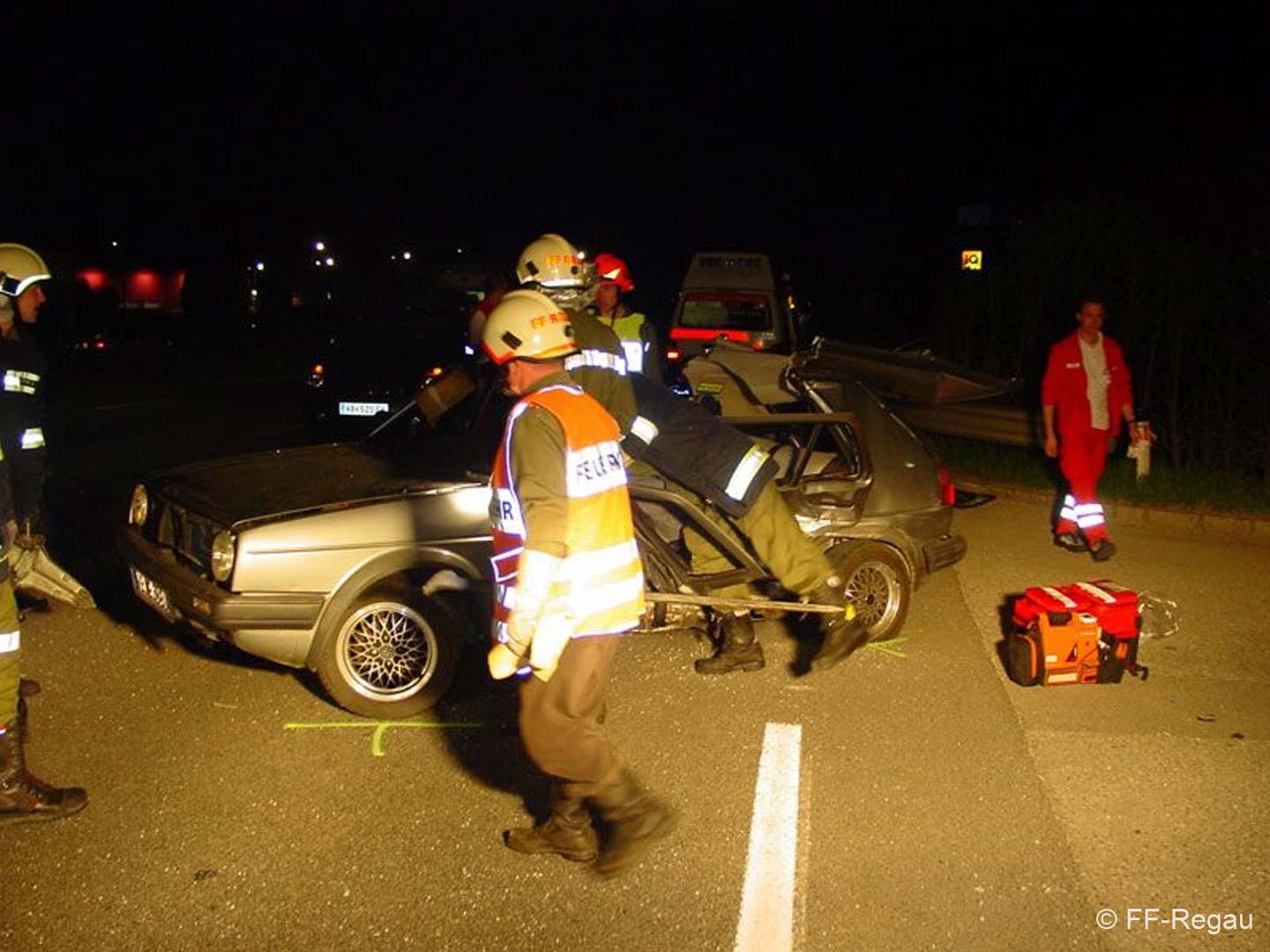 Vorbeikommende Passanten alarmierten umgehend die Einsatzkräfte der FF Regau und des Roten Kreuzes. Als wir am Unfallort eingetroffen sind, musste noch eine Person mittels hydraulischem Bergegerät aus dem Auto befreit werden. Dazu war es notwendig vorher das Dach aufzuschneiden. In Zusammenarbeit mit dem Notarzt konnte dann die verunglückte Person geborgen werden. Anschließend reinigten wir die Fahrbahn von Splittern und herumliegenden Teilen. Die Unfallfahrzeuge wurden von einem Abschleppunternehmen geborgen und abgeschleppt.