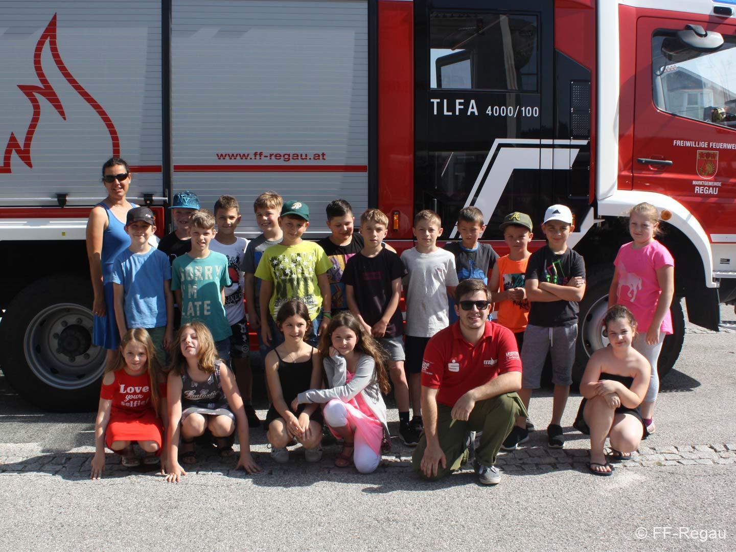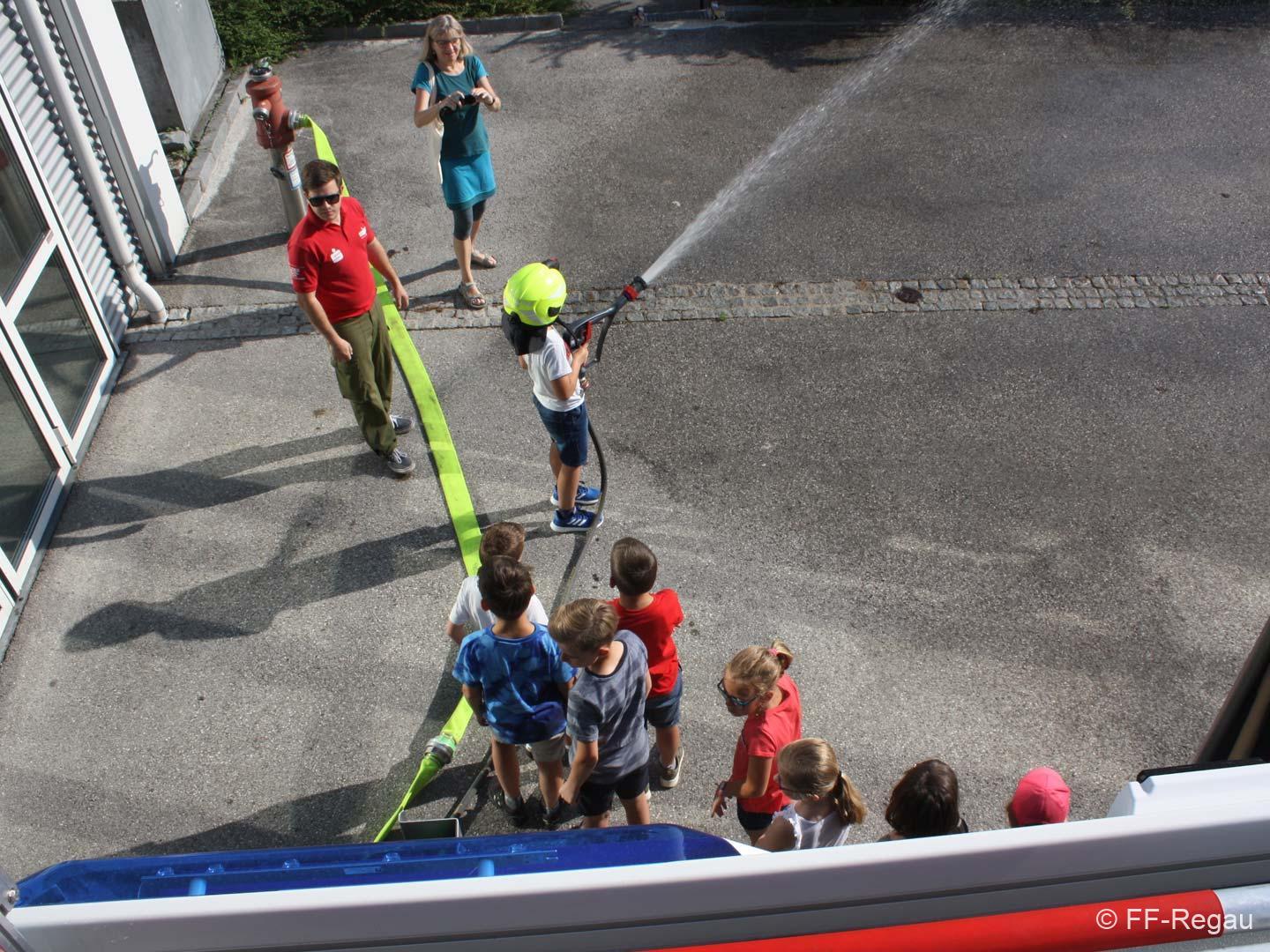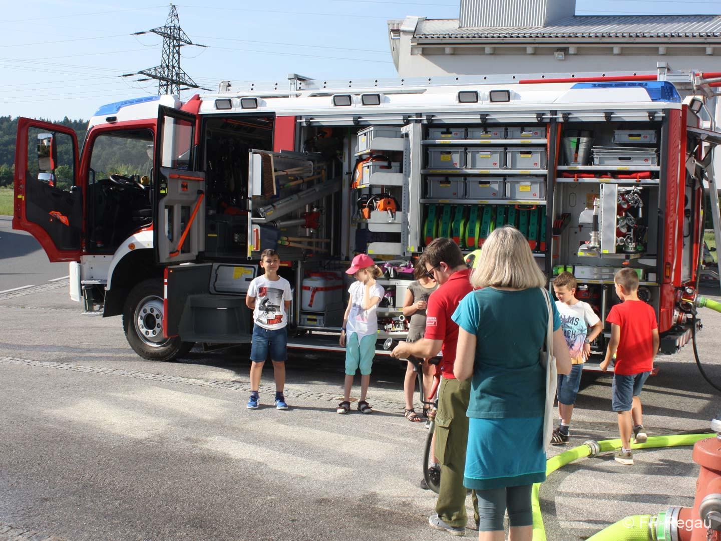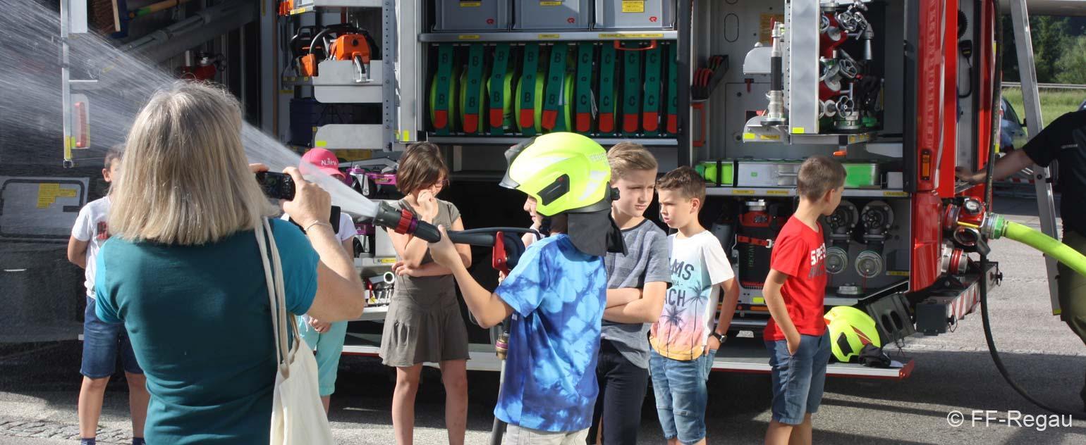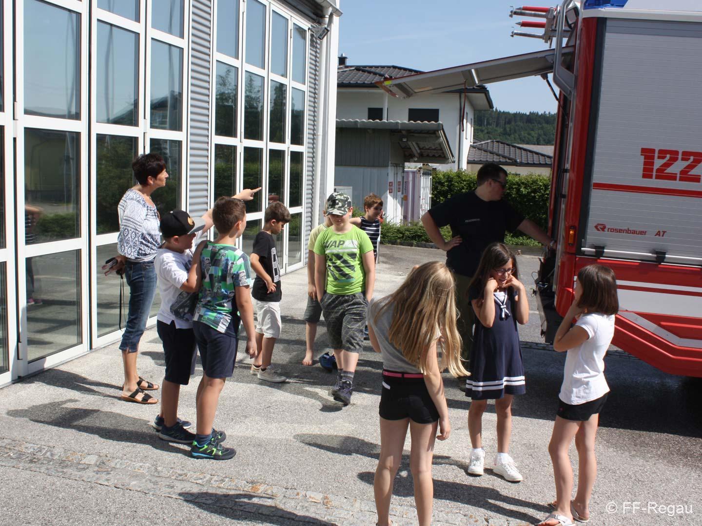 Die 3, Klassen der Volksschule Regau haben uns am 14. Juni besucht. Kommandant Christoph Staudinger freute sich, die Kinder im Feuerwehrhaus begrüßen zu dürfen, nachdem vor gut zwei Monaten ja eine Abordnung der FF bei den Schülern in der Schule war. Alles rund um das Feuerwehrwesen begeisterte die Kinder. Zu Beginn gab’s ein Video über die richtige Alarmierung und dann wurden die Gerätschaften gezeigt. Groß war dann der Eifer natürlich als die Kinder selber Hand anlegten und das Strahlrohr bedienen durften. Dazu musste ein „echter“ Feuerwehrhelm getragen werden, eh klar. Natürlich war die abschließende Fahrt mit dem Feuerwehrauto wieder der absolute Höhepunkt..