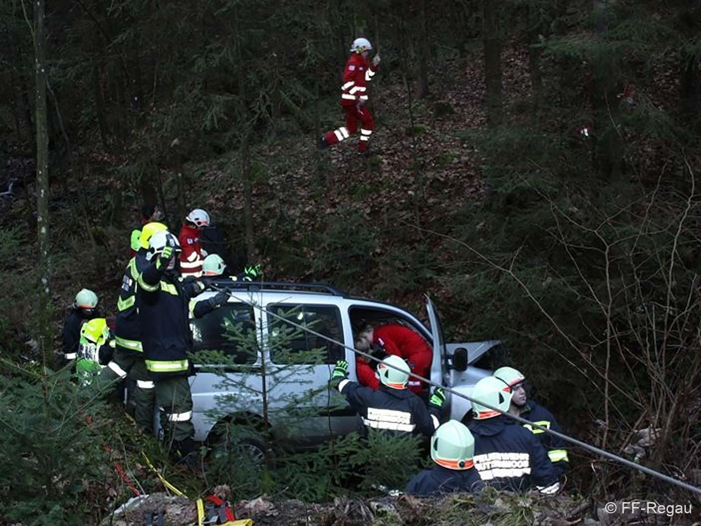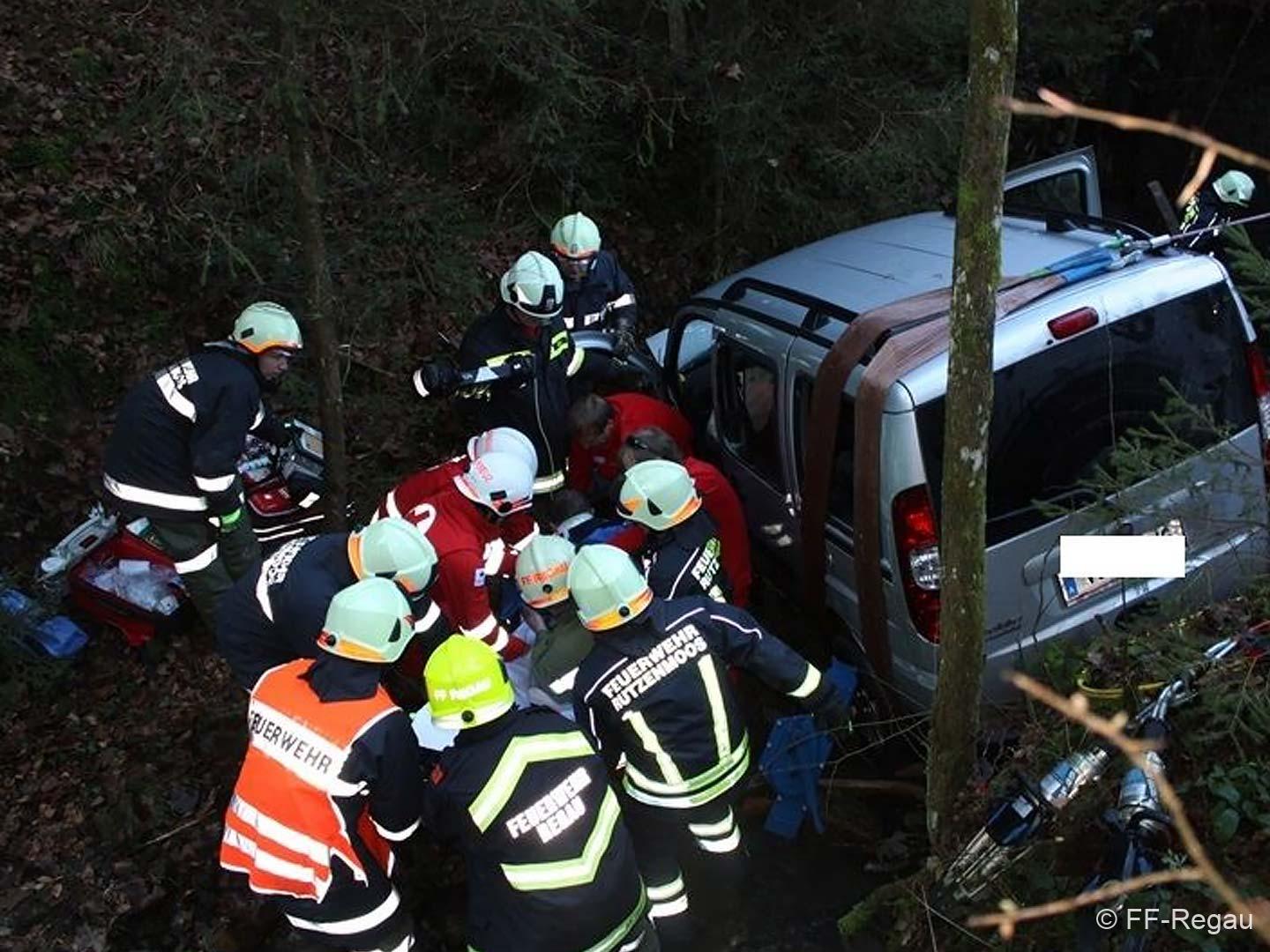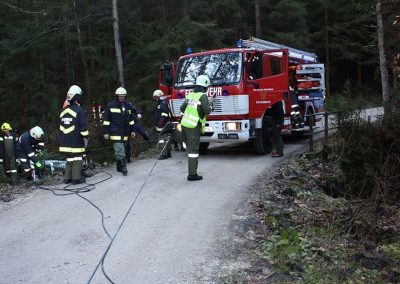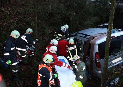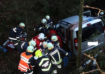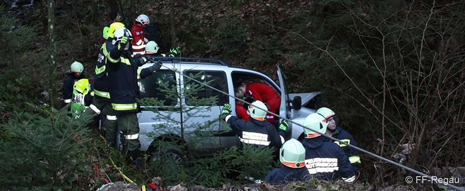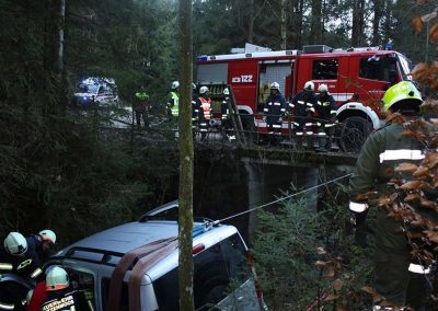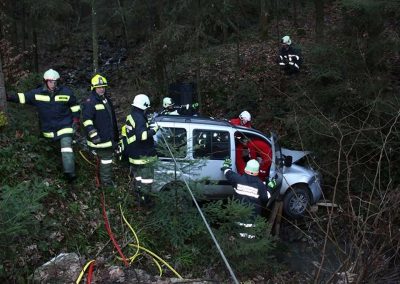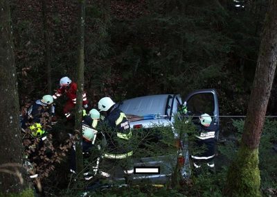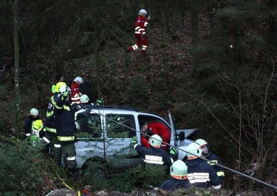 Ein PKW war auf dem Güterweg Kohlstatt Richtung Lehner im Wald unterwegs. Aus ungeklärter Ursache kam das Fahrzeug von der Fahrbahn ab und stürzte über eine Böschung. Der Unfalllenker befand sich noch im Fahrzeug und wurde vom bereits anwesenden Notarzt erstversorgt. Während wir das hydraulische Rettungsgerät in Stellung brachten wurde das Unfallfahrzeug mittels Seilwinde gesichert. Gemeinsam mit dem Notarzt wurde der verletzte Lenker geborgen. Der ebenfalls verletzte Beifahrer der im Schock den Unfallort verlassen hatte wurde nach seinem Auffinden vom Roten Kreuz versorgt. Die Bergungsarbeiten des Unfallfahrzeuges wurden von der FF-Rutzenmoos durchgeführt.