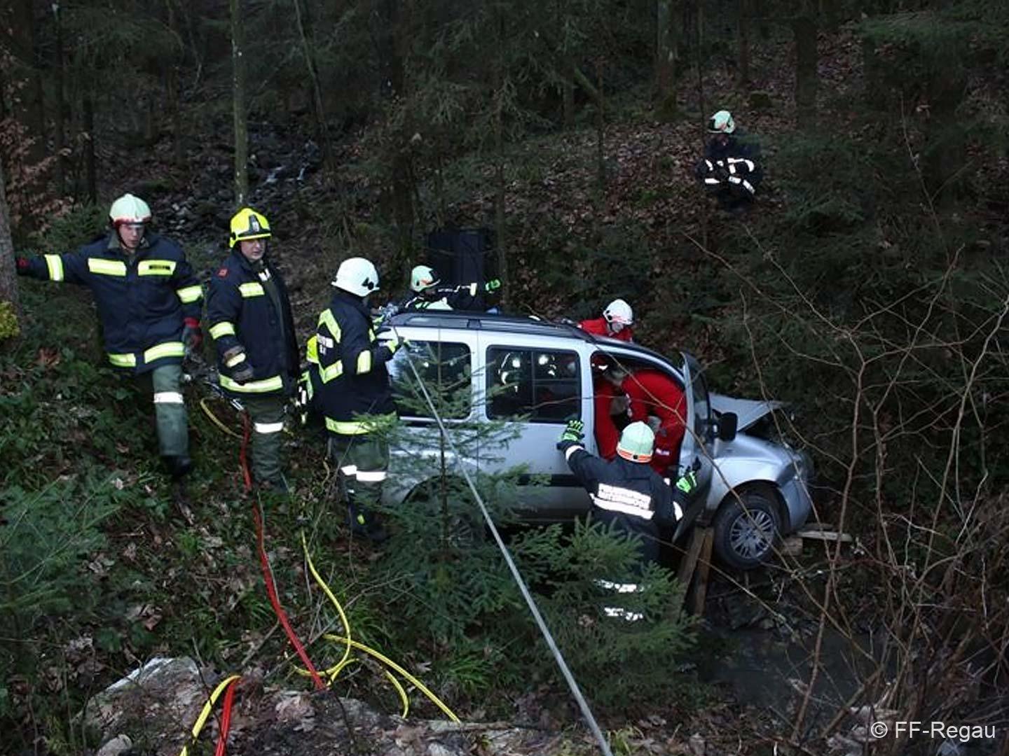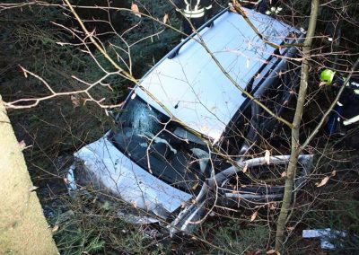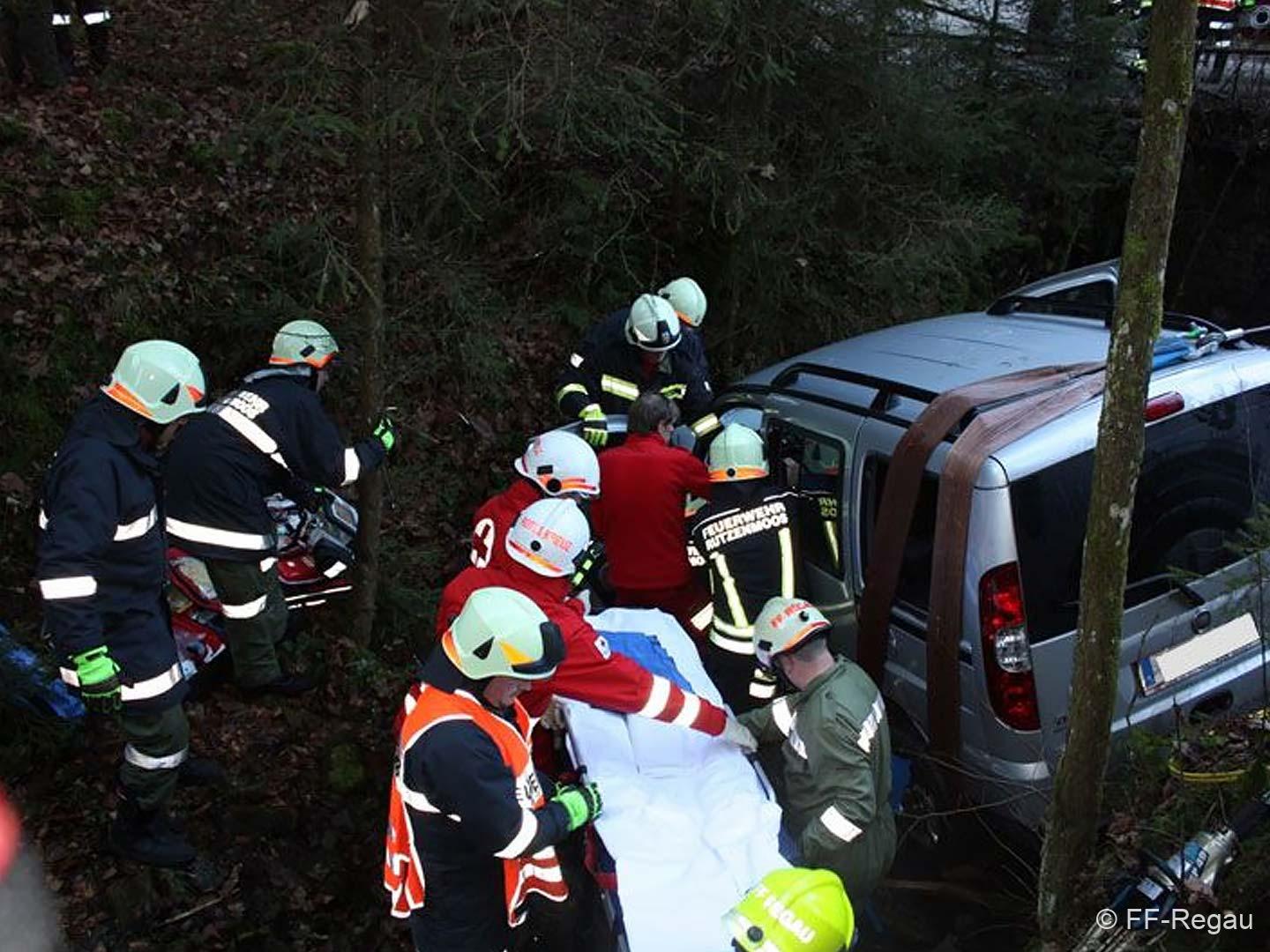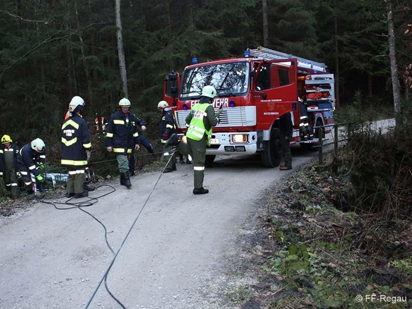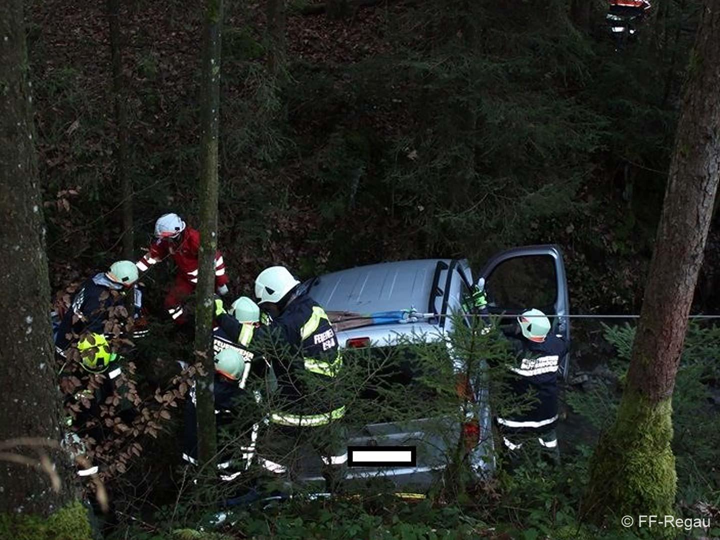 Ein PKW war auf dem Güterweg Kohlstatt Richtung Lehner im Wald unterwegs. Aus ungeklärter Ursache kam das Fahrzeug von der Fahrbahn ab und stürzte über eine Böschung. Der Unfalllenker befand sich noch im Fahrzeug und wurde vom bereits anwesenden Notarzt erstversorgt. Während wir das hydraulische Rettungsgerät in Stellung brachten wurde das Unfallfahrzeug mittels Seilwinde gesichert. Gemeinsam mit dem Notarzt wurde der verletzte Lenker geborgen. Der ebenfalls verletzte Beifahrer der im Schock den Unfallort verlassen hatte wurde nach seinem Auffinden vom Roten Kreuz versorgt. Die Bergungsarbeiten des Unfallfahrzeuges wurden von der FF-Rutzenmoos durchgeführt.