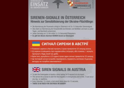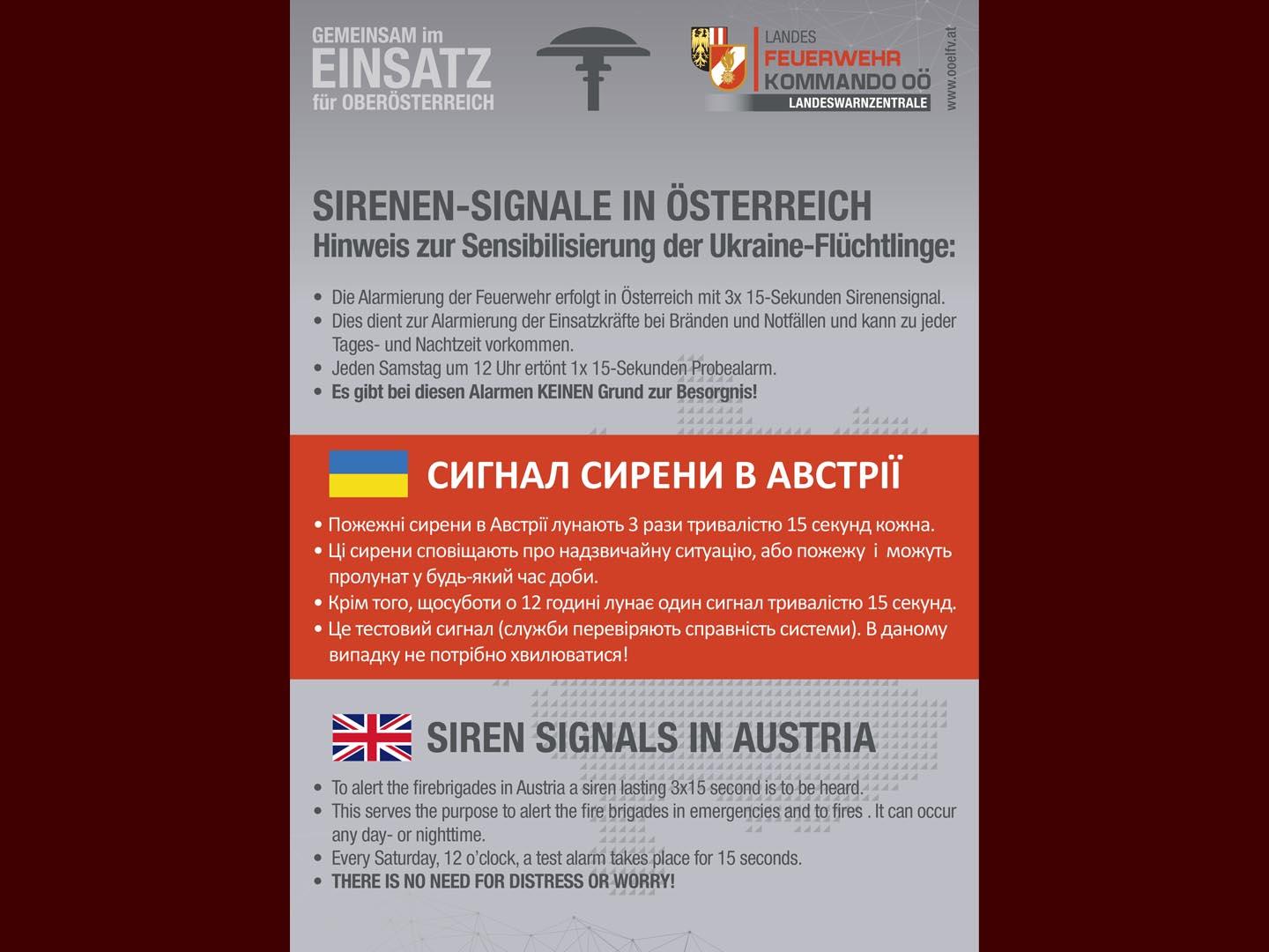 Das Landes-Feuerwehrkommando OÖ informiert mittels beiliegender Grafik und in ukrainischer Sprache über die gängigen Sirenen-Signale in Österreich und dass diese in der Regel kein Problem darstellen.