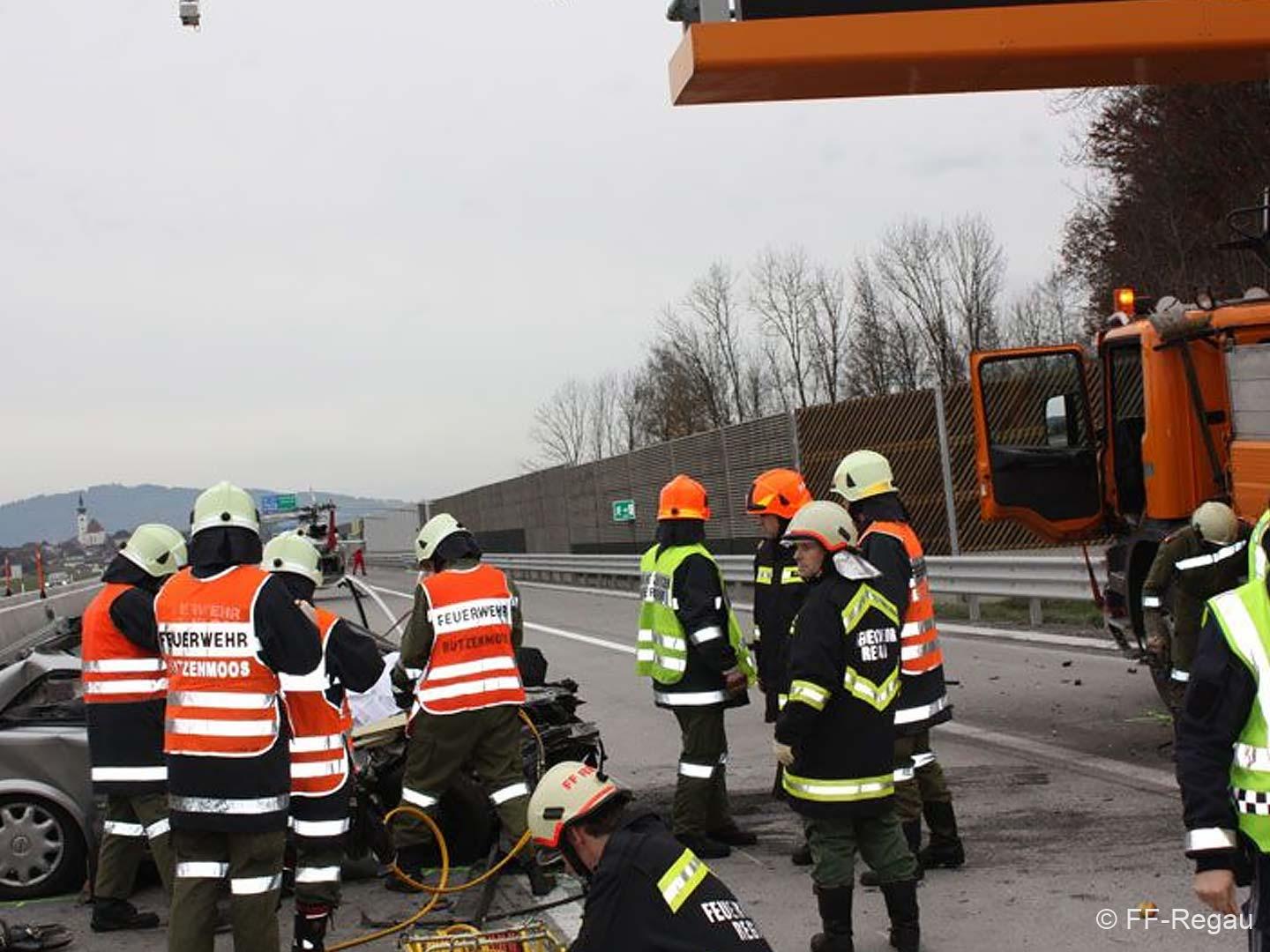 Als wir am Einsatzort ankamen, waren bereits drei Personen aus dem Fahrzeug geborgen und wurden schon von der Rettung bzw. Notärzten versorgt. Weiters waren auch schon zwei Notarzthubschrauber vor Ort. Die vierte Person war noch im Fahrzeug eingeklemmt, aber leider bereits tot. Mit hydraulischem Bergegerät wurde die Tote dann geborgen. Die drei Verletzten wurden in die Krankenhäuser nach Salzburg und Vöcklabruck geflogen bzw. gefahren. Eine dieser Personen ist am Abend dann leider auch noch ihren Verletzungen erlegen. Die anschließenden Aufräumarbeiten wurden von der FF Rutzenmoos durchgeführt.