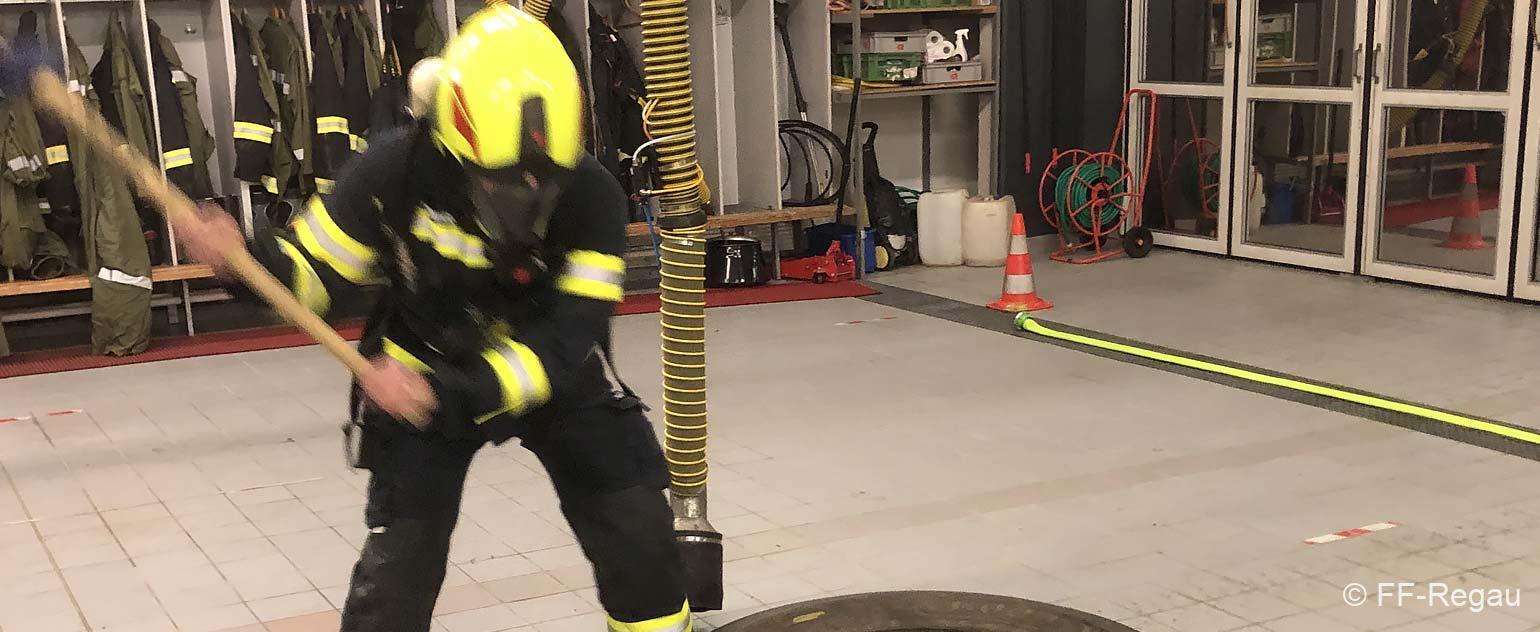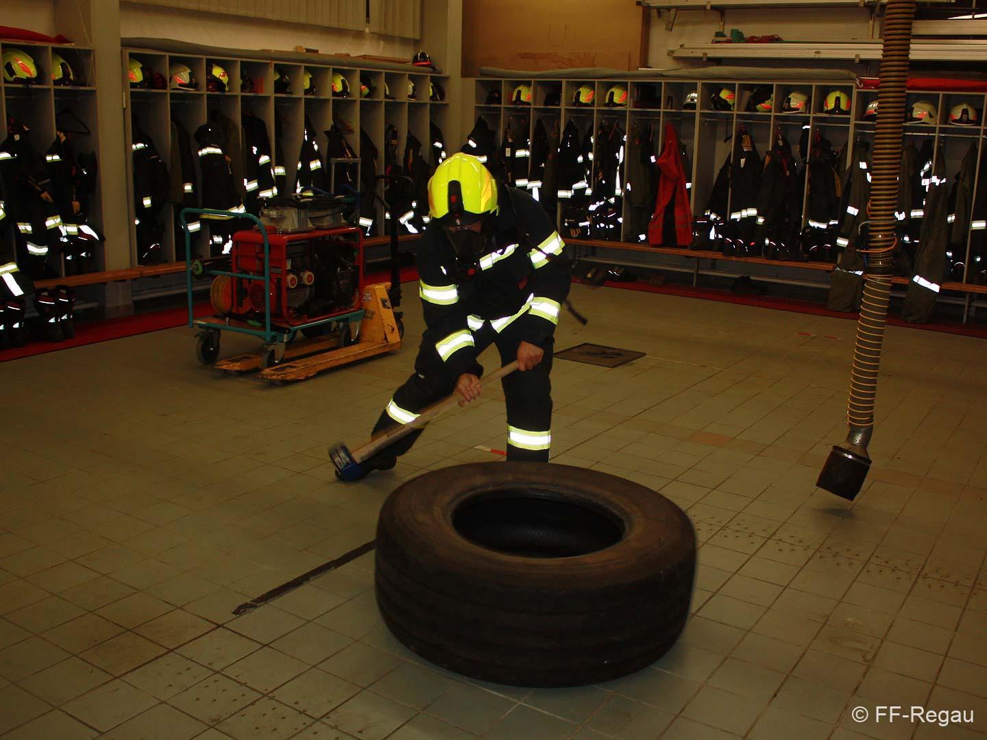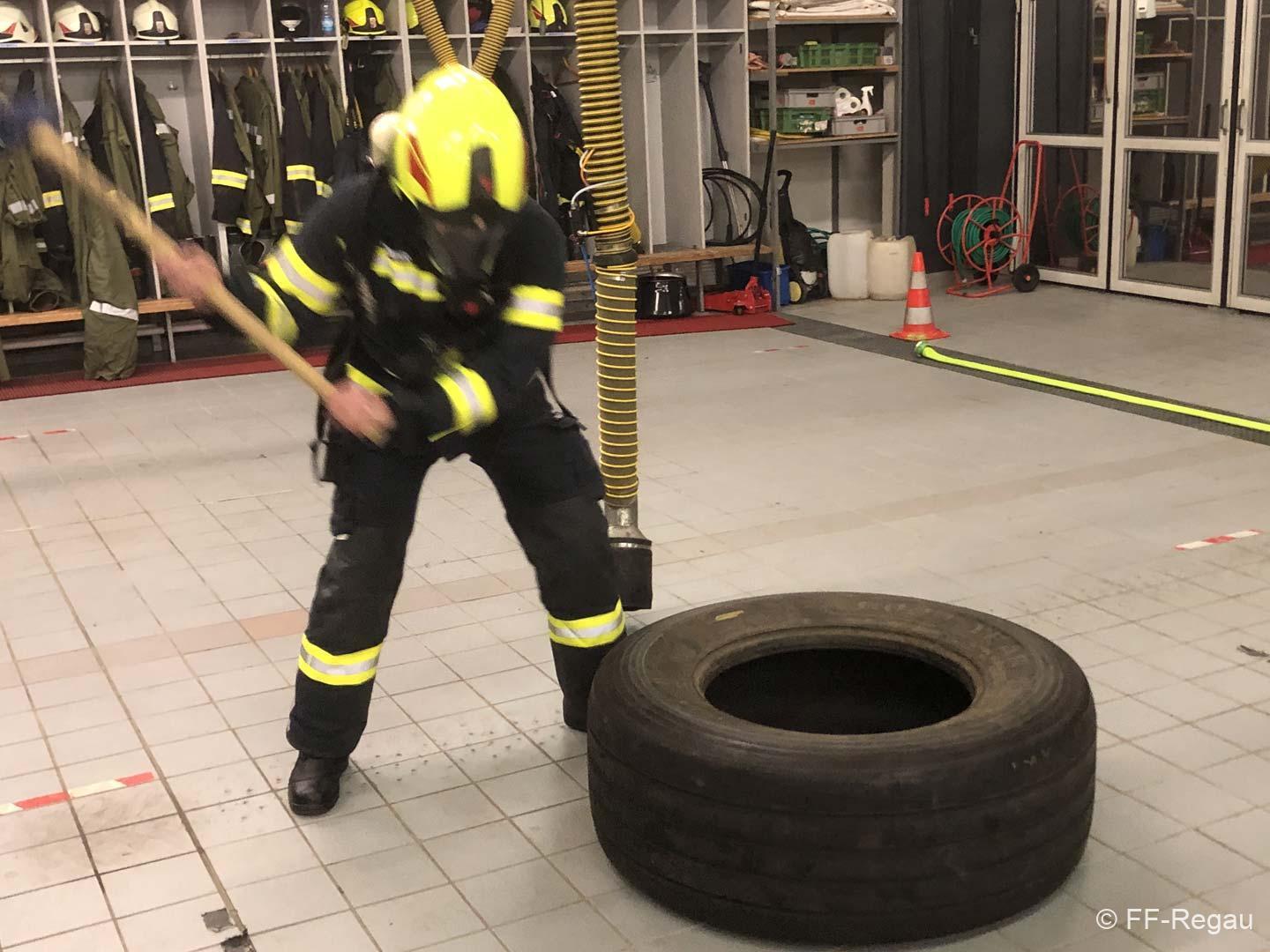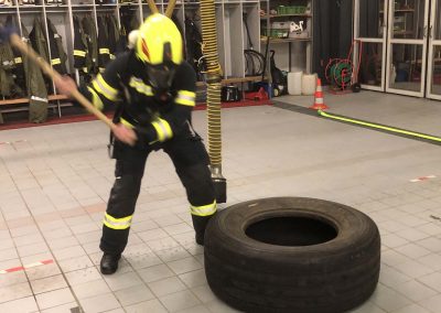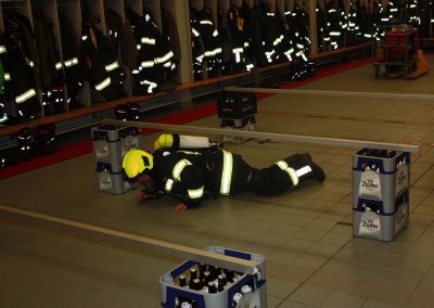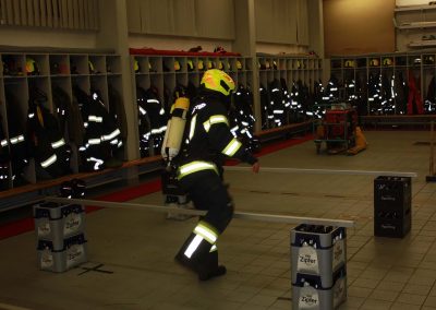 An fünf Stationen wird der Atemschutzträger. Beim Test wird festgestellt, ob neben der gesundheitlichen Eignung auch die für schweren Atemschutz erforderlichen körperlichen Voraussetzungen wie Kraft, Ausdauer, Motorik, Koordinationsvermögen unter Belastung, gegeben sind.
