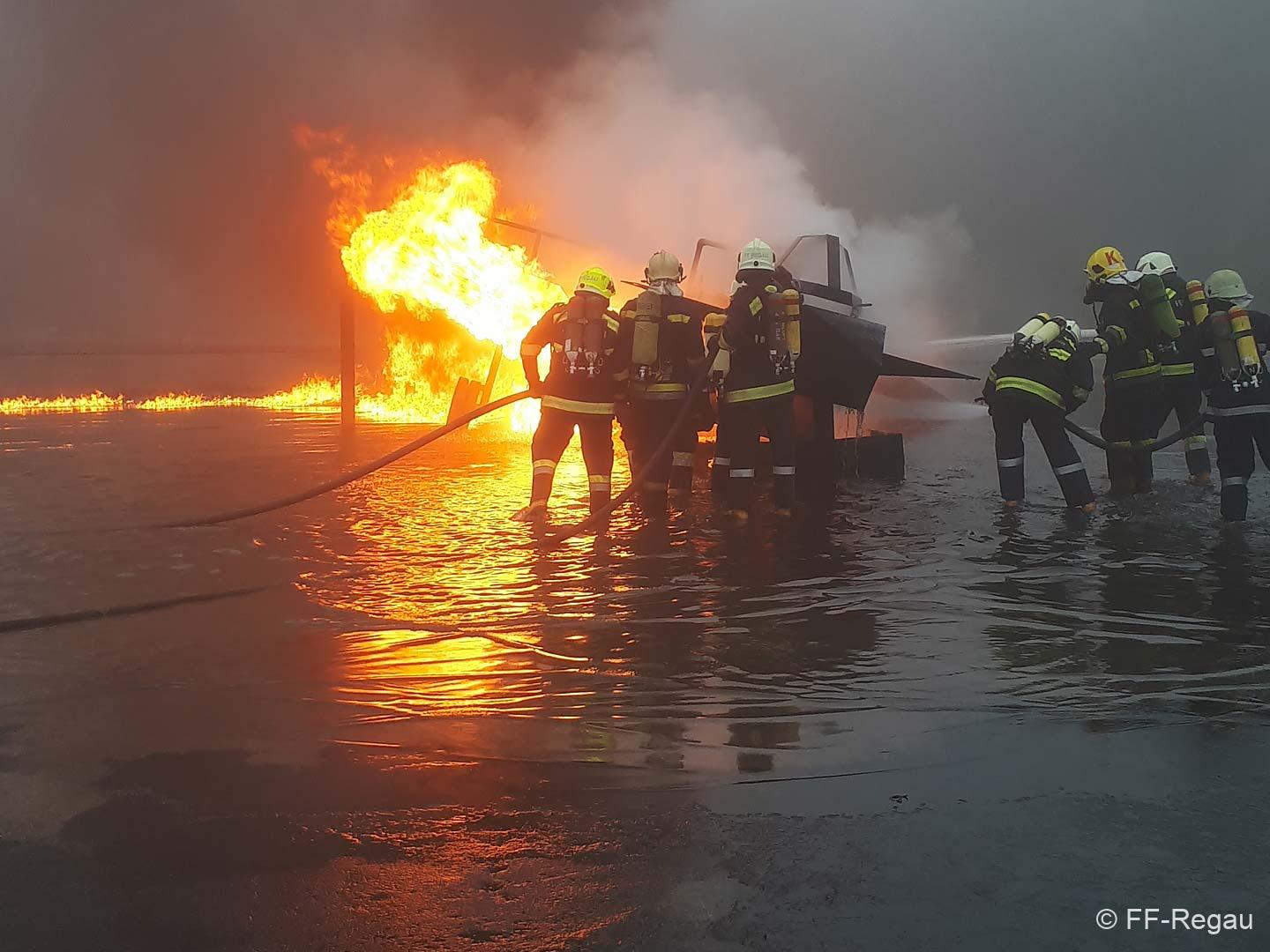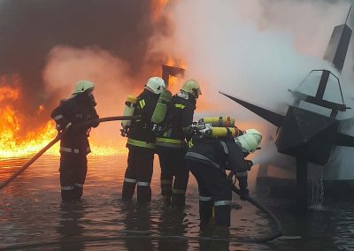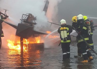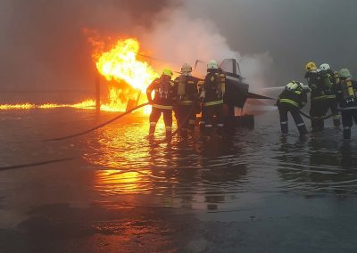 Es folgten dann am Nachmittag die Einsätze bei den Flugzeugattrappen. In abwechselnden Besetzungen konnten mehrere Szenarien abgearbeitet werden. Ausgangslage waren immer Brände von Luftfahrzeugen, um unterschiedliche Löschtechniken mit Wasser zu exerzieren.