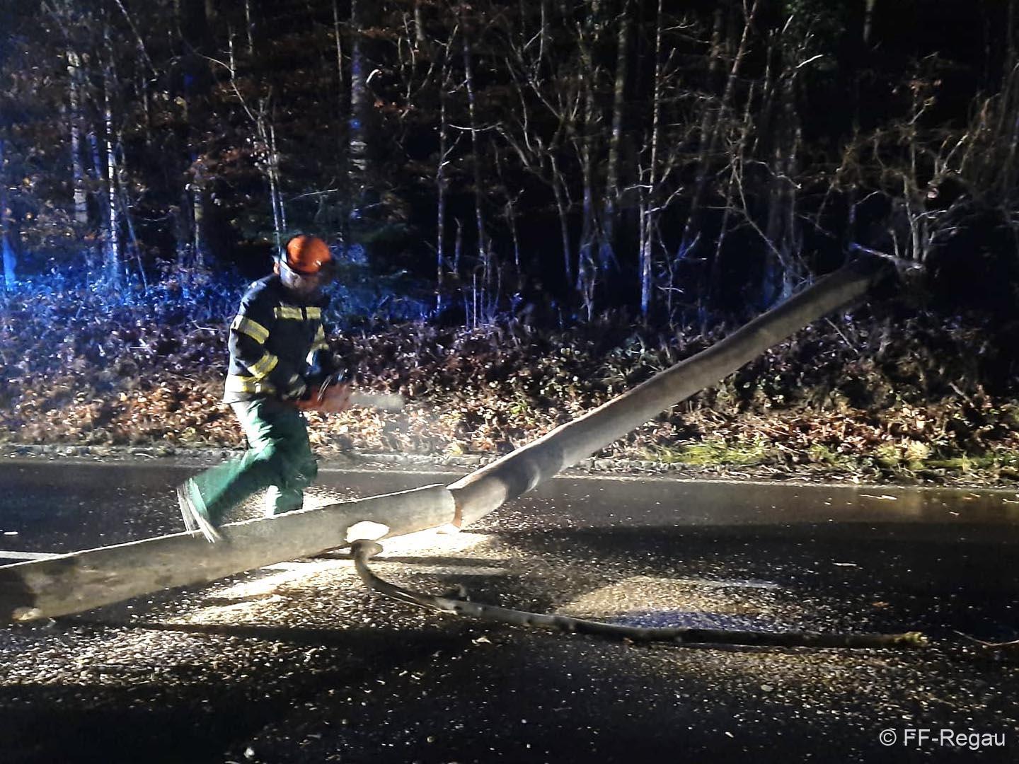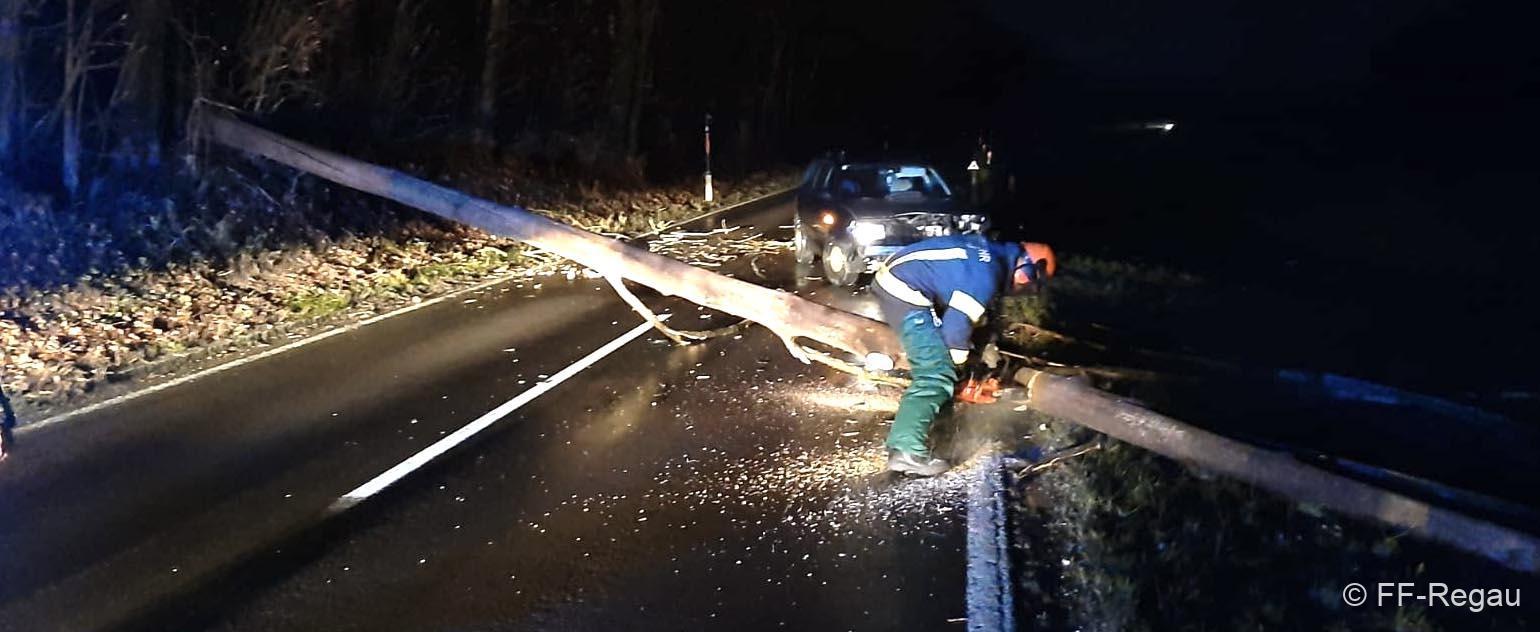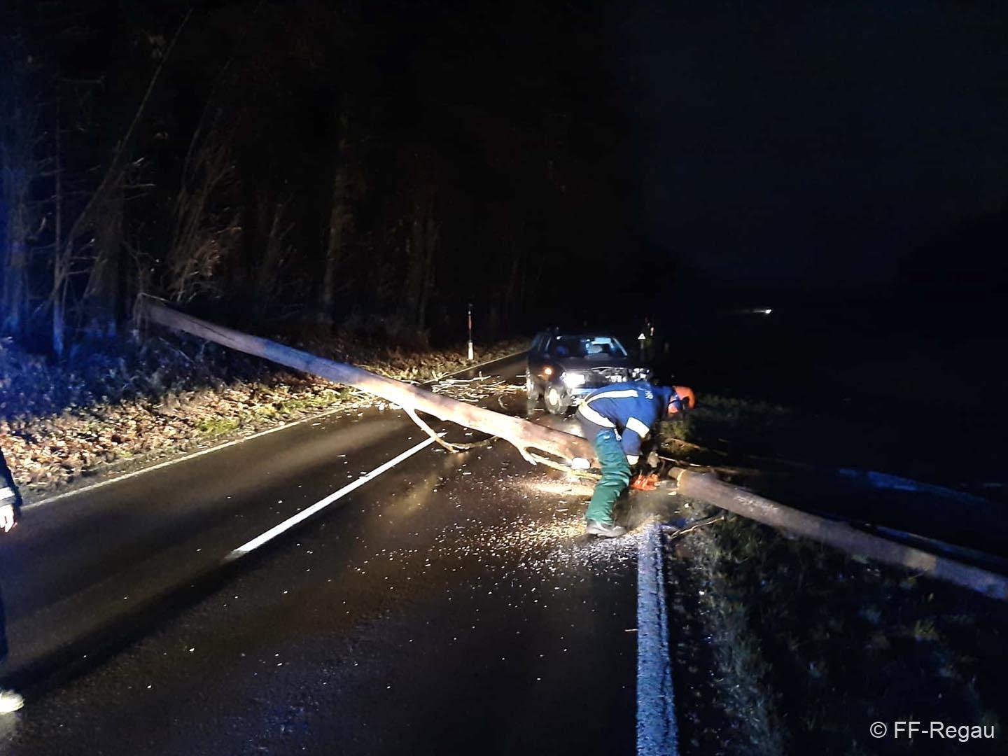 Auf der Schörflinger Bezirksstraße war Höhe Abzweigung Zaissing ein Baum über die Strasse gefallen. Ein PKW konnte nicht mehr rechtzeitig anhalten und prallte gegen den Baum.