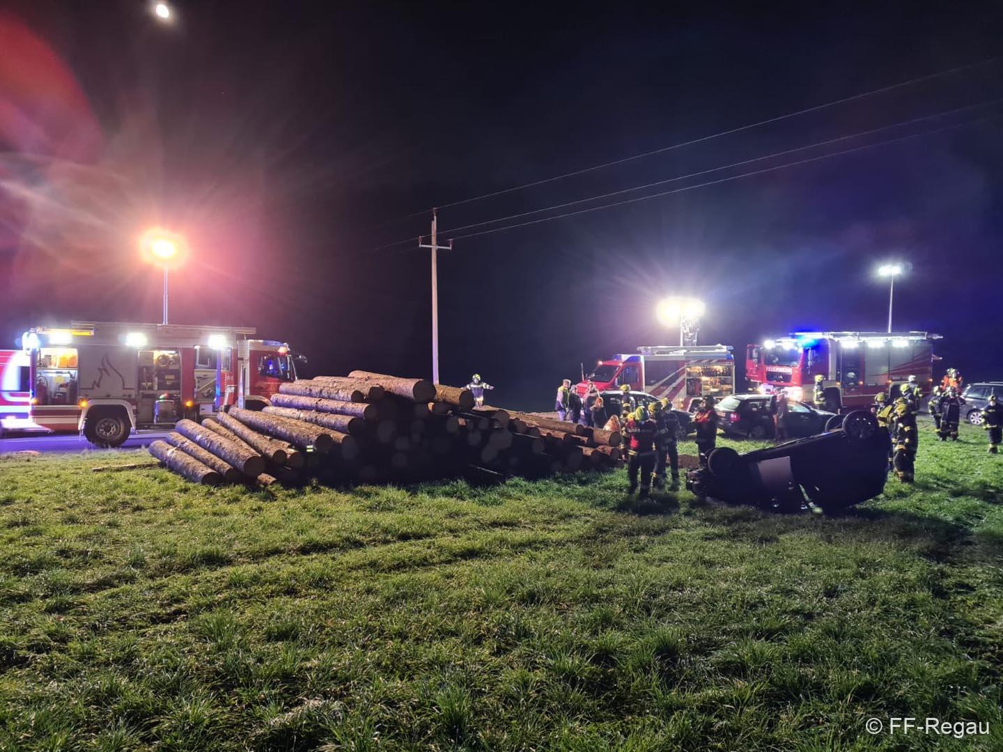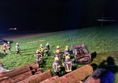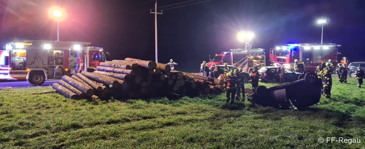 Bei der Einfahr nach Aurach, kurz vor der Ortschaft Grafenbuch, ist ein PKW beim Abbiegen von der Fahrbahn abgekommen und hat sich, nachdem das Fahrzeug über einen Holzstoss gefahren ist, in weiterer Folge überschlagen.