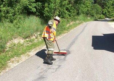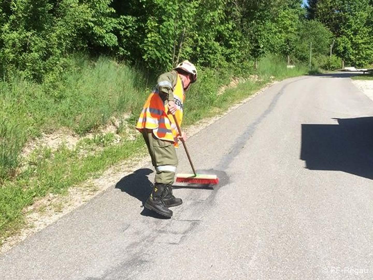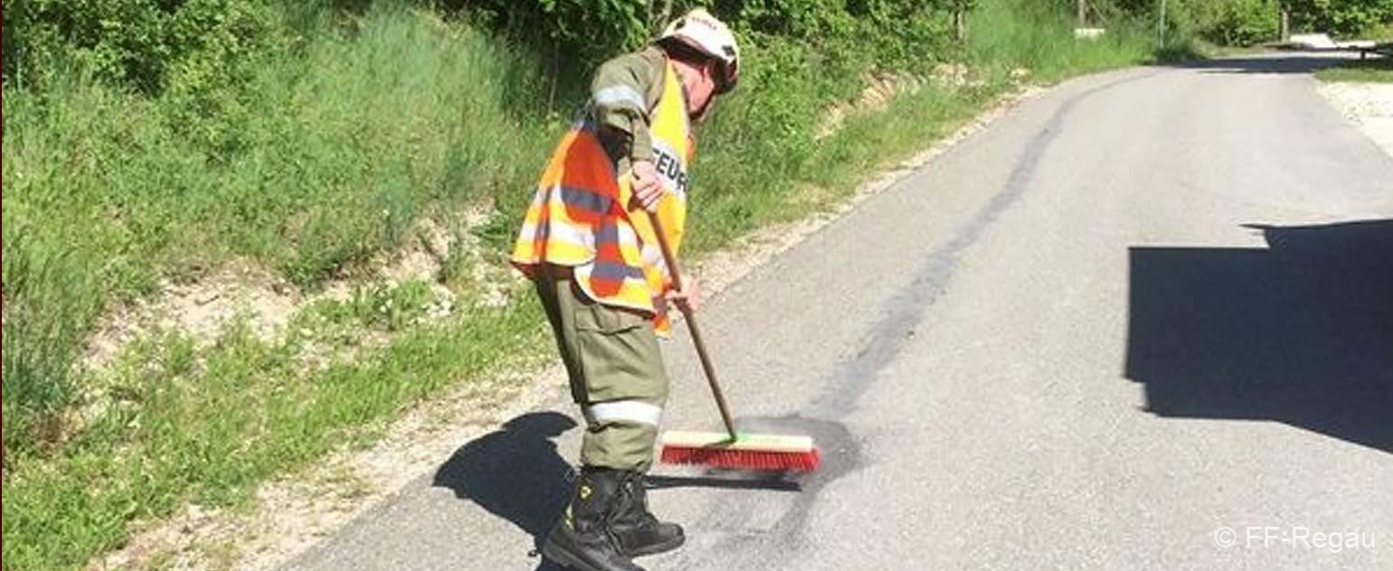 Auf der Zufahrt zum Badesee hat aus ungeklärter Ursache ein Fahrzeug auf der Fahrbahn Öl verloren. Wir haben das ausgeflossene Öl mit Bindemittel gebunden und die Fahrbahn gereinigt.