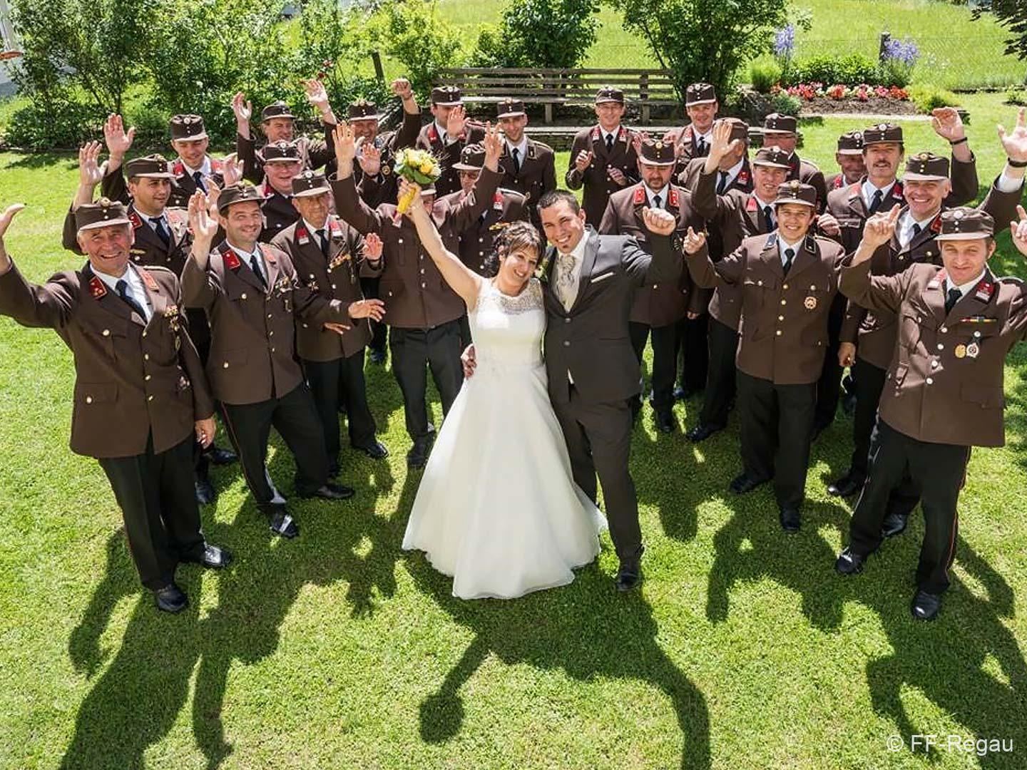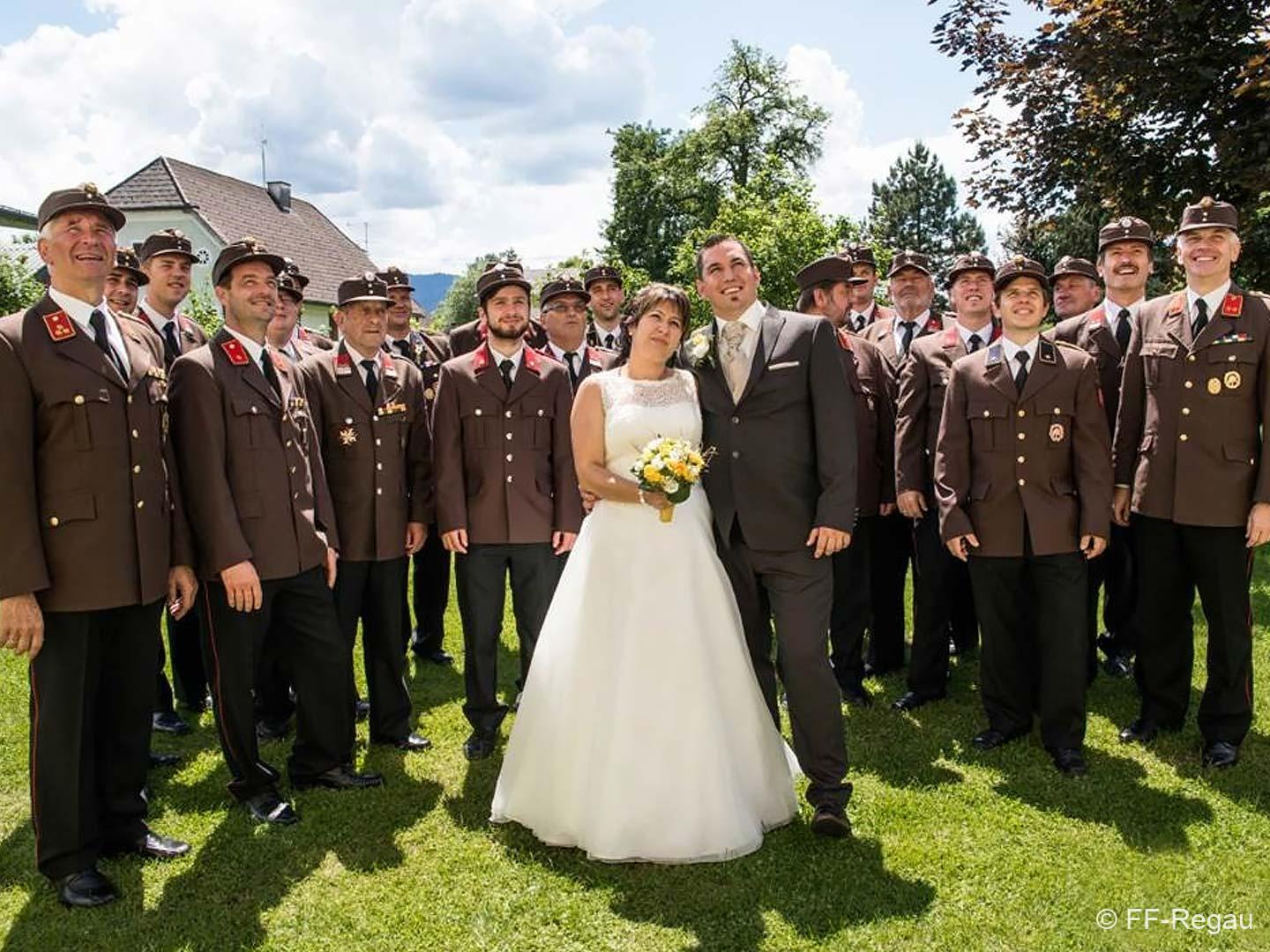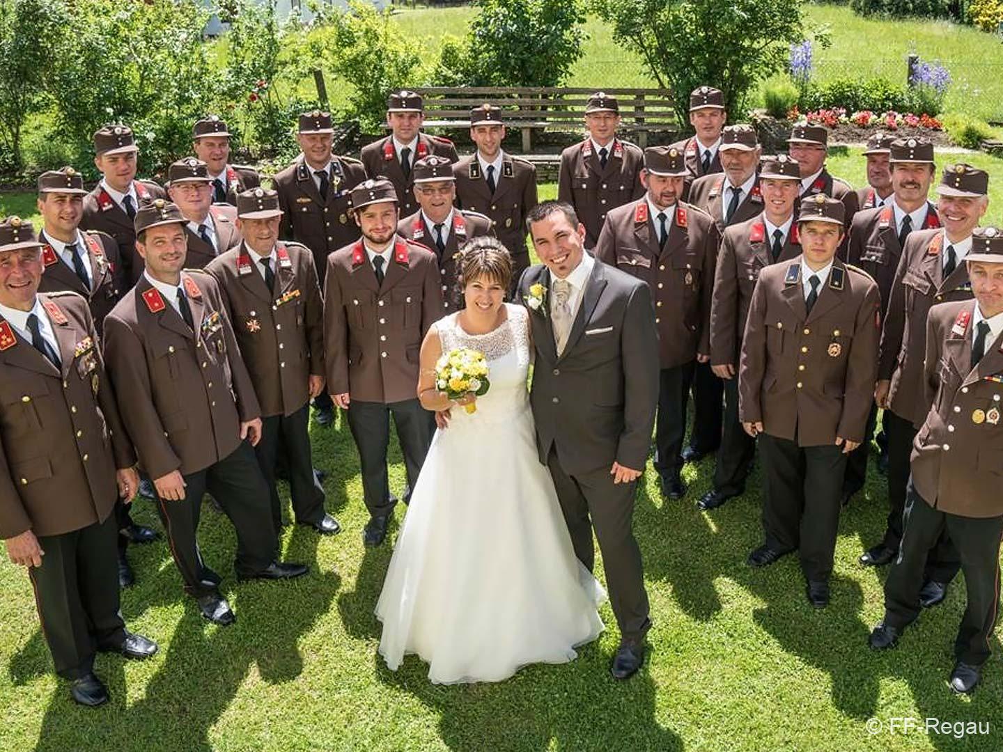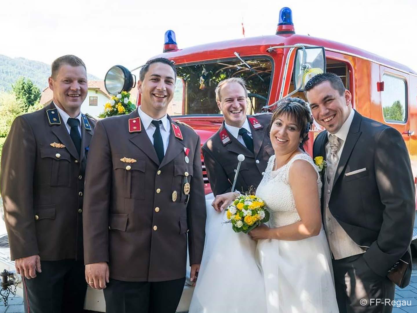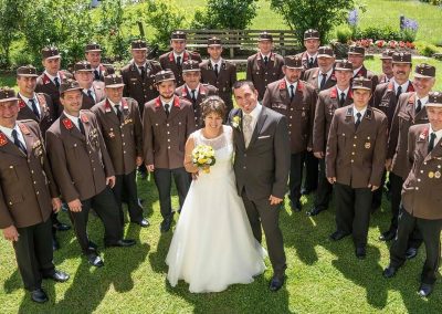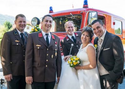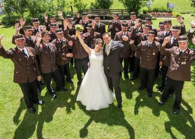 Peter und Sepp (Chauffeur und Fahrzeugkdt) brachten das Paar mit unserem „Brautfahrzeug – MTF Steyr 380“ sicher zur Kirche und zum Gasthaus.