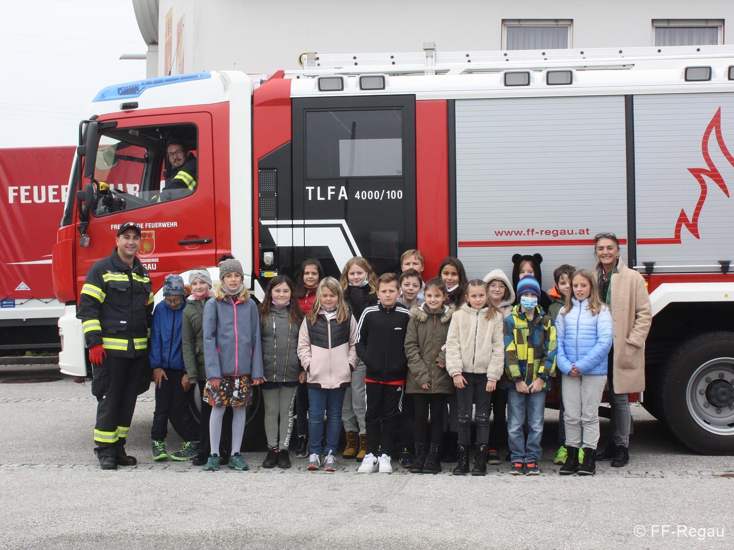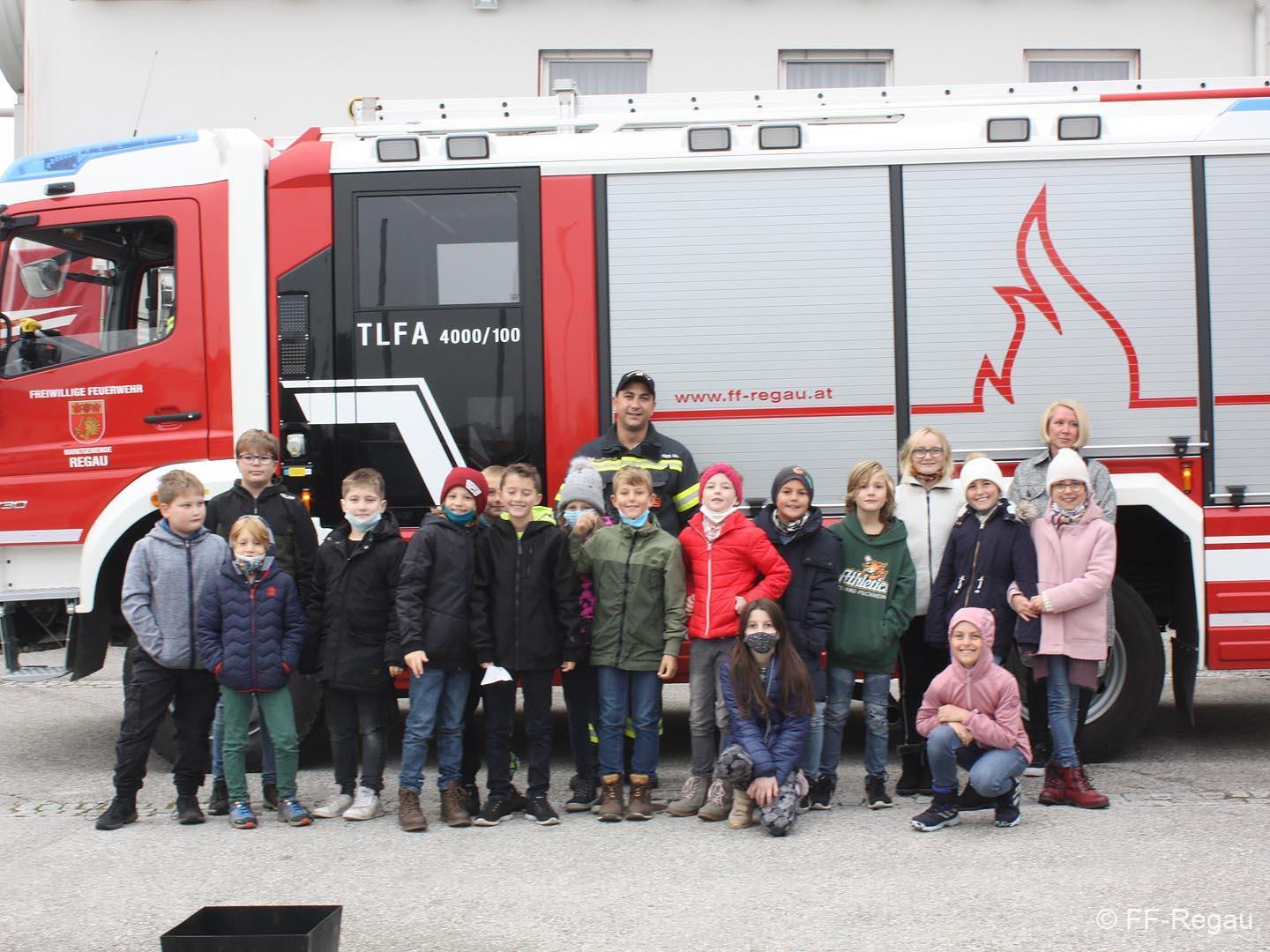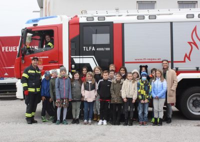 Abschließend gab es noch die Fahrt mit den Feuerwehrfahrzeugen zurück zur Volksschule. Das war natürlich nicht minder spektakulär als die Feuerlöscherübung!