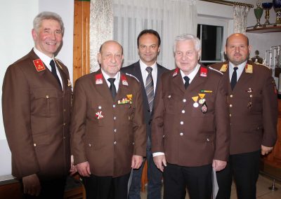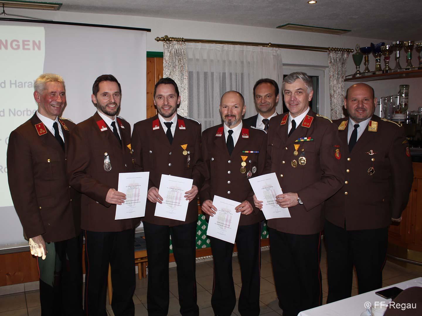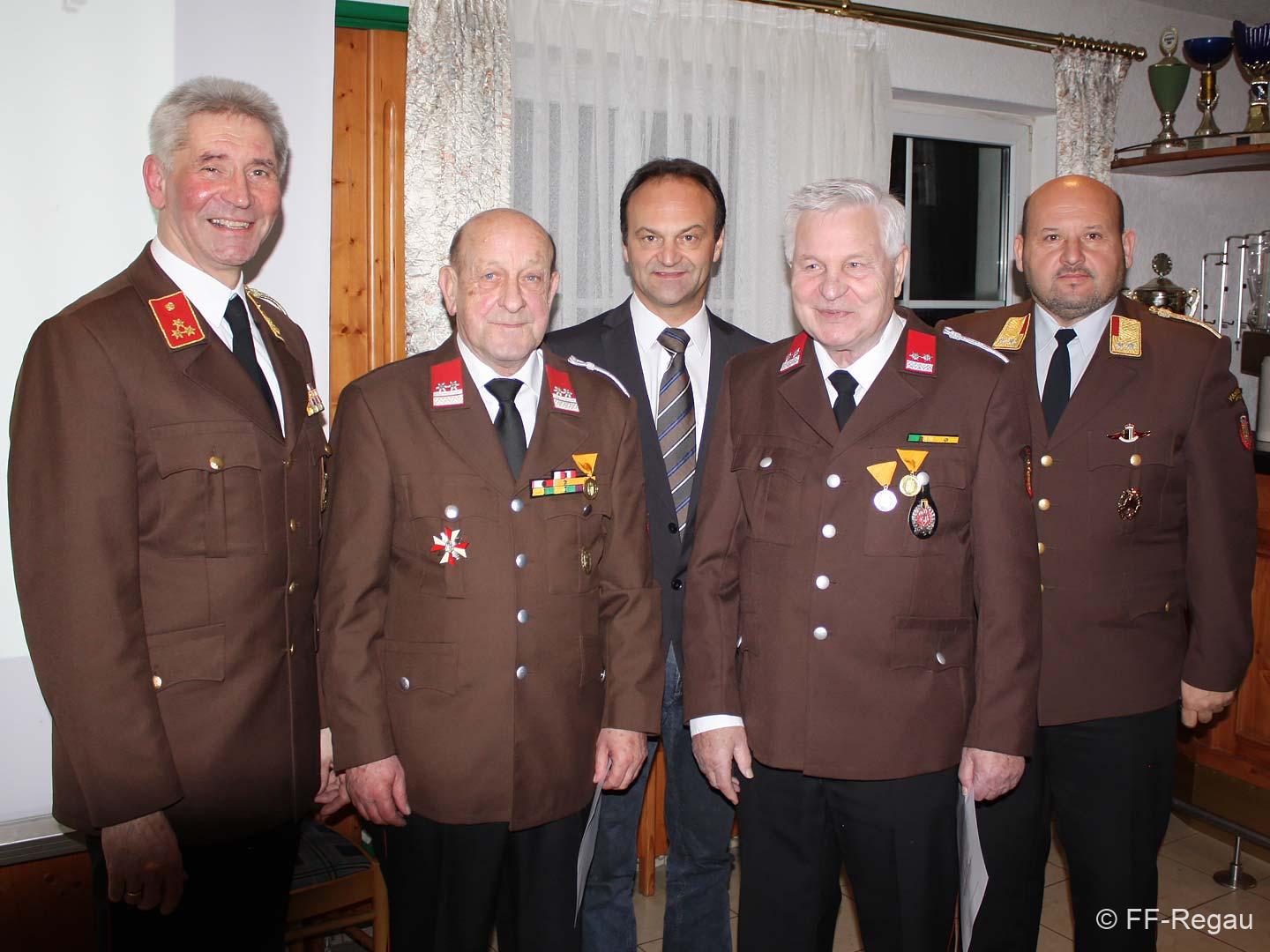 Für 25 Jahre im Dienst der FF Regau wurden Harald und Norbert Bauernfeind, OBI Gerhard Staudinger und Roman Stiedl geehrt. Für 50 Jahre Leitner Franz und Ladislaus Zabukovnik. Als erste Gratulanten stellten sich neben Kdt. Staudinger, Bürgermeister Peter Harringer und Abschnittskommandant Alois Lasinger ein!