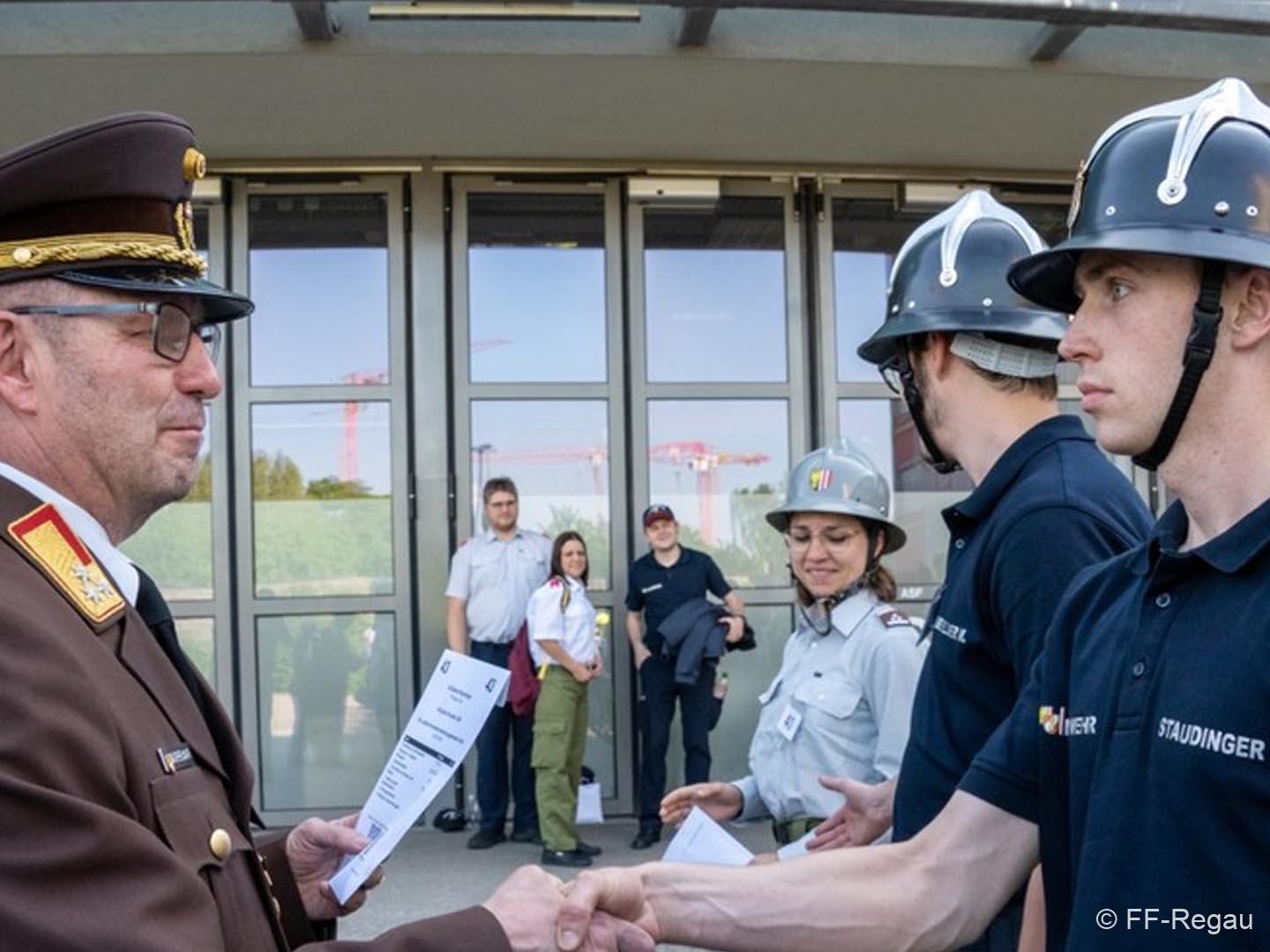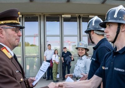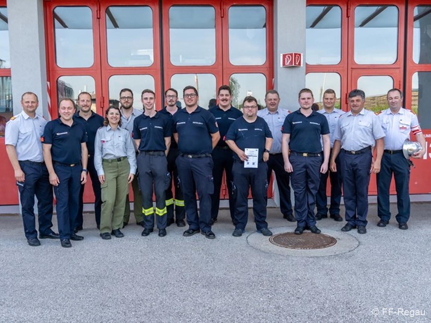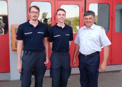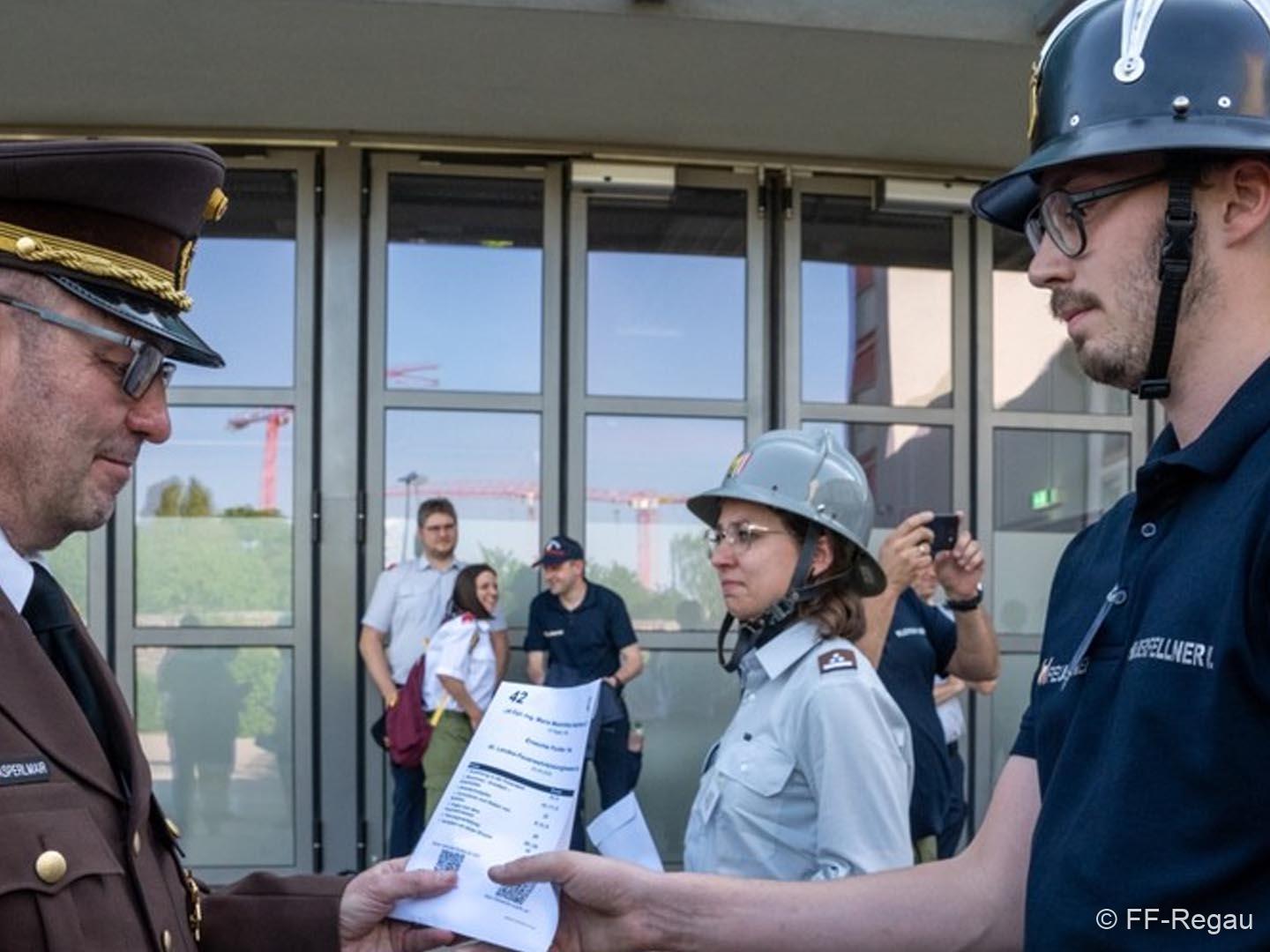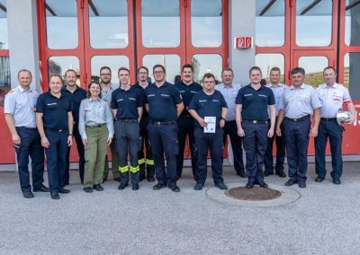 Verhalten vor einer Gruppe (Exerzieren einer Gruppe als Kommandant)ach monatelangen intensiven Vorbereitungen haben die beiden die Prüfung erfolgreich abgelegt und das FLA in Gold – die sog.Feuerwehrmatura – erfolgreich bestanden!
