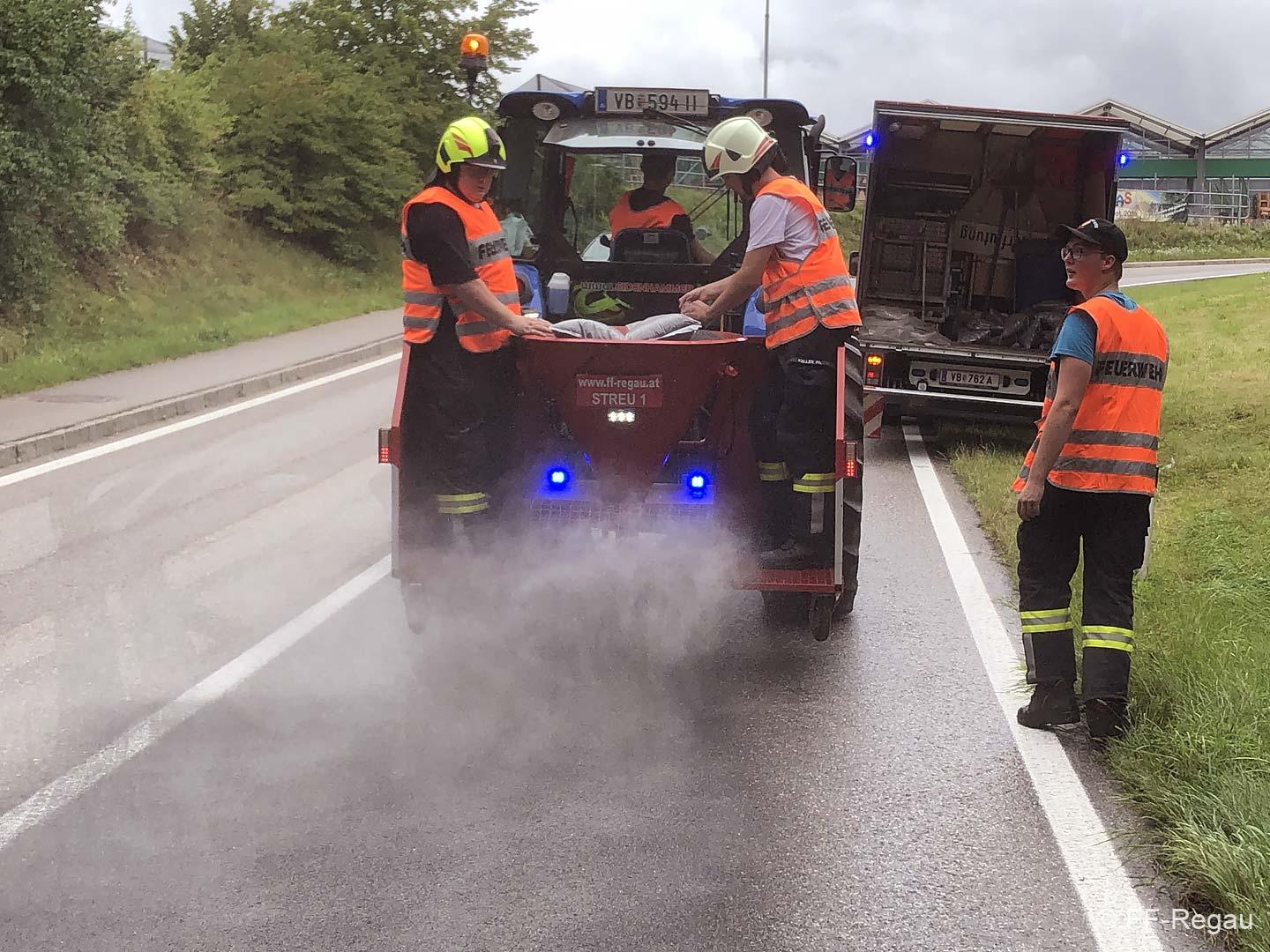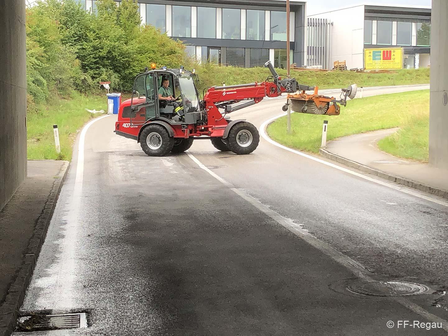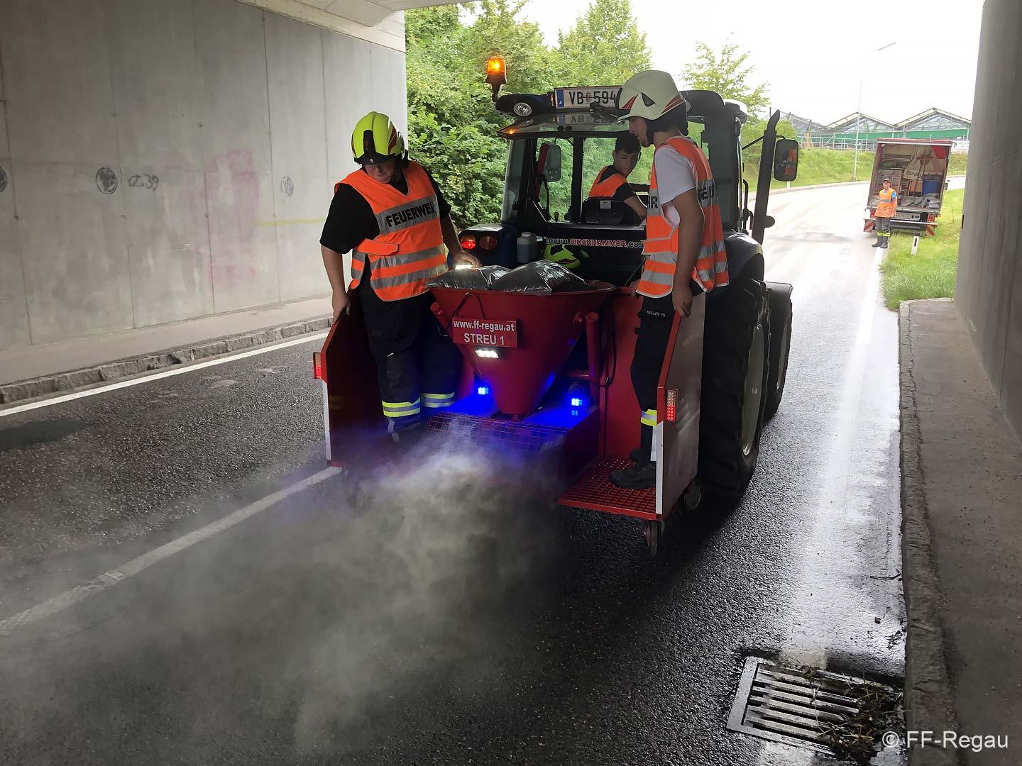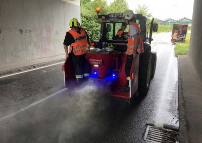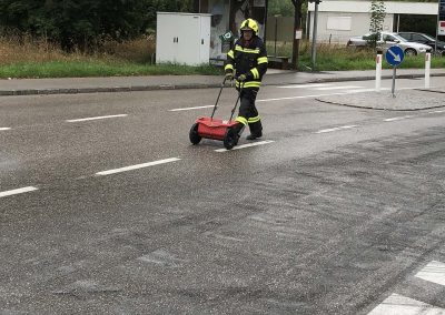 Eine weitere große Hilfe war unser „Streu 1“, mit dem wir das Bindemittel schnell auftragen und verteilen konnten. Auch eine Kehrmaschine eines privaten Unternehmens erleichterte die Aufräumarbeiten wesentlich.