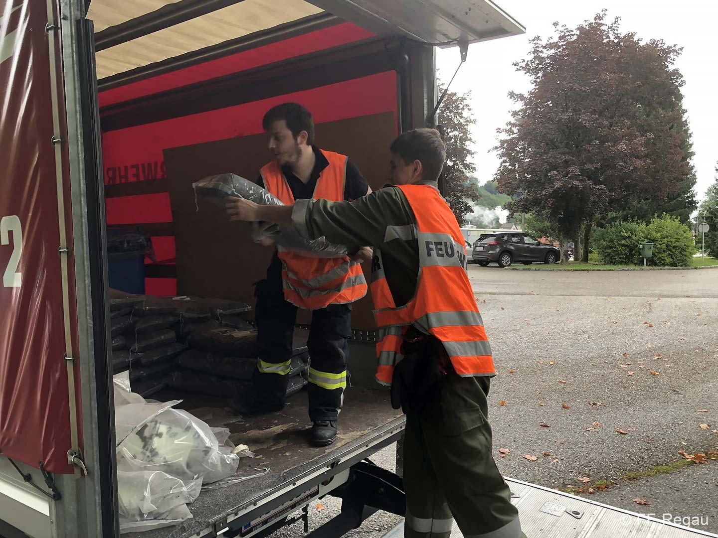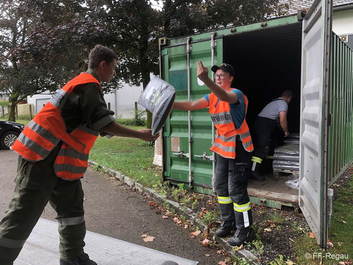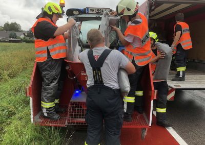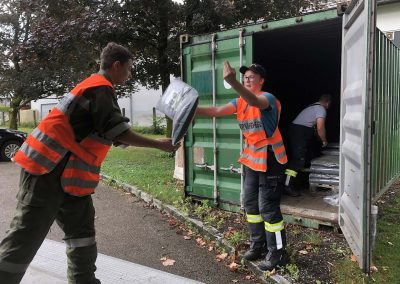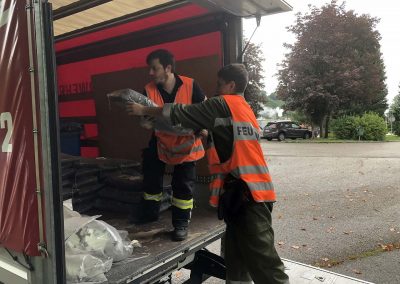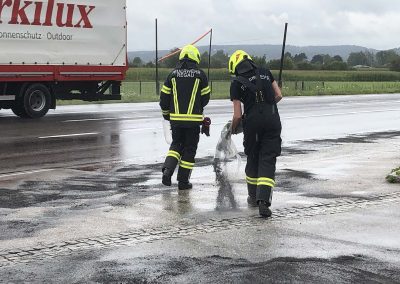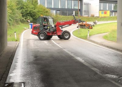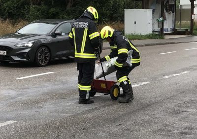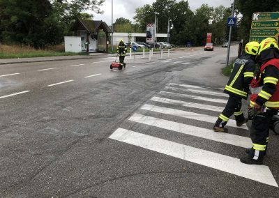 Eine weitere große Hilfe war unser „Streu 1“, mit dem wir das Bindemittel schnell auftragen und verteilen konnten. Auch eine Kehrmaschine eines privaten Unternehmens erleichterte die Aufräumarbeiten wesentlich.
