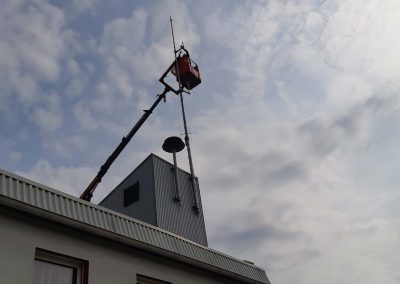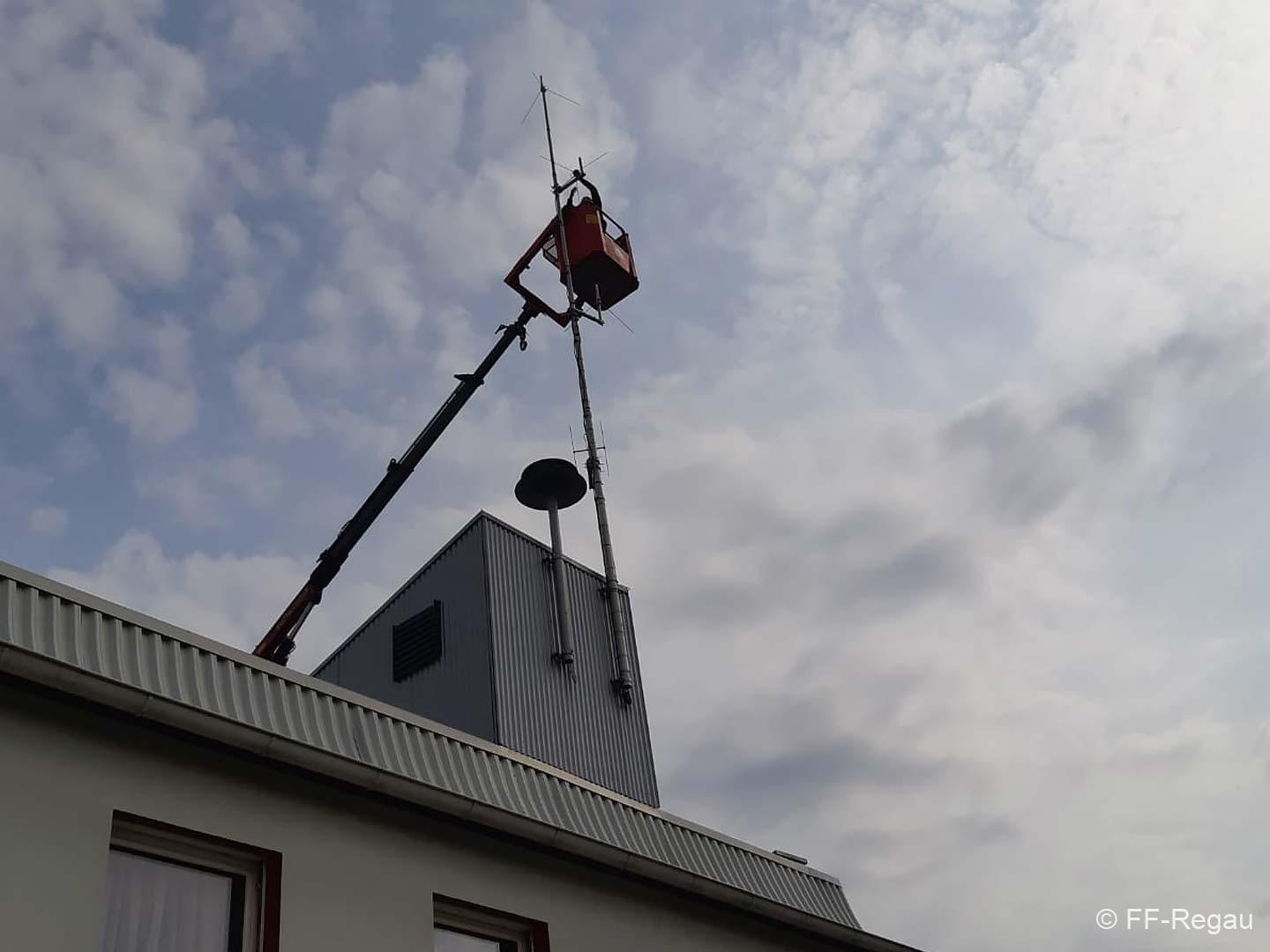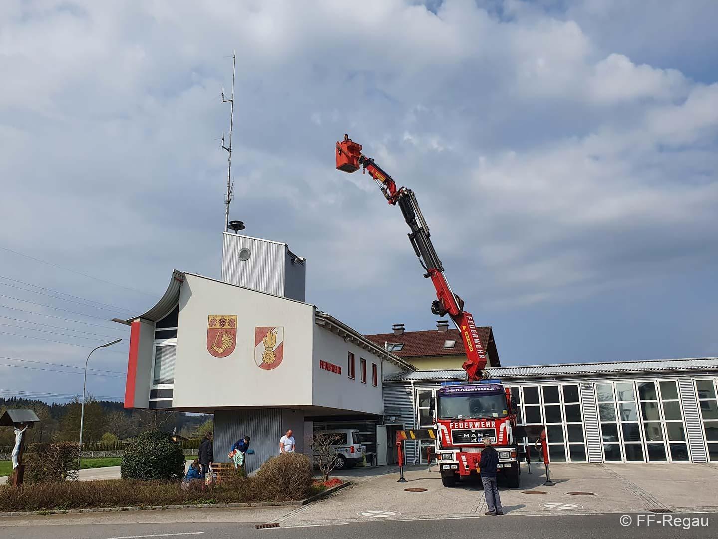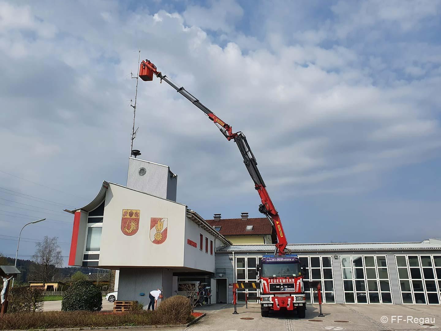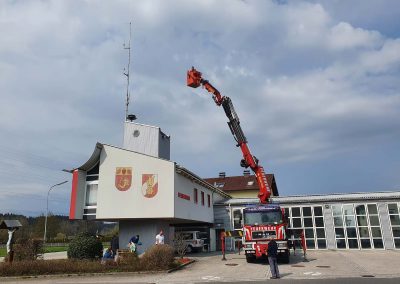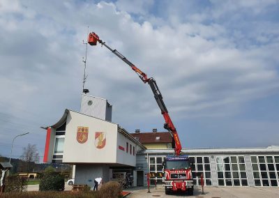 Die vorhandenen Fahrzeug- und Handfunkgeräte wurden ebenso getauscht, wie das Gerät der Florianstation. Dazu war es auch erforderlich, an der Antenne am Feuerwehrhaus Arbeiten vorzunehmen. Mit Unterstützung von RÜST Rutzenmoos wurden diese Arbeiten durchgeführt.