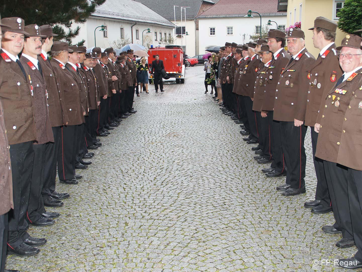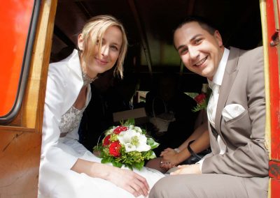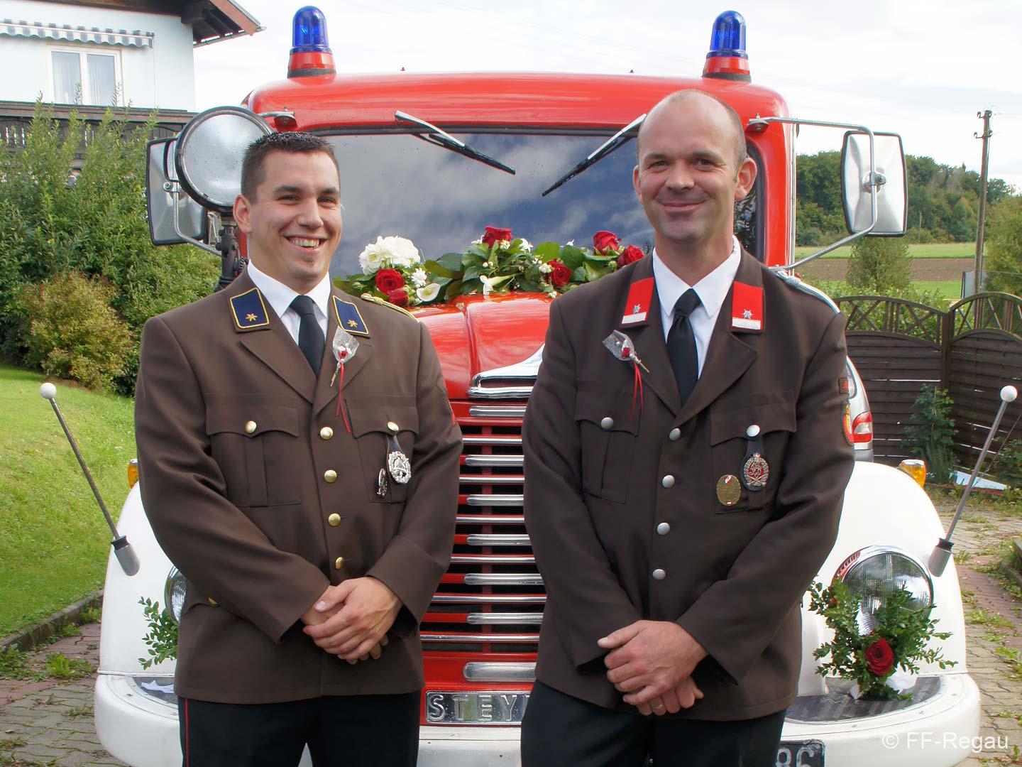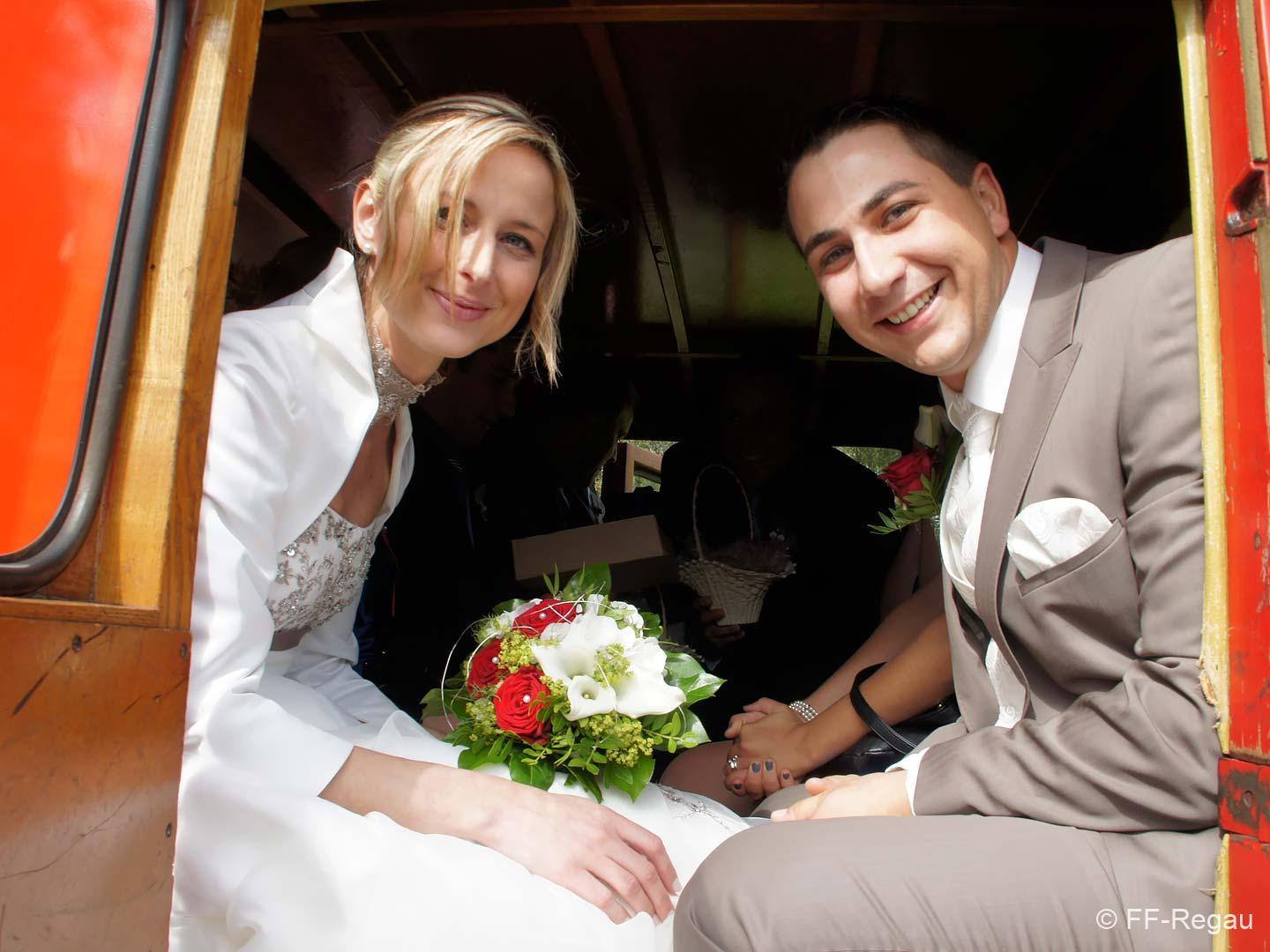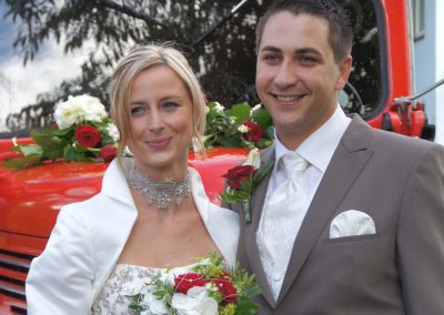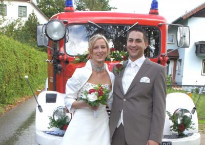 Ganz Feuerwehrmäßig war unser Brautpaar unterwegs, nämlich mit unserem altgedienten MTF, Steyr 380. Dieses „Brautauto“ sorgte natürlich für besonderes Aufsehen.