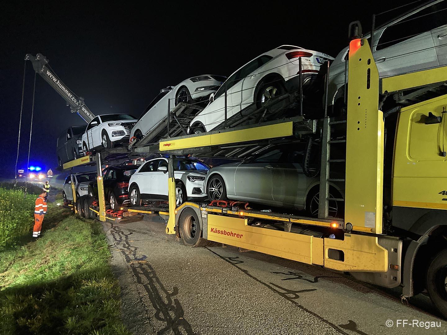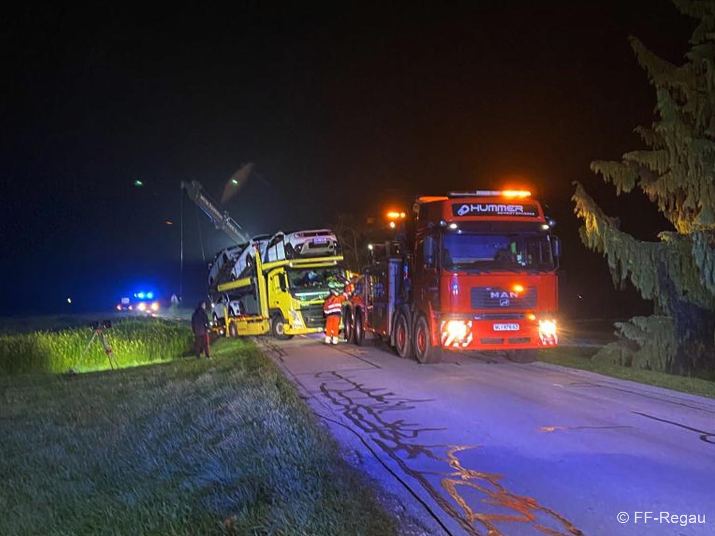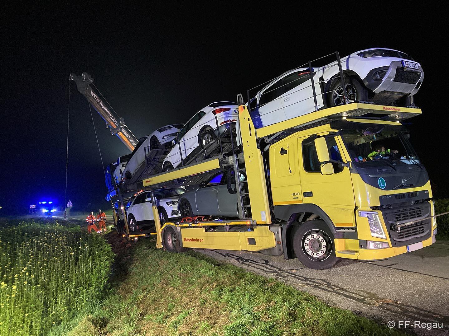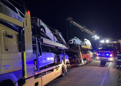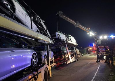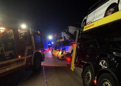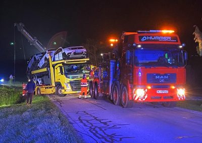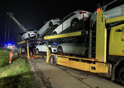 Vor Ort gab es folgende Lage: ein Autotransporter war in Preising von der Fahrbahn abgekommen, geriet über das Bankett auf die Wiese und drohte umzustürzen. Eine Bergung war mit unseren Möglichkeiten unmöglich, deswegen wurde zur Unterstützung ein konzessioniertes Bergeunternehmen angefordert.