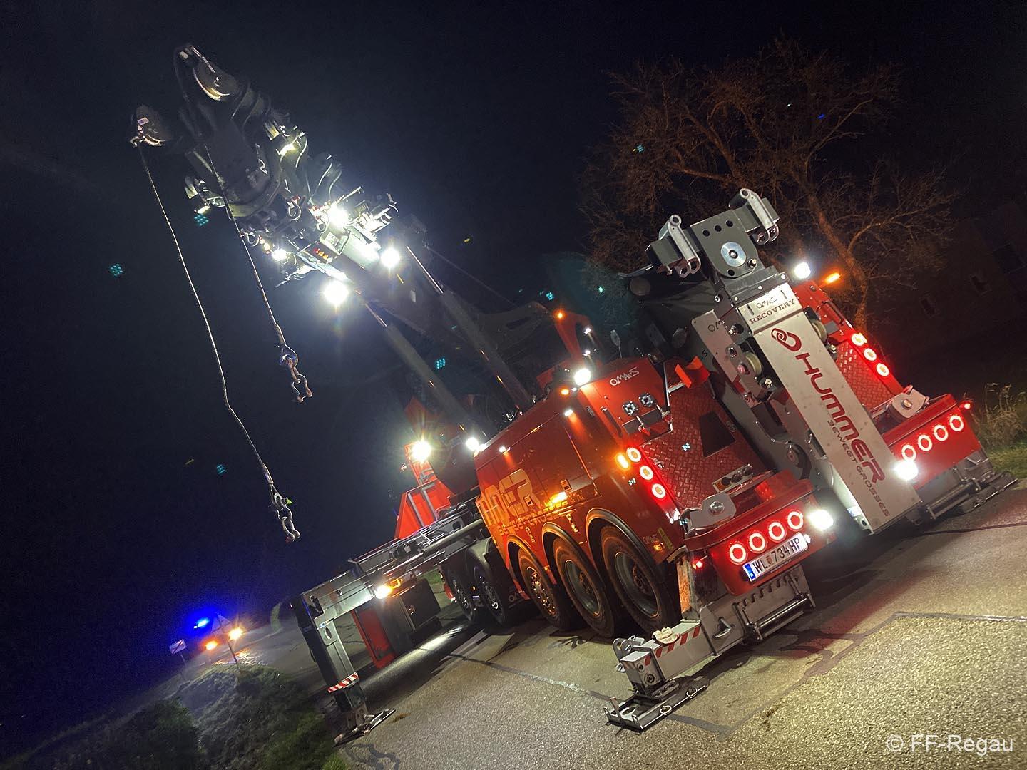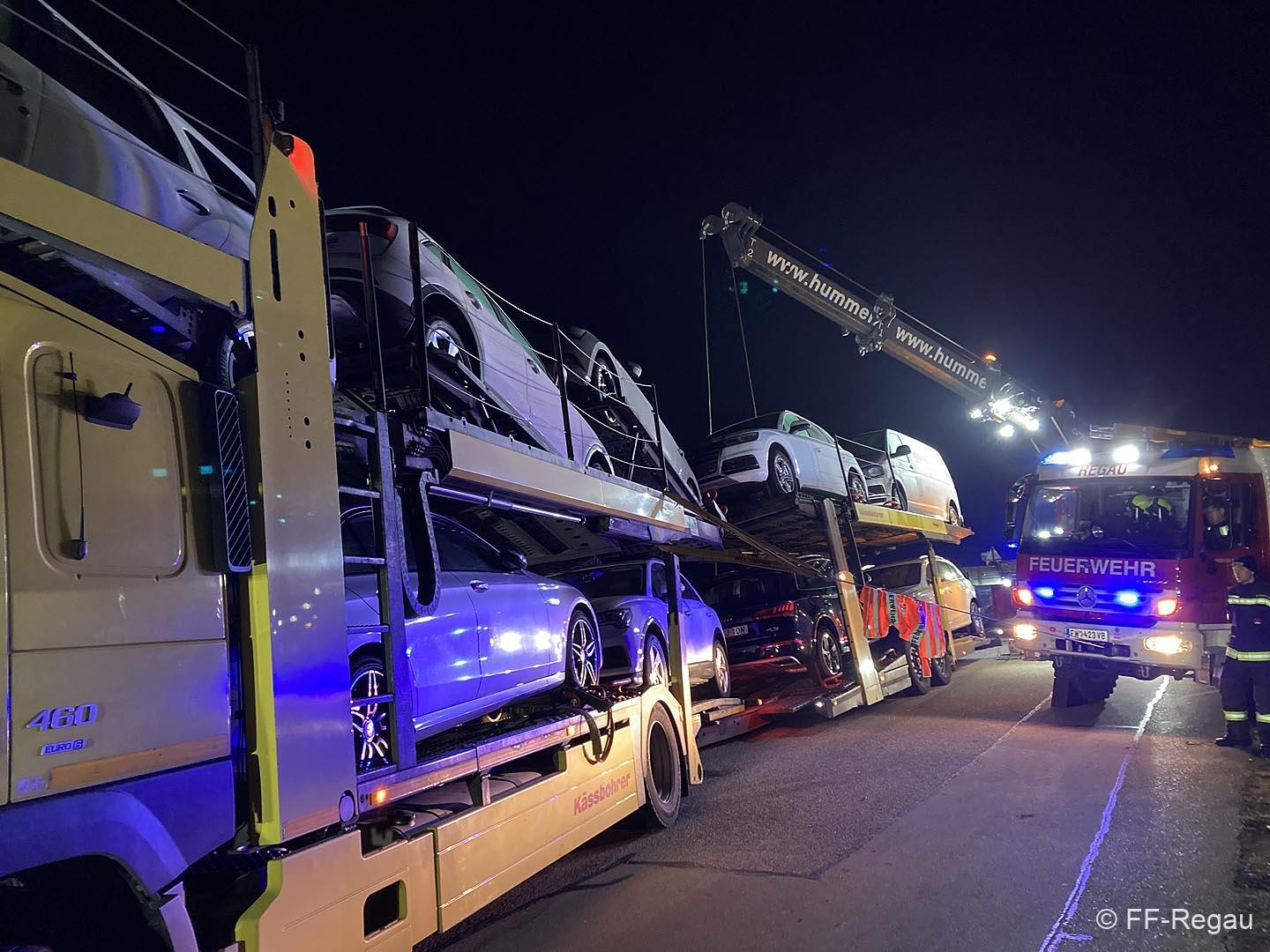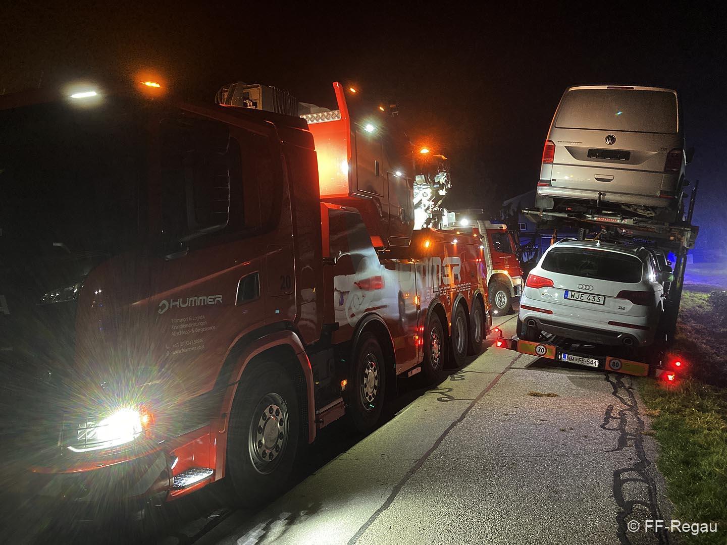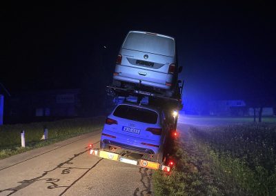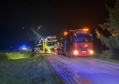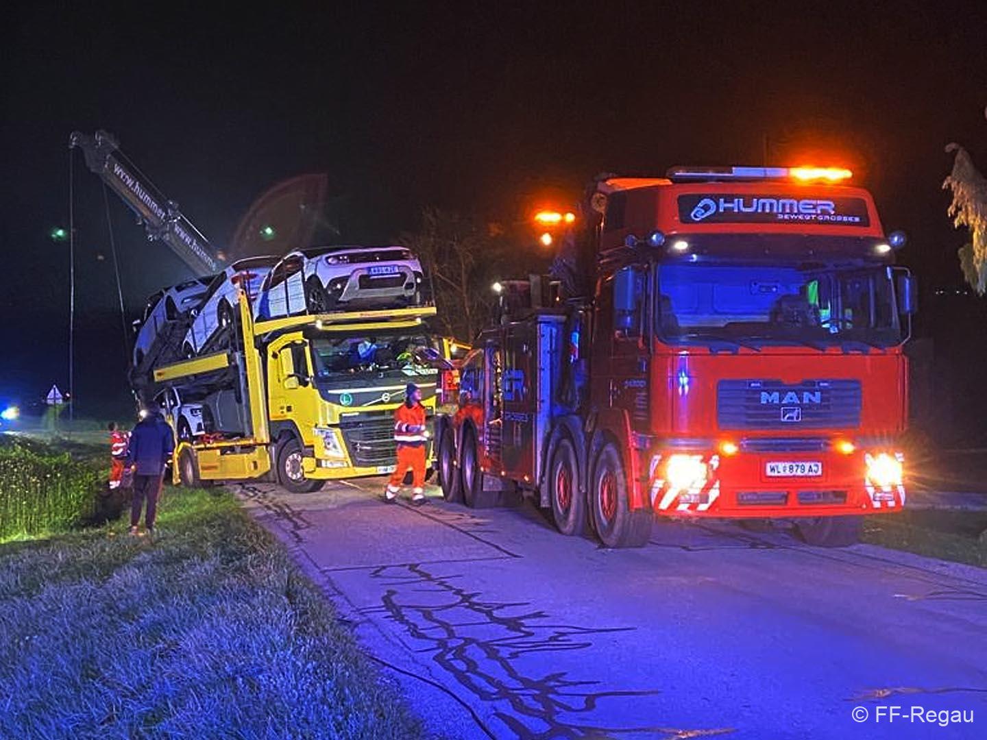 Vor Ort gab es folgende Lage: ein Autotransporter war in Preising von der Fahrbahn abgekommen, geriet über das Bankett auf die Wiese und drohte umzustürzen. Eine Bergung war mit unseren Möglichkeiten unmöglich, deswegen wurde zur Unterstützung ein konzessioniertes Bergeunternehmen angefordert.