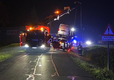 Bis zum Eintreffen des Spezialunternehmens haben wir mit der Seilwinde unseres LF-B und einem Seilzug den Transporter gesichert.