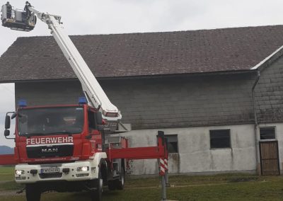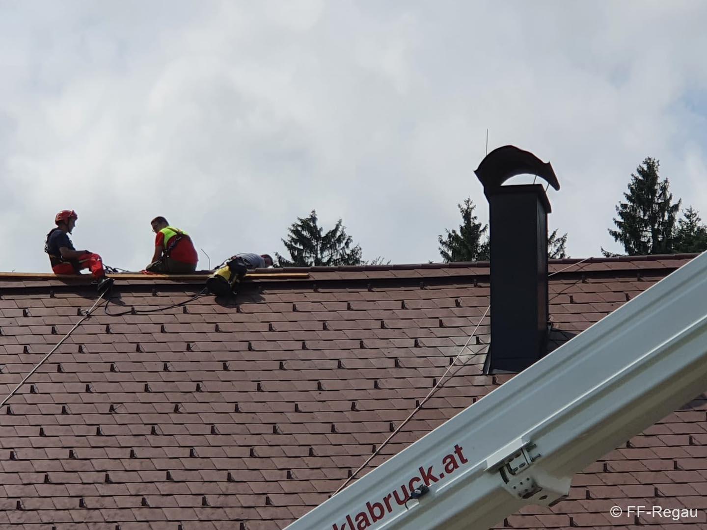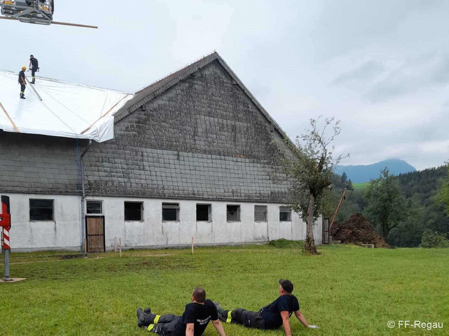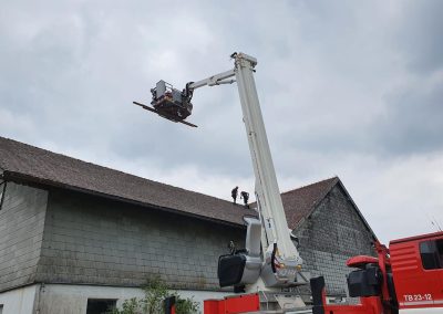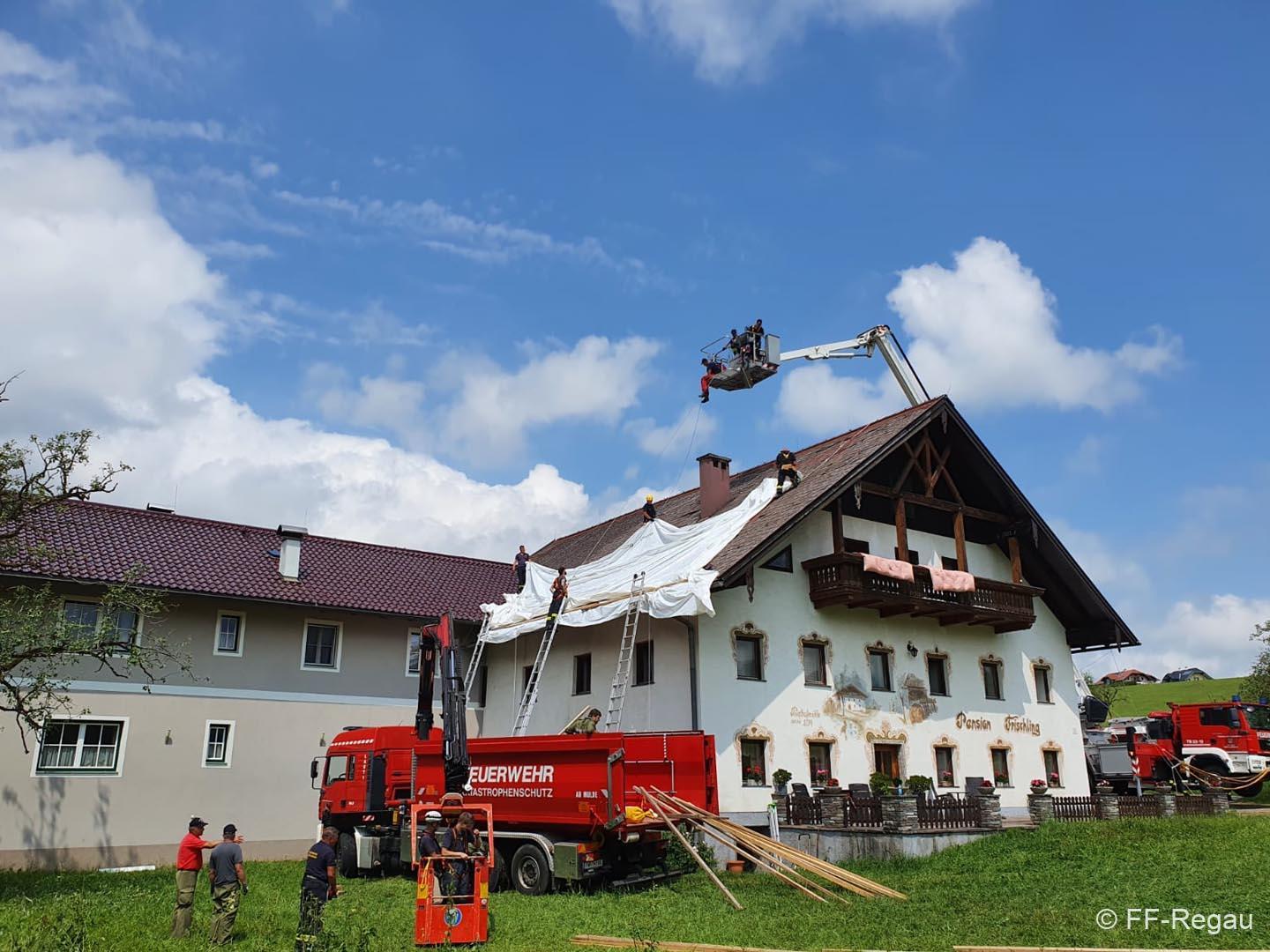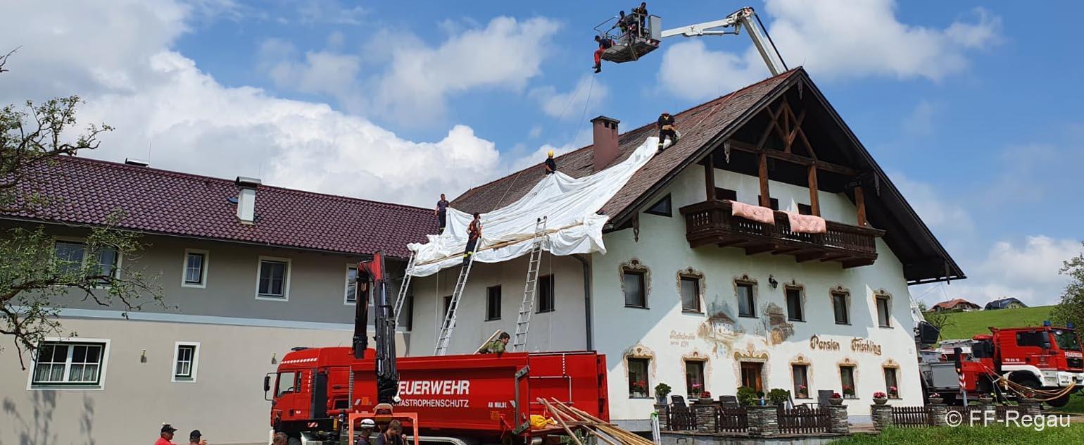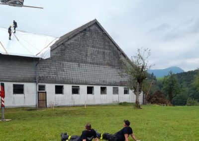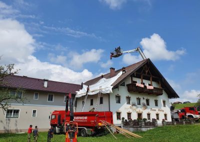 Gemeinsam mit der Mannschaft aus Vöcklabruck und anderen Wehren deckten wir einige Bauernhäuser und auch das Lagerhaus in Mondsee mit Planen ein.