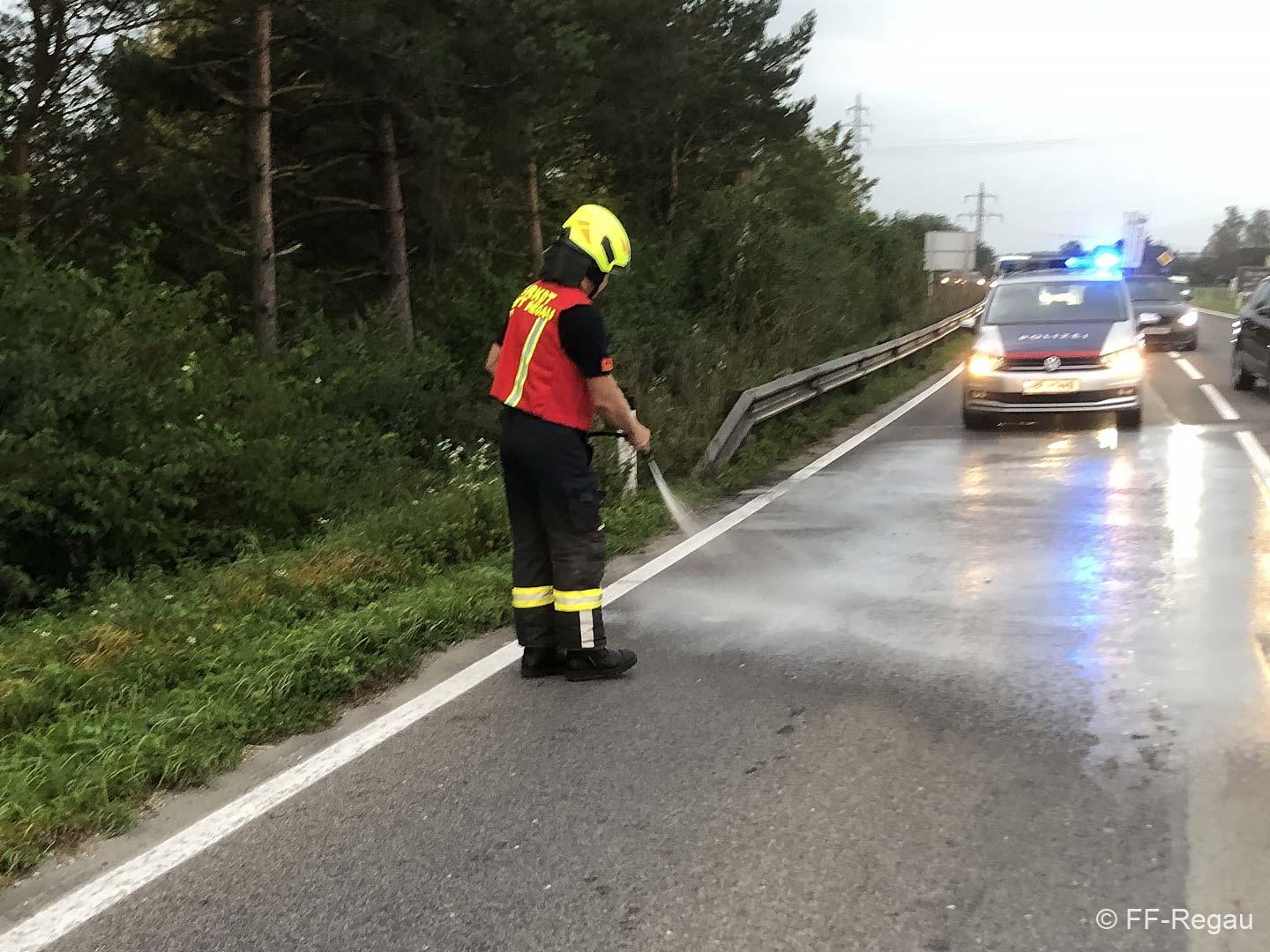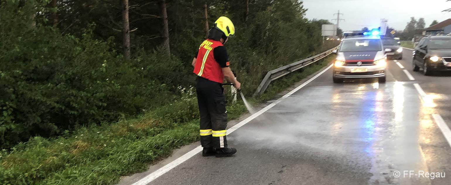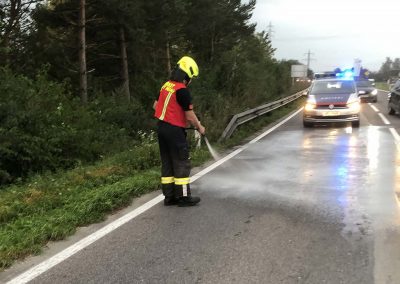 Wir reinigten die Unfallstelle von herumliegenden Teilen und banden ausgeflossene Flüssigkeiten mit Bindemittel.