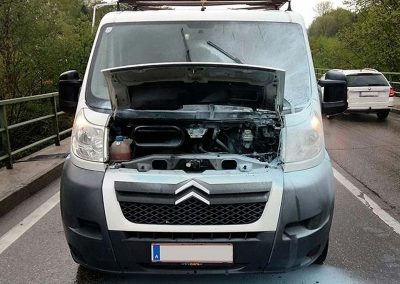 Bei einem Klein-LKW war im Motorraum Feuer ausgebrochen. Geistesgegenwärtig brachte die Lenkerin eine mitgeführte Gasflasche in Sicherheit. Ein Passant löschte mit einem Pulver-Feuerlöscher die Flammen ab und verhinderte so ein Übergreifen auf den Fahrgastraum. Wir führten die notwendigen Nachlöscharbeiten und Temperaturkontrollen durch und stellten das Fahrzeug neben der Fahrbahn zum Abtransport ab.