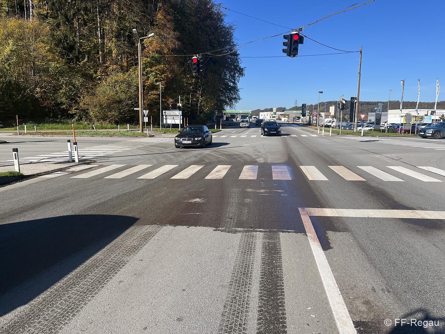 Beginnend von der Himmelreichkreuzung bis zur Firmeneinfahrt der Fa. Purea hat ein Lastwagen der TKV Regau Ladegut verloren.
